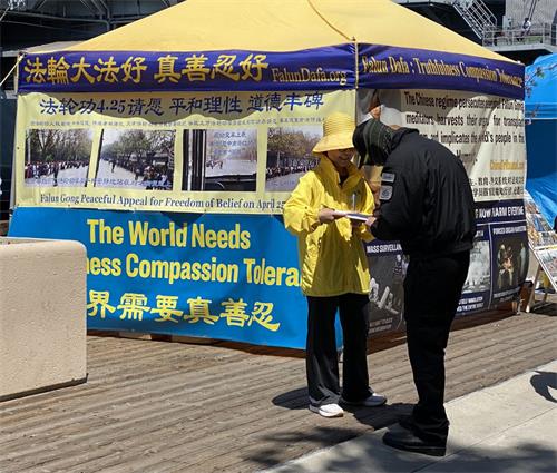 一组六、七个人看到真相点后,专门停下来,其中一个人问到,“我听说过中共强制摘取器官的事,觉得有点不可信,到底是不是真的?”学员给他们详细介绍了活摘器官的来龙去脉,法轮功是什么,为什么受到中共的打压,和中共在美国的渗透等真相,他们听明白了以后,每个人都在征签表上签了名。