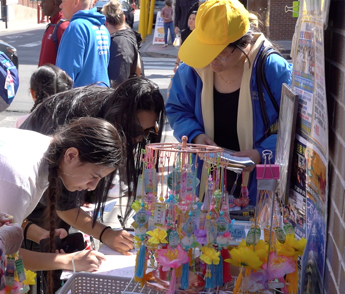 过往的路人纷纷停下来了解法轮功真相并在停止中共迫害法轮功的征签板上签名声援。