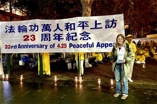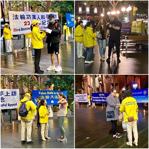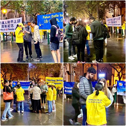 悉尼民众赞佩法轮功学员秉承“四·二五”精神,广传真相,制止迫害。有的表示:当面对极权政府时,为自己的信念发声是特别令人钦佩的事情;有民众表示:法轮功学员的祥和令中共感到恐惧;还有民众表示:在真、善、忍的普世价值彰显下,中共目前已经在世界舞台上成了人人皆知的骗子,全世界应一起抵制中共。