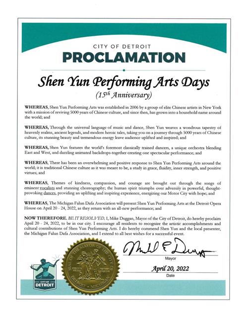 二零二二年四月二十一日至二十四日,神韵北美艺术团在汽车城底特律的五场演出也是神韵艺术团第十五年莅临底特律。为此底特律市长迈克·达根(Mike Duggan)宣布二零二二年四月二十日至二十四为底特律市神韵日,他特别鼓励“所有居民去欣赏神韵的艺术成就和文化贡献”,因为正如他在给神韵艺术团的褒奖中写到的:“神韵舞蹈发人深省,启迪着人们的心灵。演出告诉人们只要保持正信,就能战胜逆境。她为我们汽车城带来了活力和希望。”