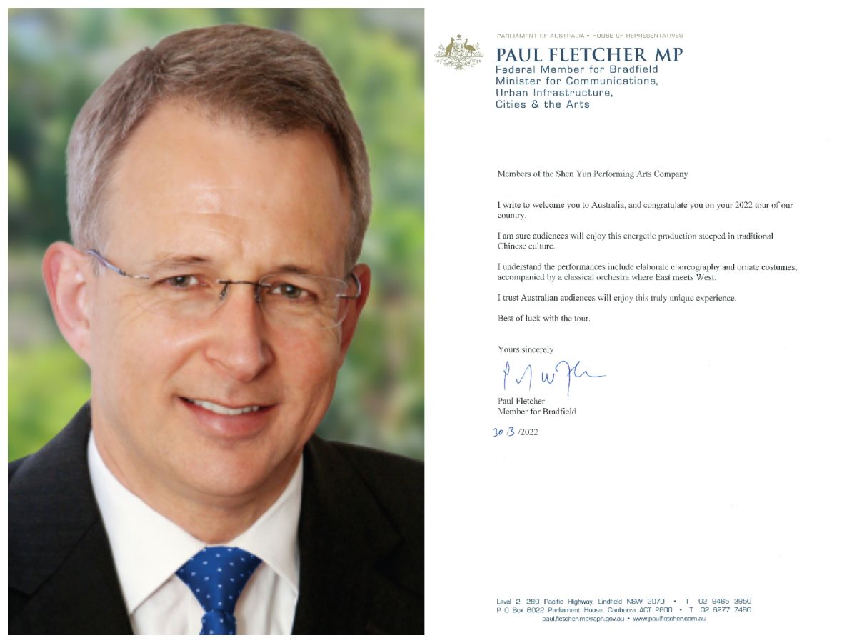 在神韵国际艺术团在澳大利亚墨尔本演出前,澳洲通讯及艺术部长、联邦议员保罗·弗莱彻(Paul Fletcher)先生和墨尔本白马市市长刘昱婷(Tina Liu)女士也和其他政要一样为神韵艺术团发来贺信。