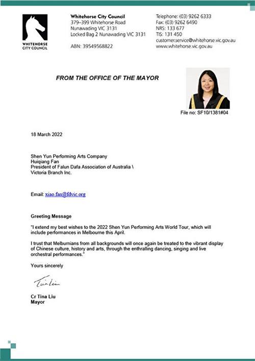 ![]() 图10:二零二二年四月二十二日起,神韵国际艺术团为澳大利亚墨尔本观众带来七场精彩演出。澳洲墨尔本白马市市长刘昱婷(Tina Liu)发贺信,欢迎并祝福神韵艺术团的演出。 |