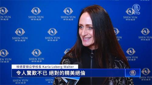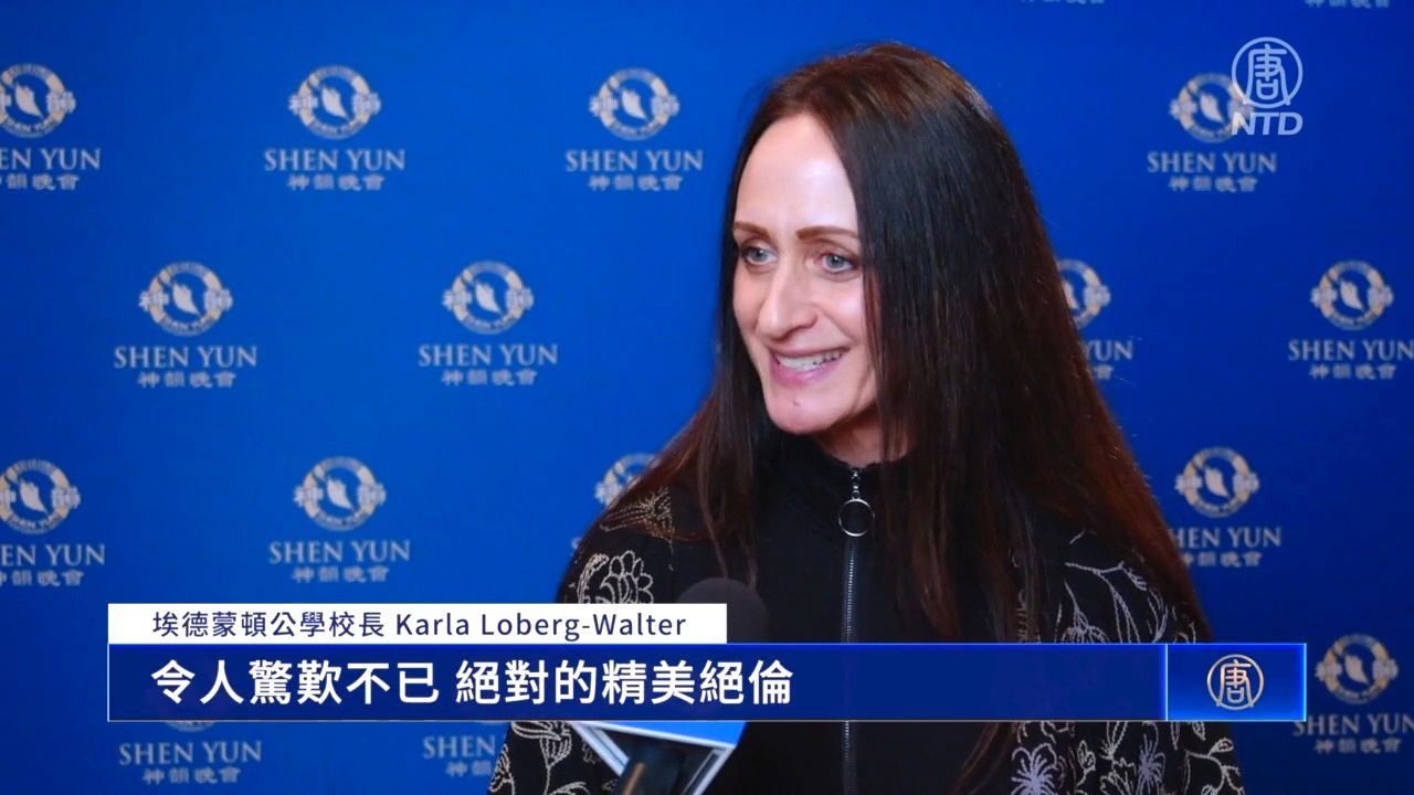 卡拉·罗伯格-沃尔特(Karla Loberg-Walter)是加拿大埃德蒙顿市一所公立学校校长。四月二十四日下午,看完神韵巡回艺术团在埃德蒙顿的演出后,她对神韵演出赞不绝口:“演出绝对宏伟壮丽。编舞很美,服装精致,颜色流光溢彩,舞蹈当然也是无可挑剔的,伴奏的音乐家们都非常棒。所以我非常感恩能以这样一种方式了解文化,帮助我们了解一个国家的美,一个许多人都无法访问的国家。”