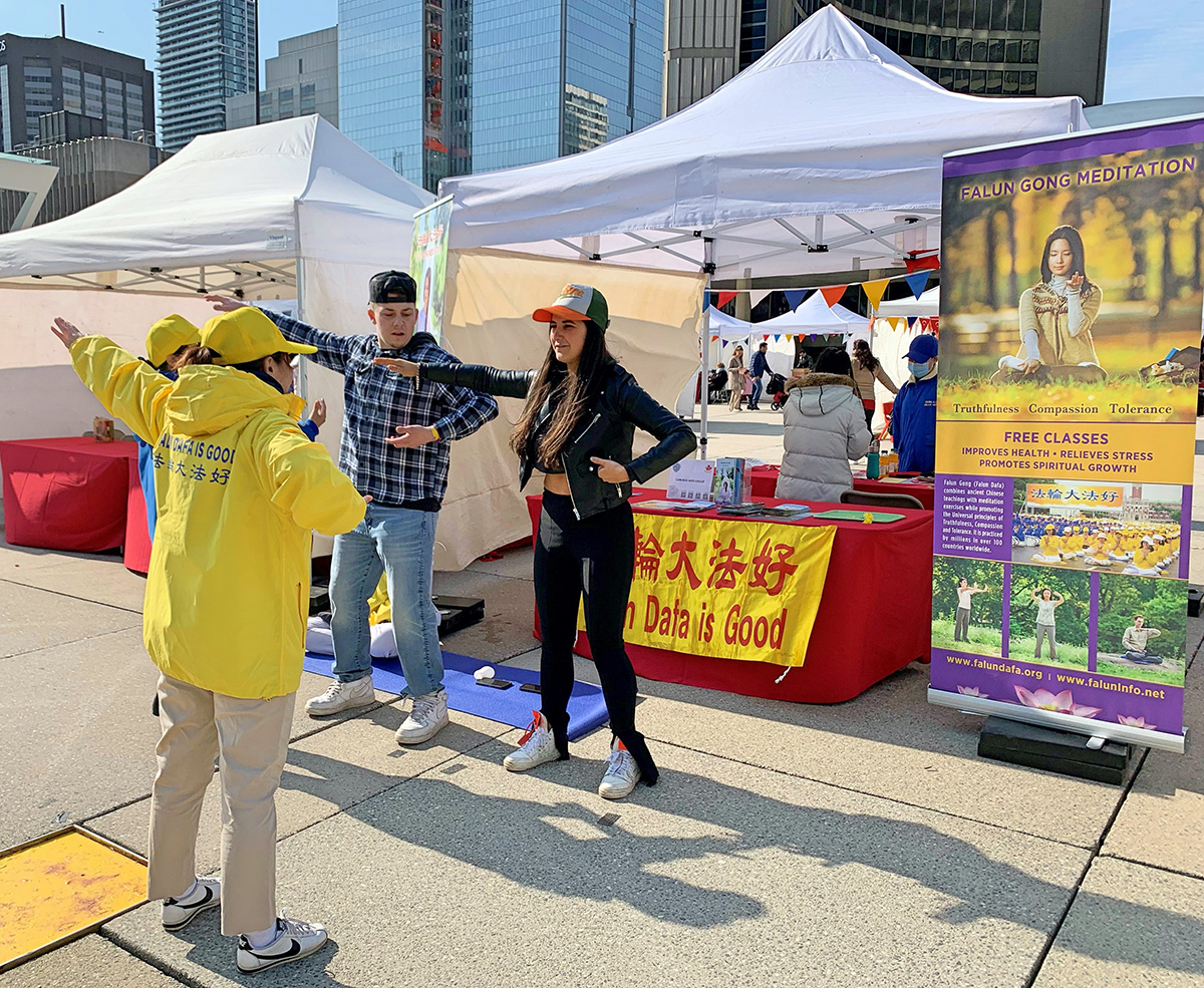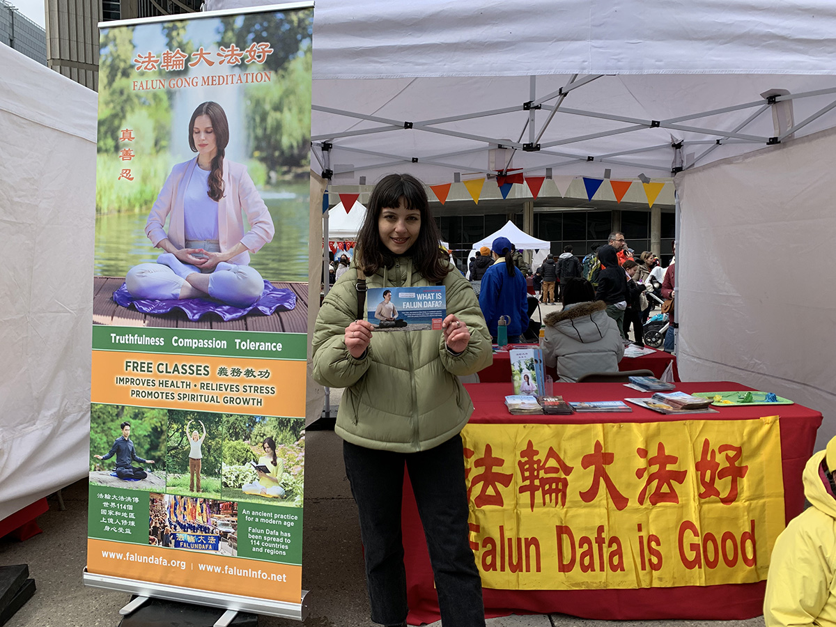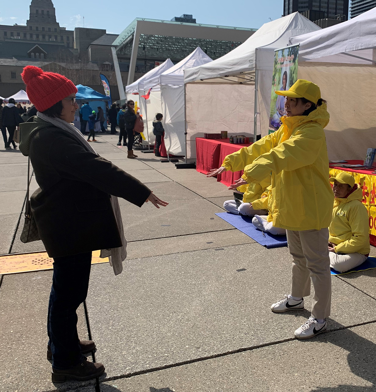 现居多伦多从事媒体工作的土耳其女士伊尔玛珂(Irmak),被法轮功展位上学员功法演示所吸引而拍照。她说:“我是做瑜伽锻炼的,我觉得可以帮助我放松身心。在看到法轮功学员的功法展示后,觉得非常好,不禁被他们吸引。”在听完学员对功法的介绍后,她一再表示回去后一定会去学炼。