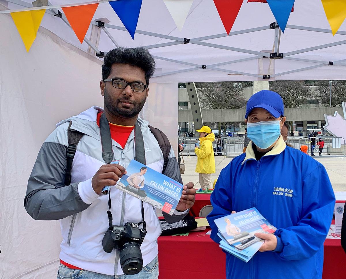 果理(Gory)来自斯里兰卡,当他看了法轮功学员在舞台上的功法演示后,来到了法轮功的展位。学员又向他详细介绍了功法,“非常感谢!我要去免费教功及法轮大法网站,进一步去了解和学习。”他说。