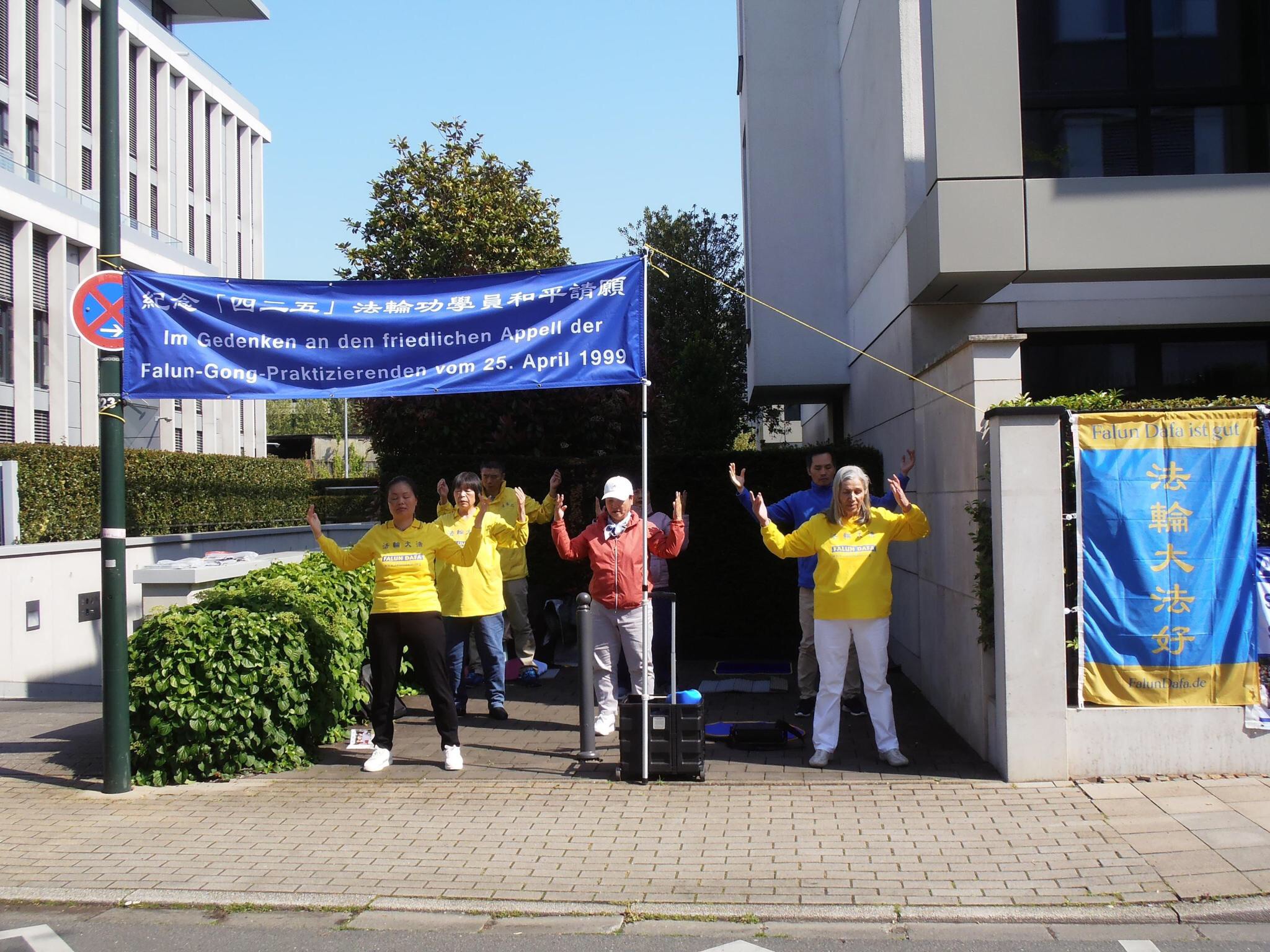 ![]() 图1:二零二二年四月二十七日上午,德国杜塞尔多夫及周边地区学员在中领馆前炼功,纪念“四·二五”和平上访二十三周年。 |