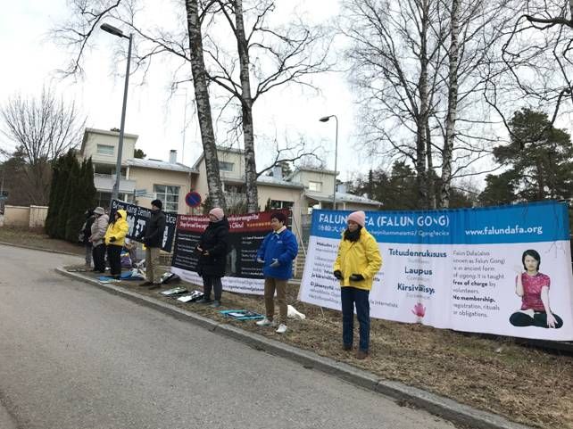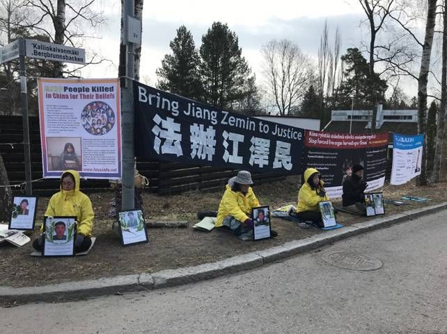 图1~2:二零二二年四月二十五日早上九点,芬兰法轮功学员来到首都赫尔辛基中领馆前和平抗议,纪念“四·二五”二十三周年,呼吁制止迫害,法办迫害元凶江泽民。 |