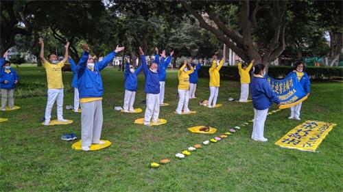 图3~4:二零二二年四月二十三日下午,秘鲁法轮功学员在位于圣伊西德罗区(San Isidro )中共驻秘鲁大使馆前的阿方索-乌加特公园(El Parque Alfonso Ugarte )集体炼功,现场气氛庄严而祥和,吸引路人驻足观看。 |