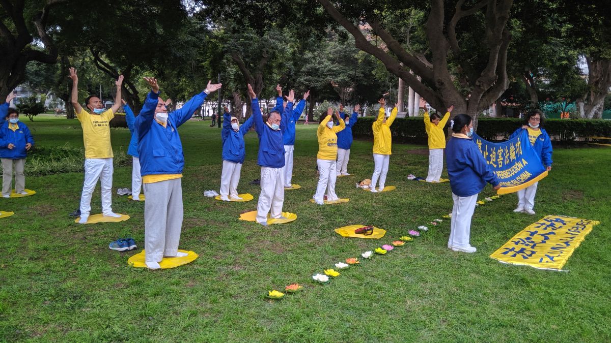 二零二二年四月二十三日下午,秘鲁法轮功学员在首都利马中使馆前集体炼功,并举行烛光悼念活动,纪念万名法轮功学员二十三年前在北京的“四·二五”和平上访。