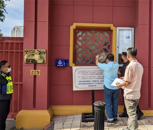 ![]() 图1:二零二二年四月二十四日,马来西亚部份法轮功学员在中领馆附近集会,并在集会现场以中文以及马来文宣读文告。 |