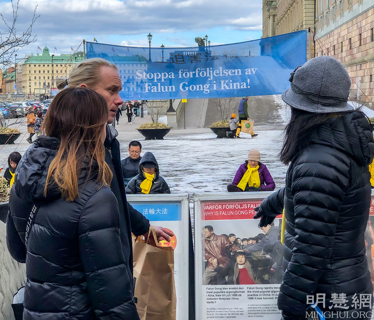 三月一个周六的下午,瑞典人马库斯(Marcus)紧锁着眉头,站在活动场地前仔细阅读了所有真相展板上的信息后,走上前和学员交谈,他说他特别想了解有关法轮功的信息,以及法轮功学员无辜遭受中共迫害的详情。