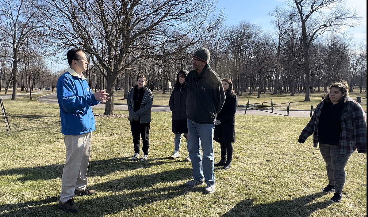 ![]() 图1:来自罗彻斯特大学(Rochester University)的学生们观摩法轮功学员的集体晨炼 |