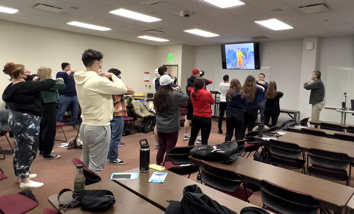 ![]() 图7:二月二十二日,法轮功学员在课堂上教学生们动功。右一为休伊教授 |