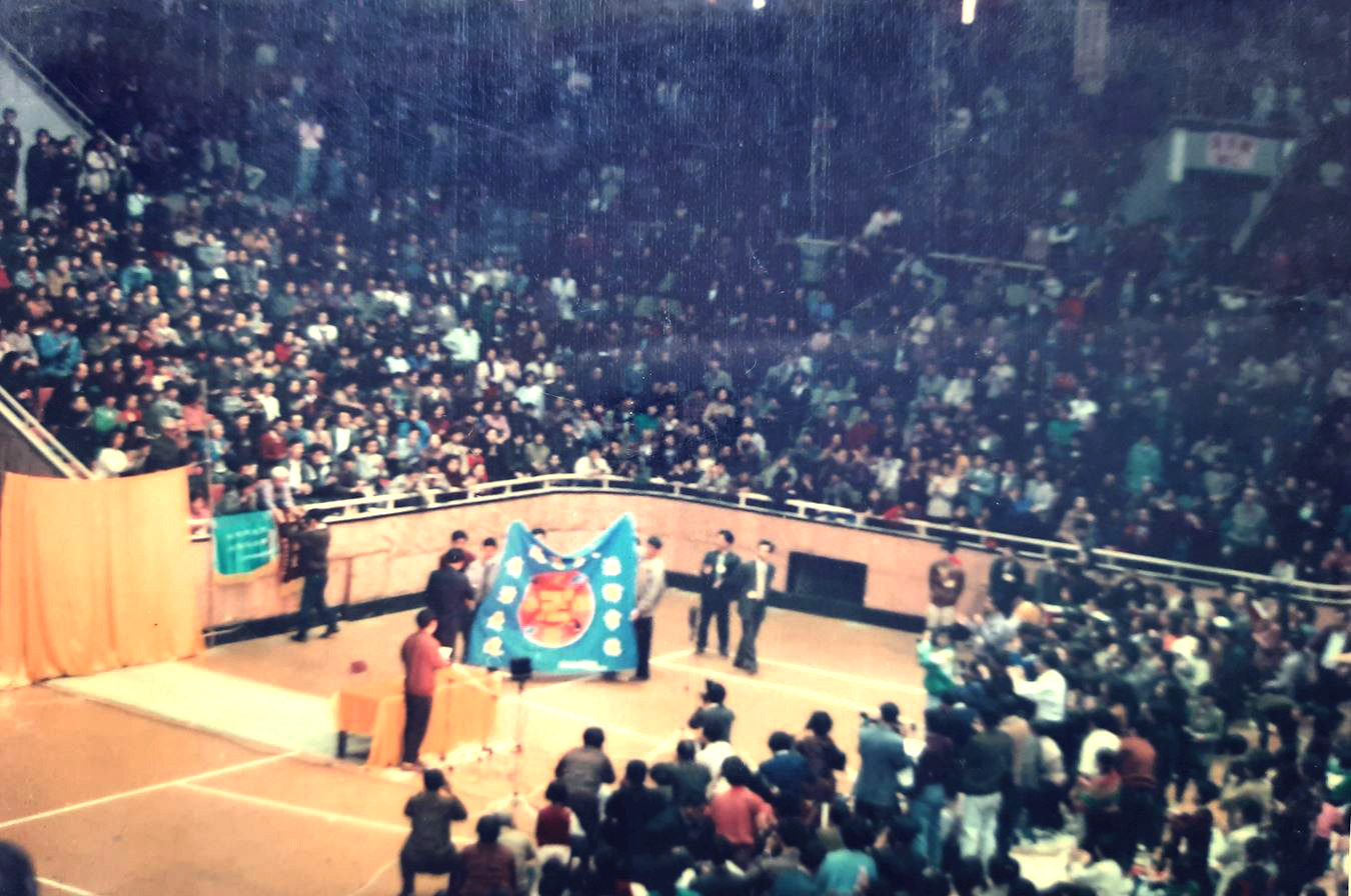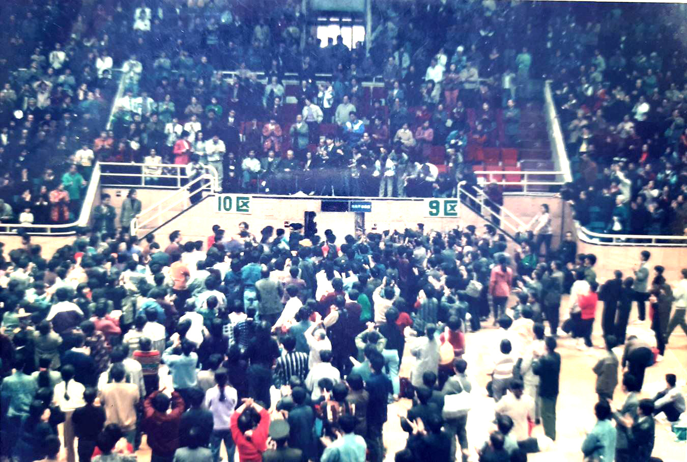 广州第五期传法班也是师父在国内最后一期的面授班,在广州体育馆举办,有五千多位从全国各地赶来的学员参加了这一期的学习班,体育馆四周围的座位都坐得满满的,由于人太多,坐不下,有许多学员坐在体育馆中间的空地上。因为受场地的限制,还有许多学员报不了名,進不了班,师父在体育馆里上第一堂课的时候,有许多進不了班的学员不愿离去,在体育馆外的空地上静静的炼功,当时在现场可以感受到众生渴望得法的感人气氛。师父知道后,专门安排工作人员找了录像播放设备,在场外为進不了班的学员做了现场直播。
