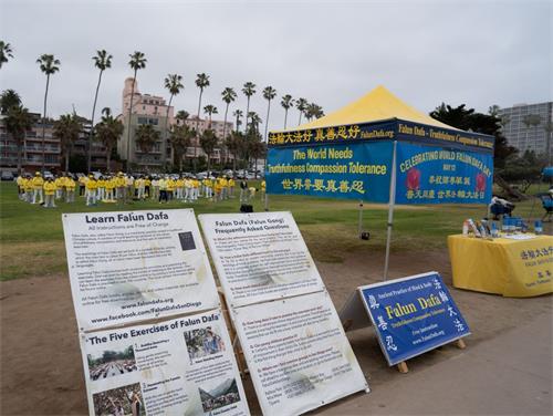 学员们集体炼功的祥和场面,伴着悠扬的炼功音乐,和深沉的海浪声,吸引着过路的人们驻足静观,阅读介绍大法的展板,有些主动拿走大法传单,或与学员攀谈。不少人站在五幅描述法轮功学员故事的“真、善、忍美展”的画作,用心品味。