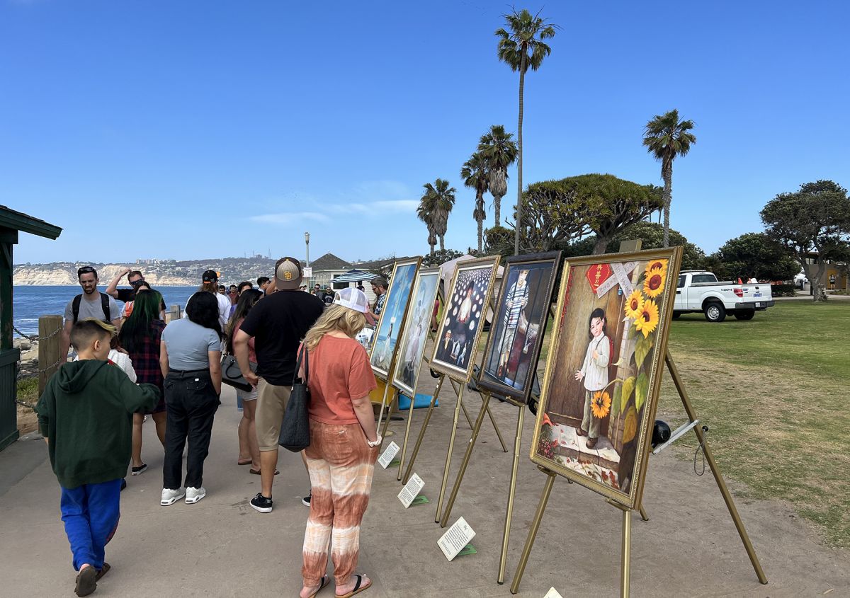 ![]() 图4:二零二二年五月七日,圣地亚哥学员在拉荷雅(La Jolla)海边洪法讲真相,“真善忍美展”的画作吸引游人驻足观看。 |