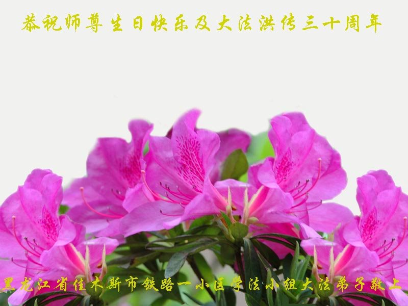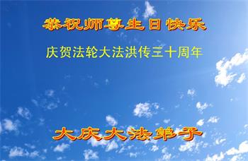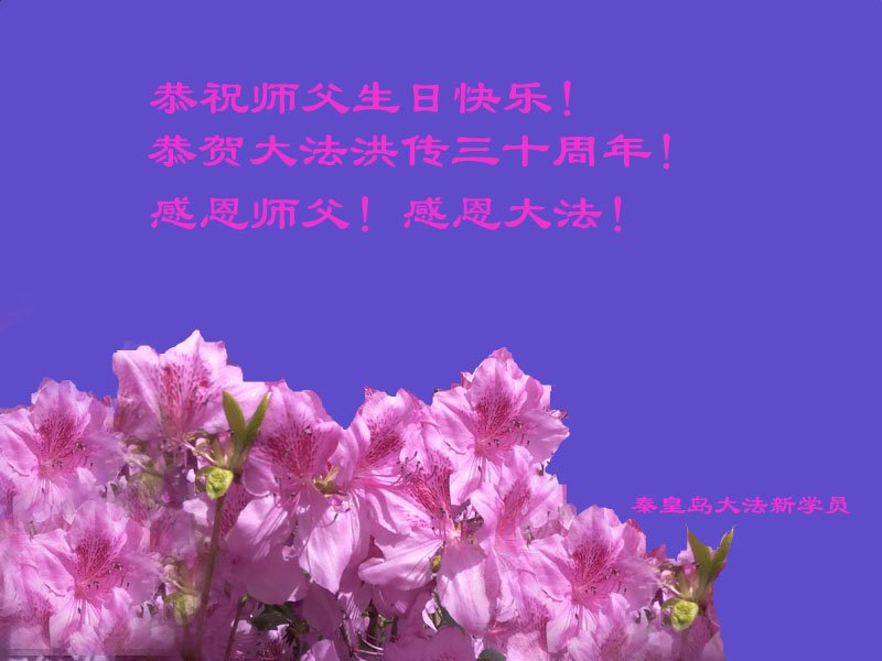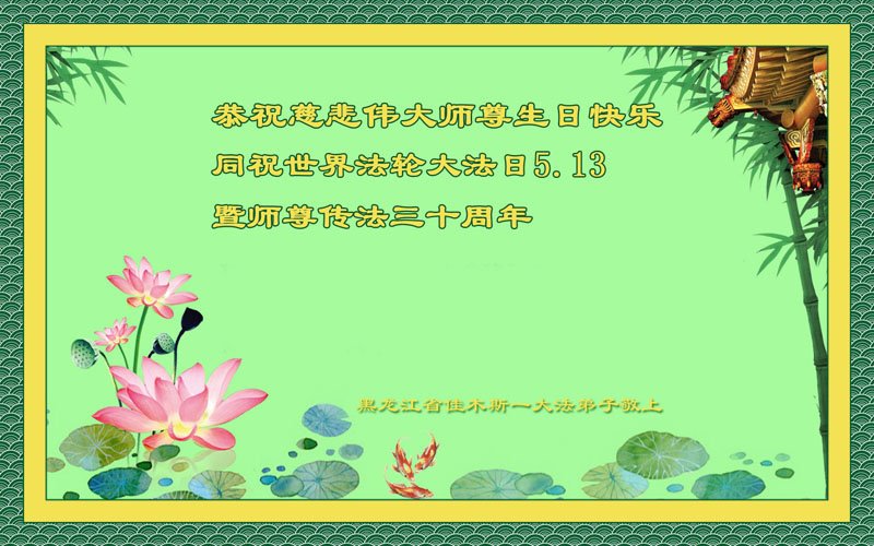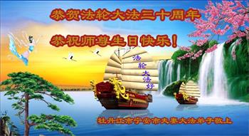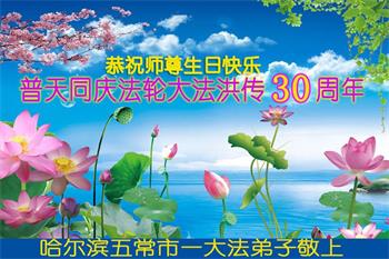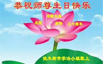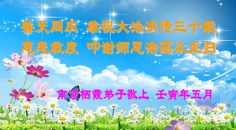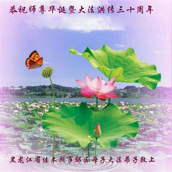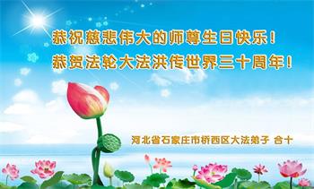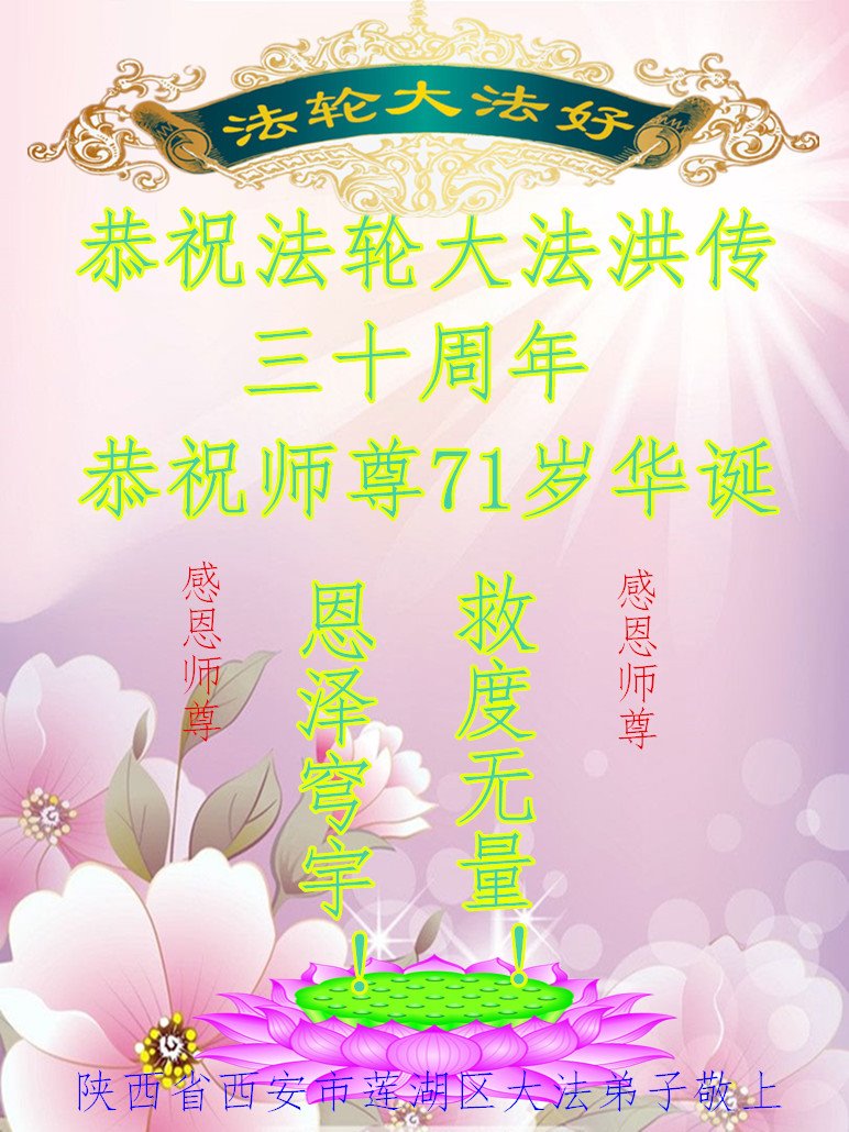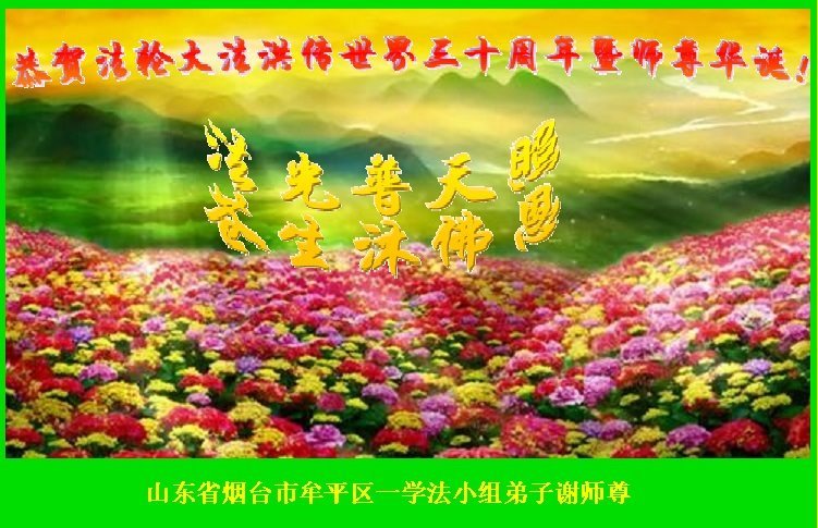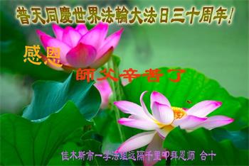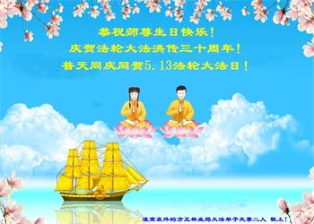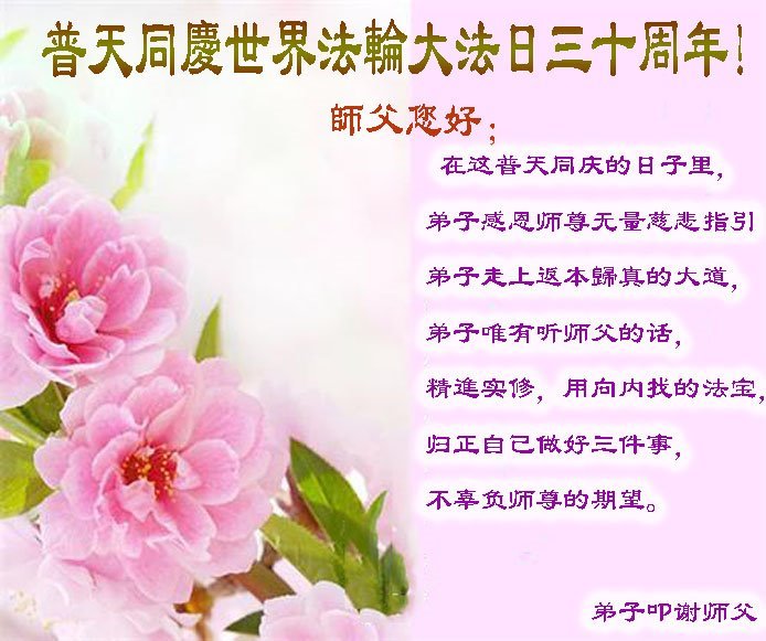 在这普天同庆大法洪传三十周年的大好日子里,我们大法弟子发出共同心声:师尊您辛苦了!谢谢师尊!每个大法弟子在您的保护下倍感幸福。您把这千载万载难逢的宇宙大法传给天上人间,救度一切众生,能够得到大法的救度真的是万幸中万幸。弟子无以回报,只有按照您教的“真、善、忍”的法理严格要求自己,时时向内找修正自己,完成史前大愿,圆满随师还。期盼着师尊早日回到家乡来与弟子团聚一堂!弟子法缘敬上!