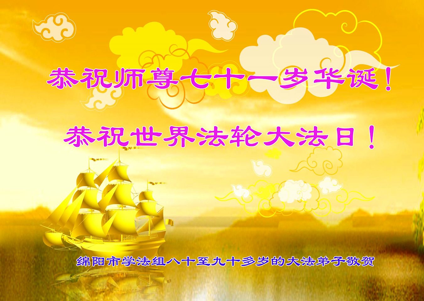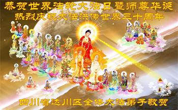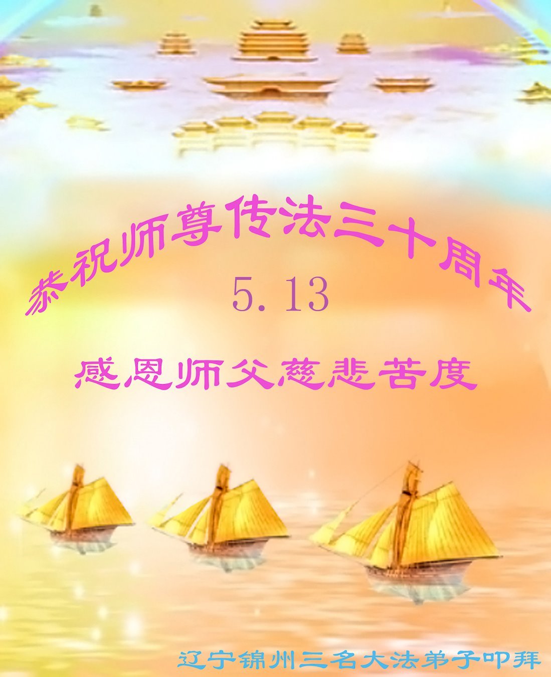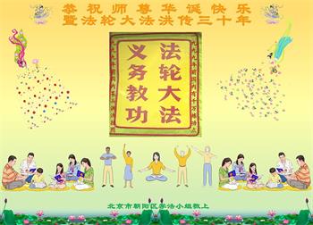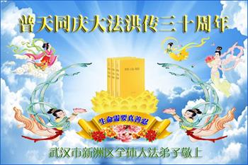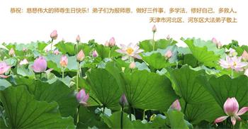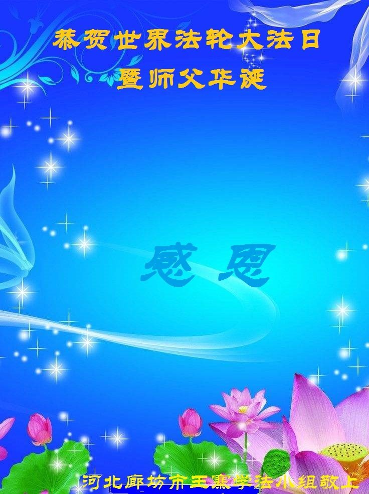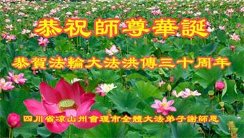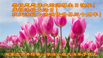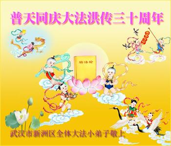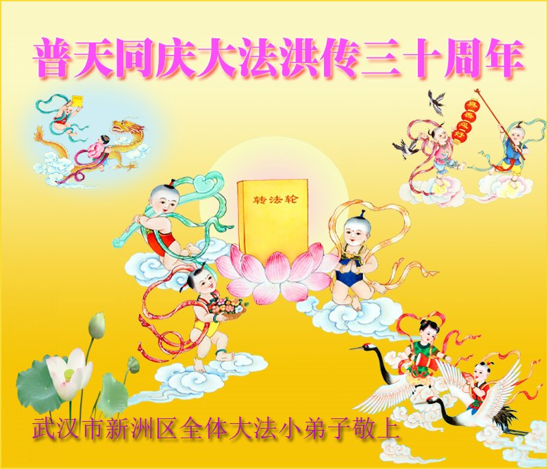 在这普天同庆大法洪传三十周年的大好日子里,我们大法弟子发出共同心声:师尊您辛苦了!谢谢师尊!每个大法弟子在您的保护下倍感幸福。您把这千载万载难逢的宇宙大法传给天上人间,救度一切众生,能够得到大法的救度真的是万幸中万幸。弟子无以回报,只有按照您教的“真、善、忍”的法理严格要求自己,时时向内找修正自己,完成史前大愿,圆满随师还。期盼着师尊早日回到家乡来与弟子团聚一堂!弟子法缘敬上!