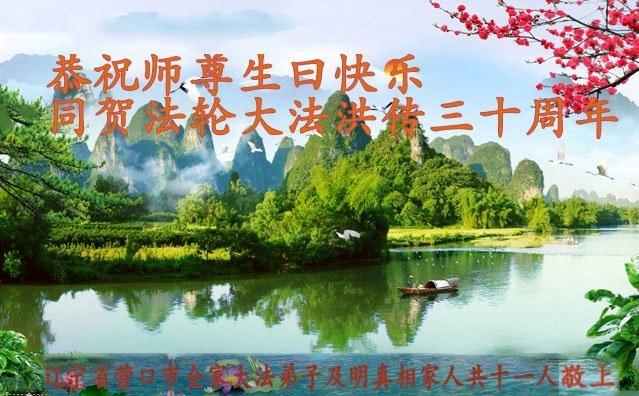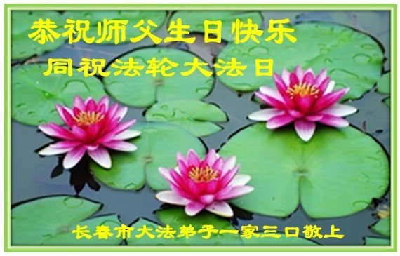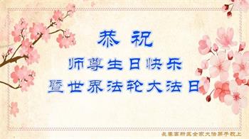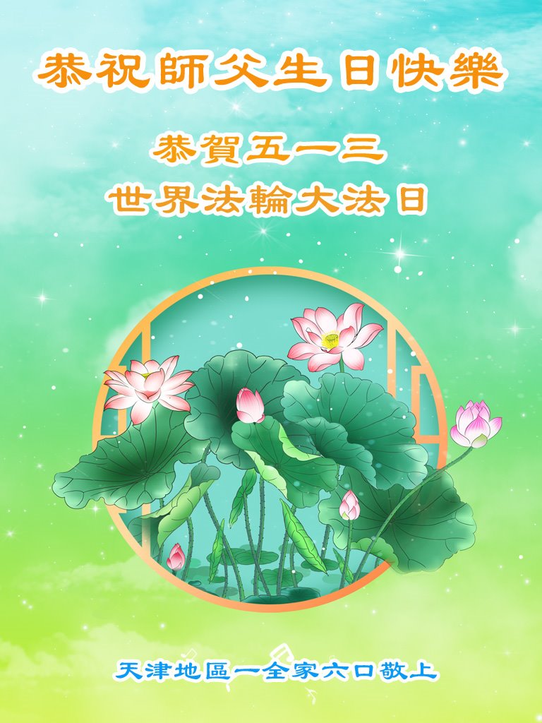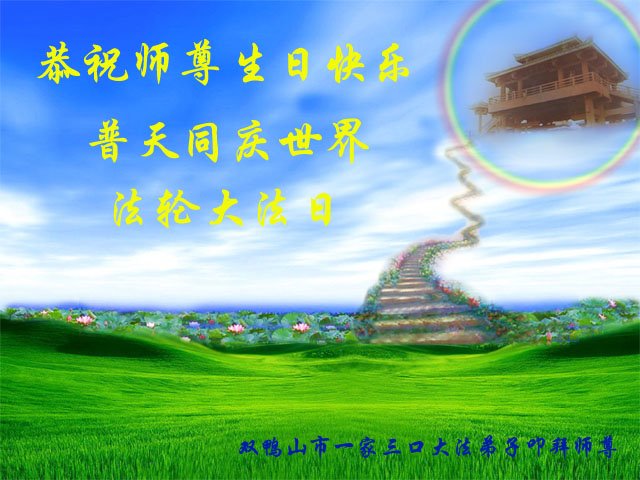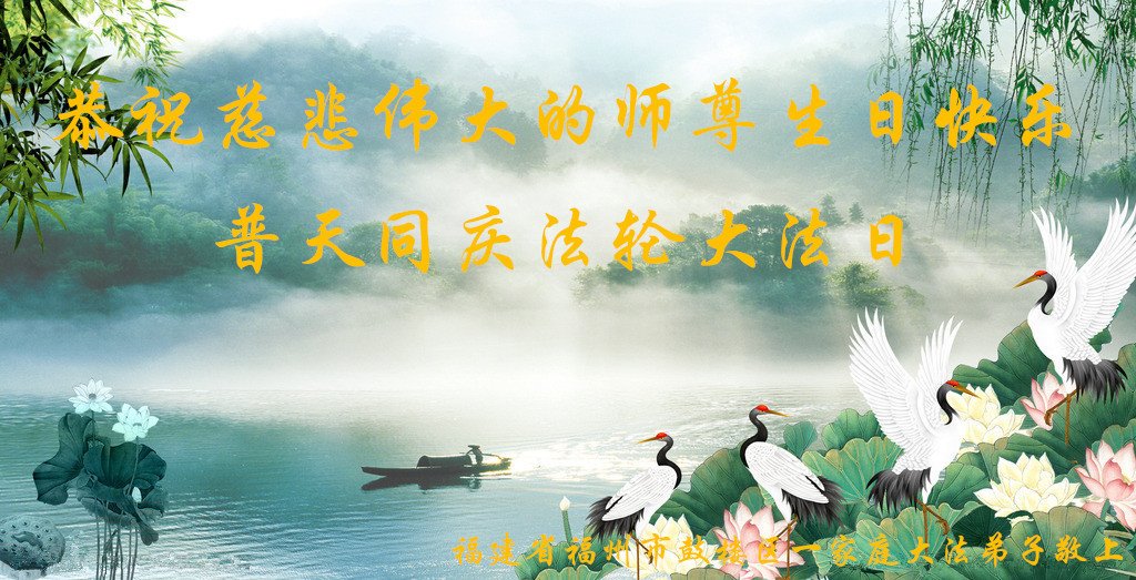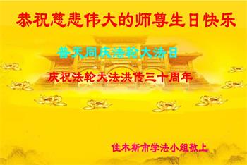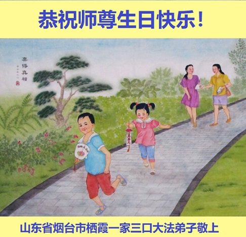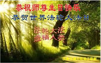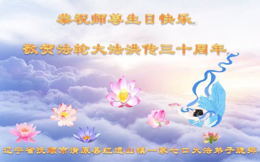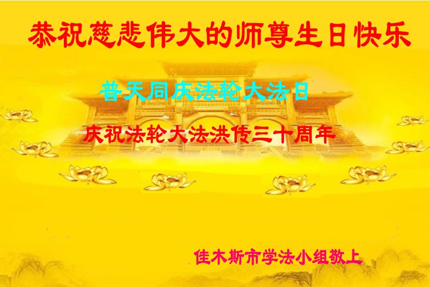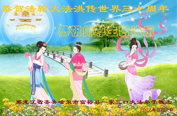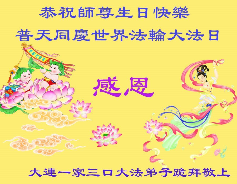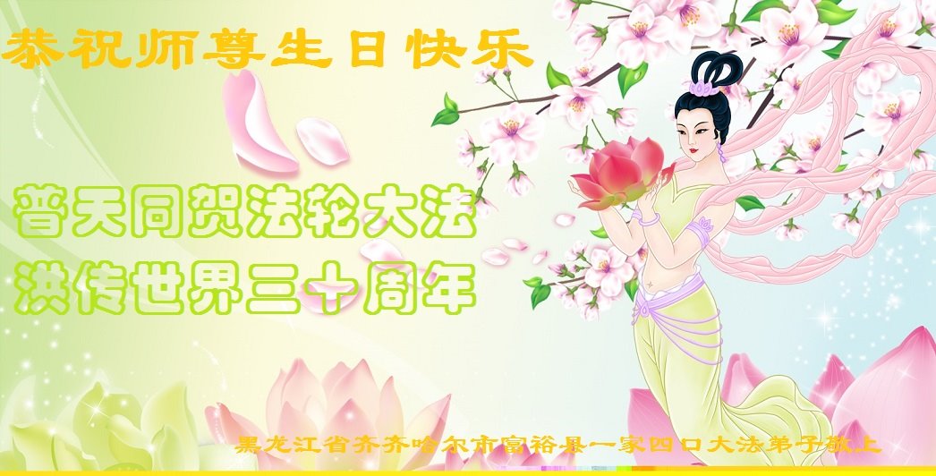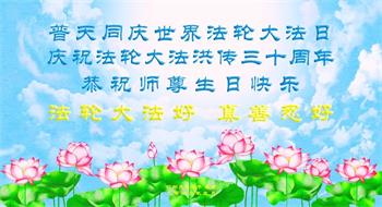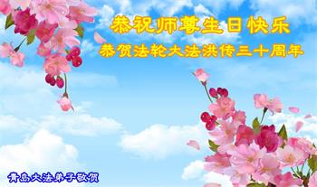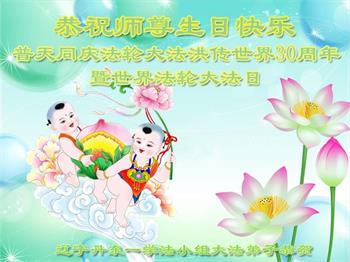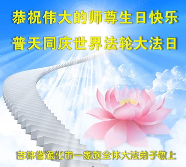 值此世界法轮大法日、法轮大法洪传三十周年、师尊华诞这普天同庆震撼寰宇最伟大而殊胜的日子里,大法弟子全家恭祝慈悲伟大的师尊生日快乐!感恩师尊慈悲救度!师尊辛苦了!弟子叩拜师尊!