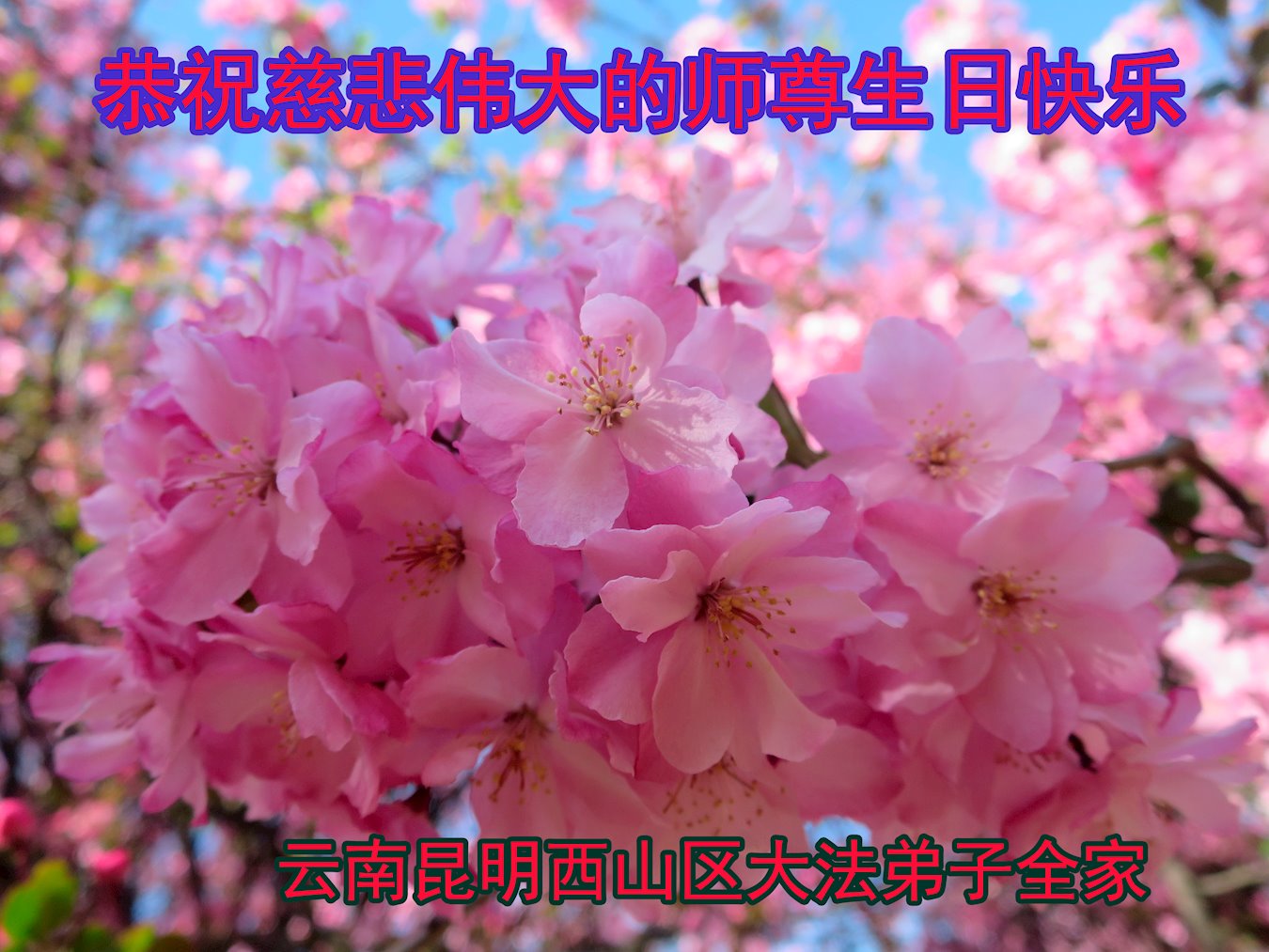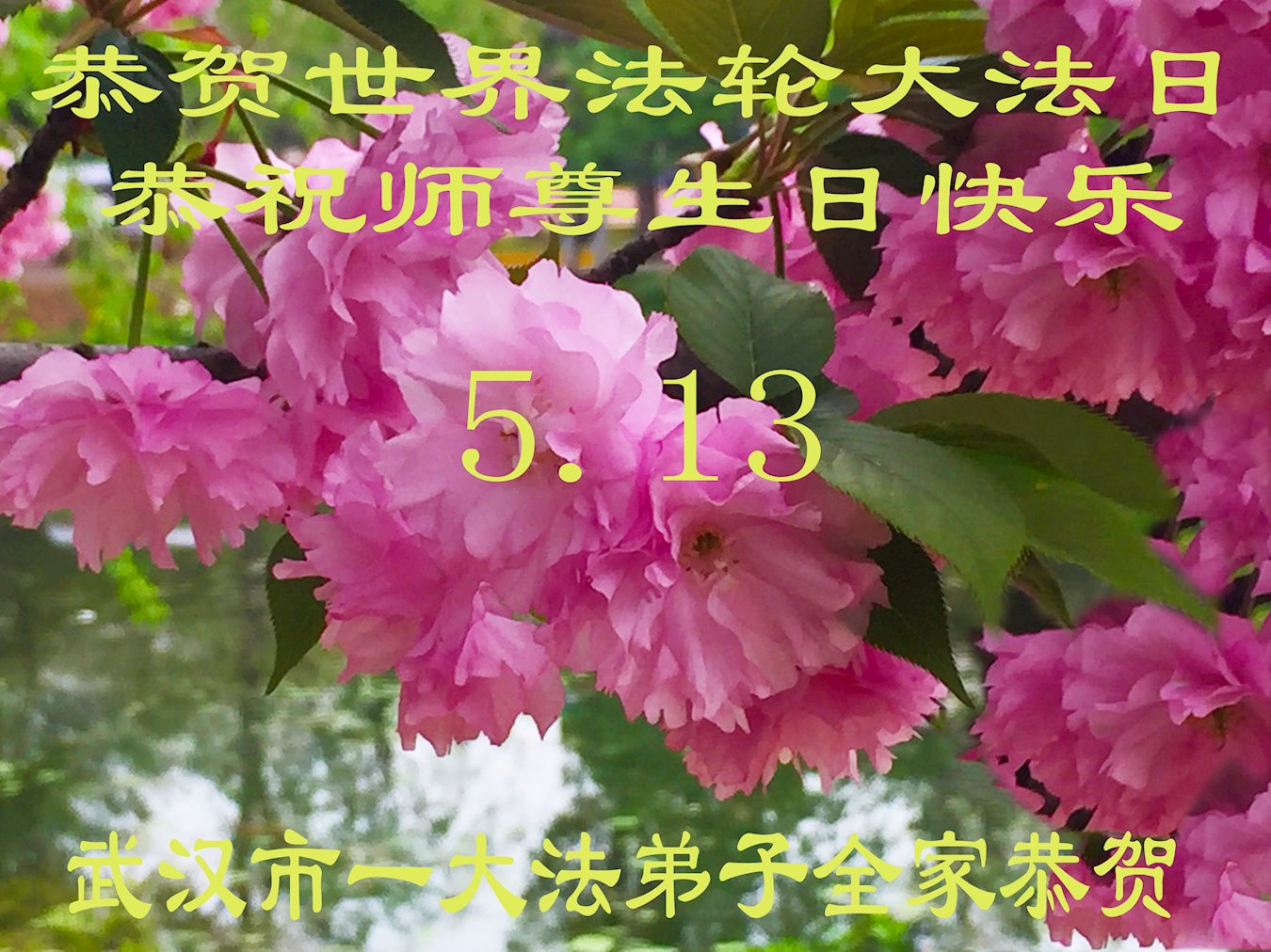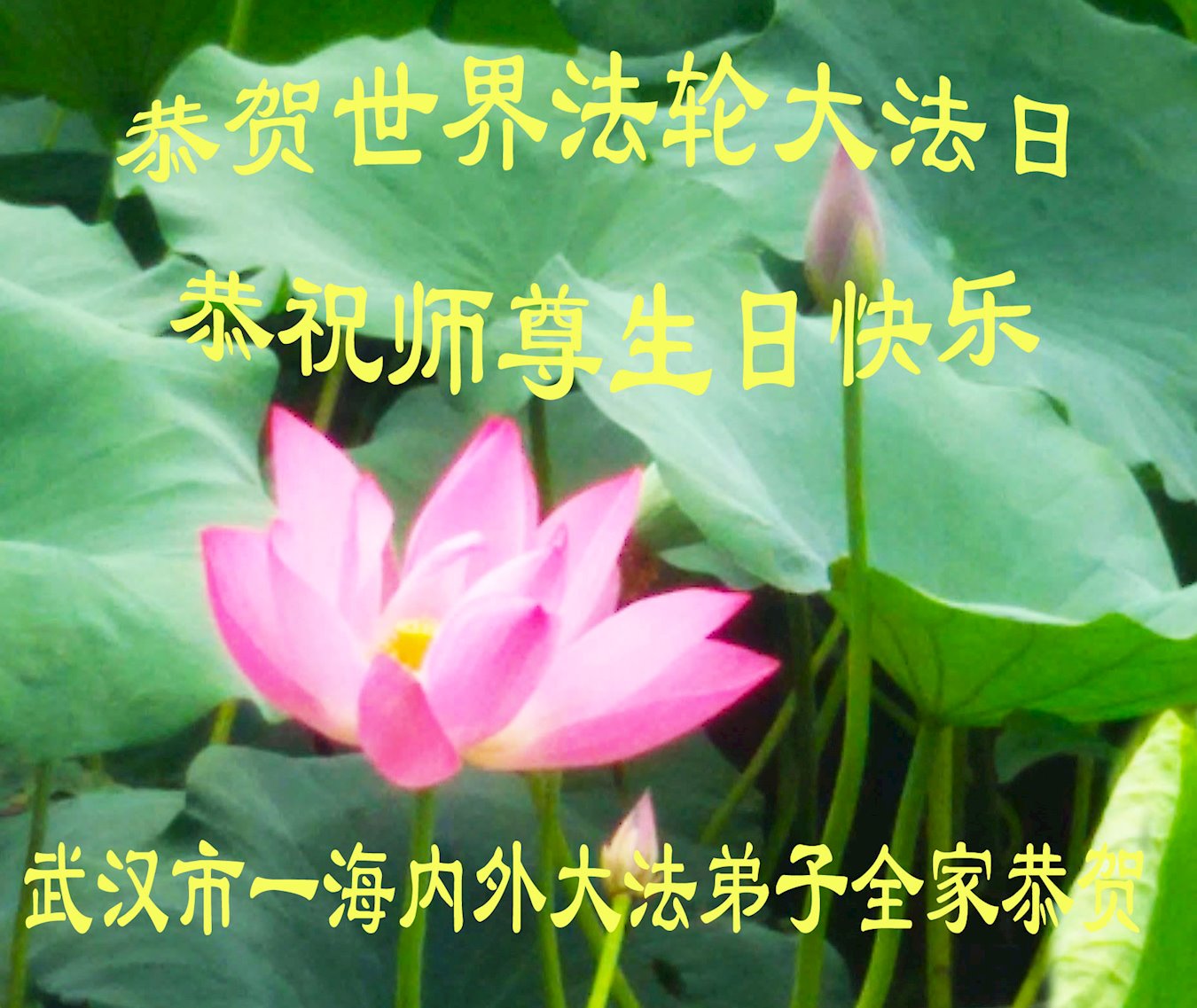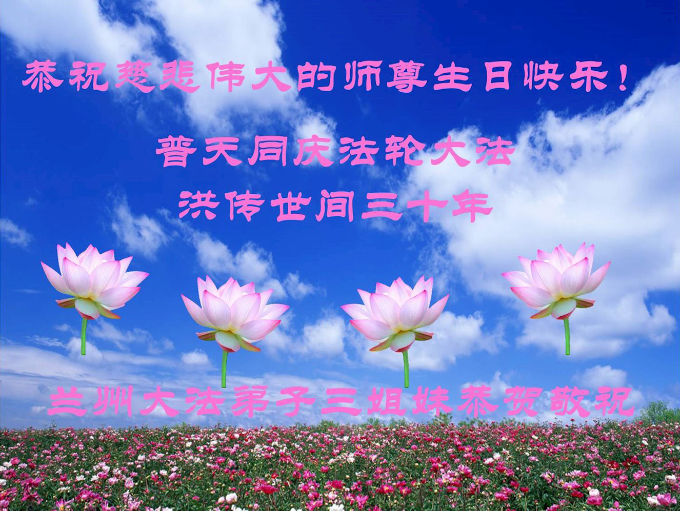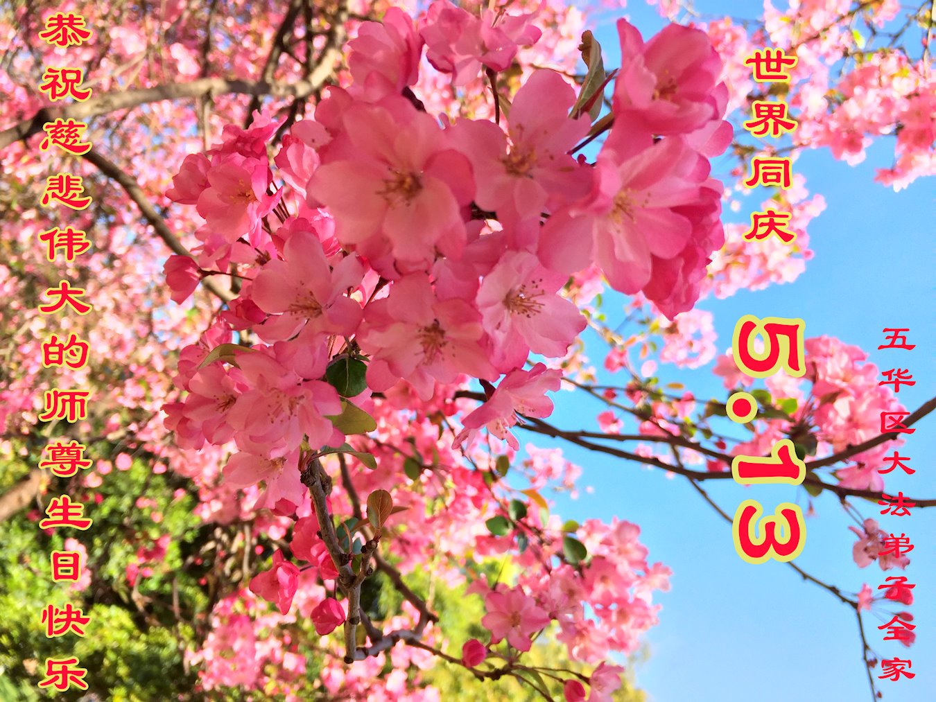 值此世界法轮大法日、法轮大法洪传三十周年、师尊华诞这普天同庆震撼寰宇最伟大而殊胜的日子里,大法弟子全家恭祝慈悲伟大的师尊生日快乐!感恩师尊慈悲救度!师尊辛苦了!弟子叩拜师尊!
