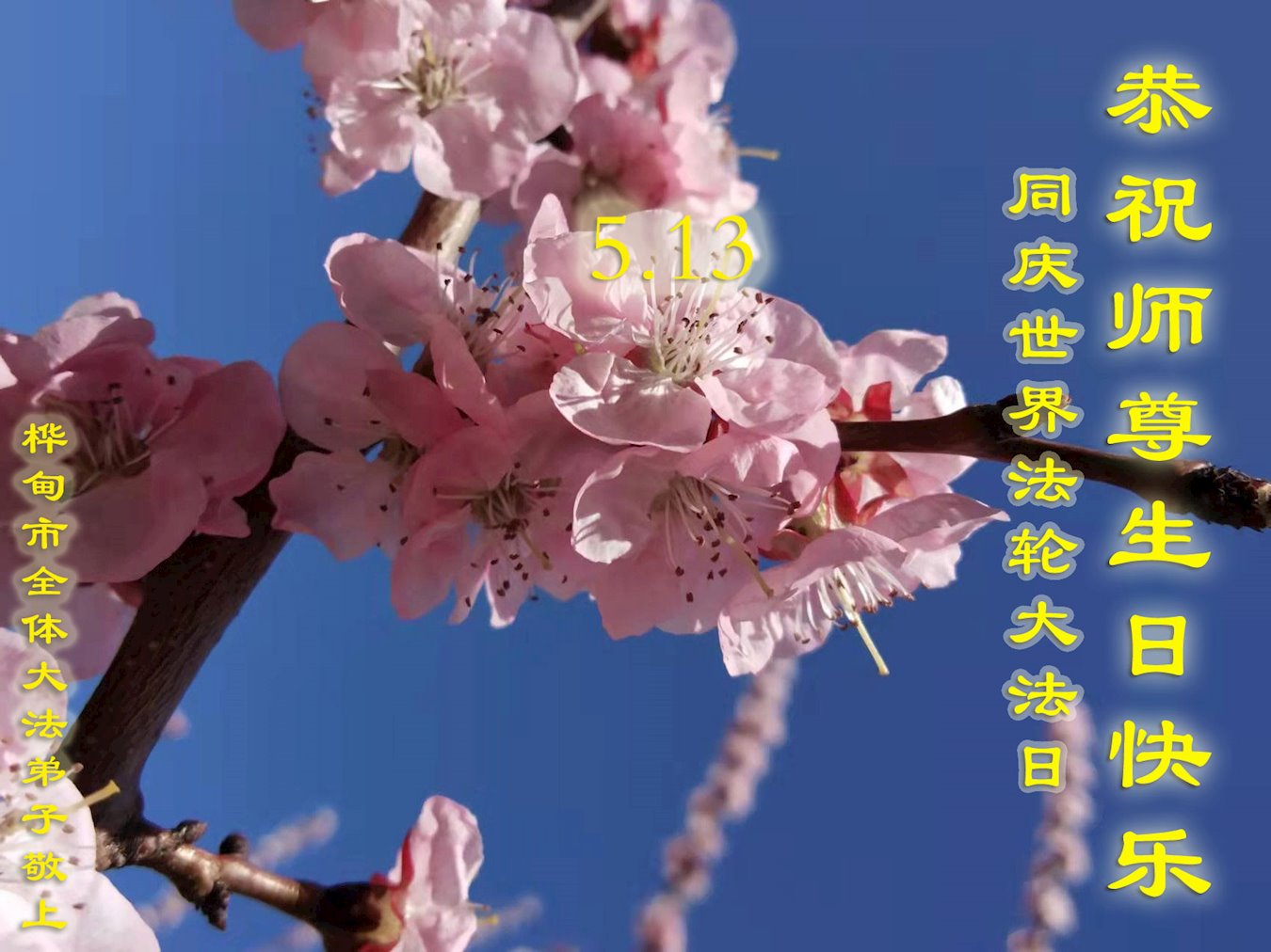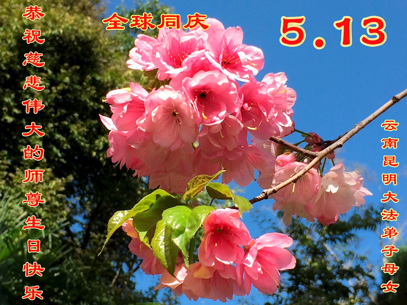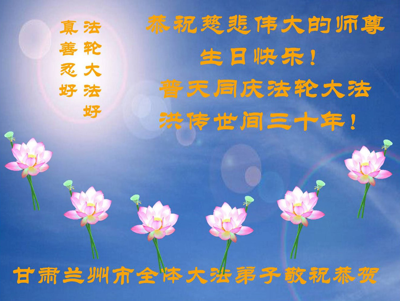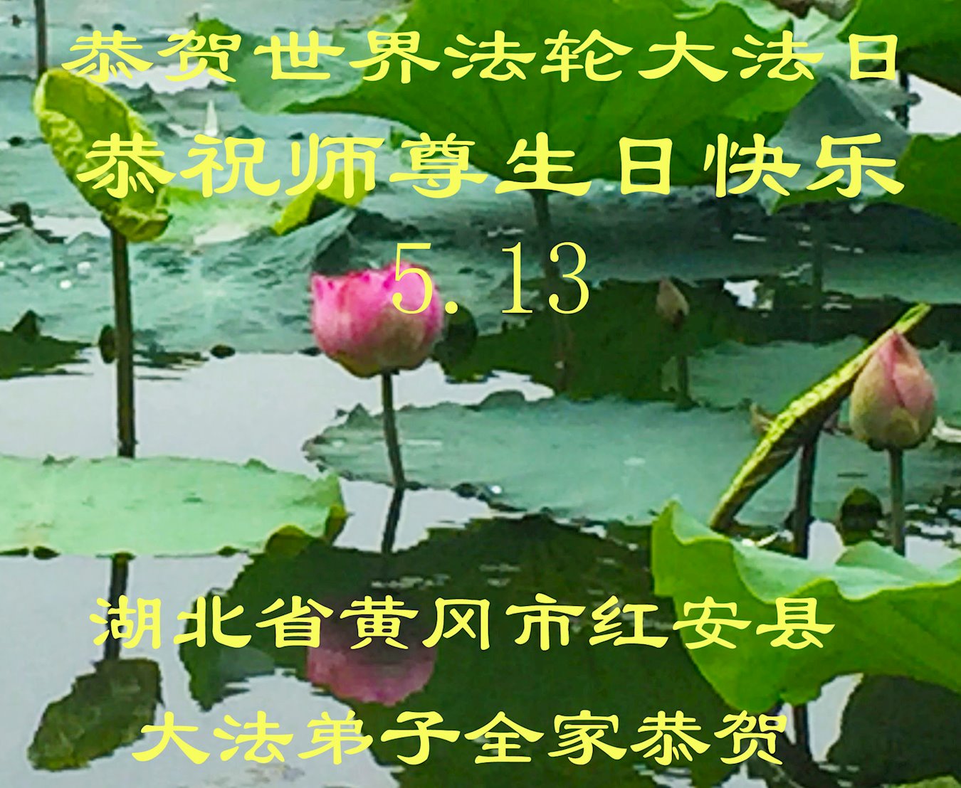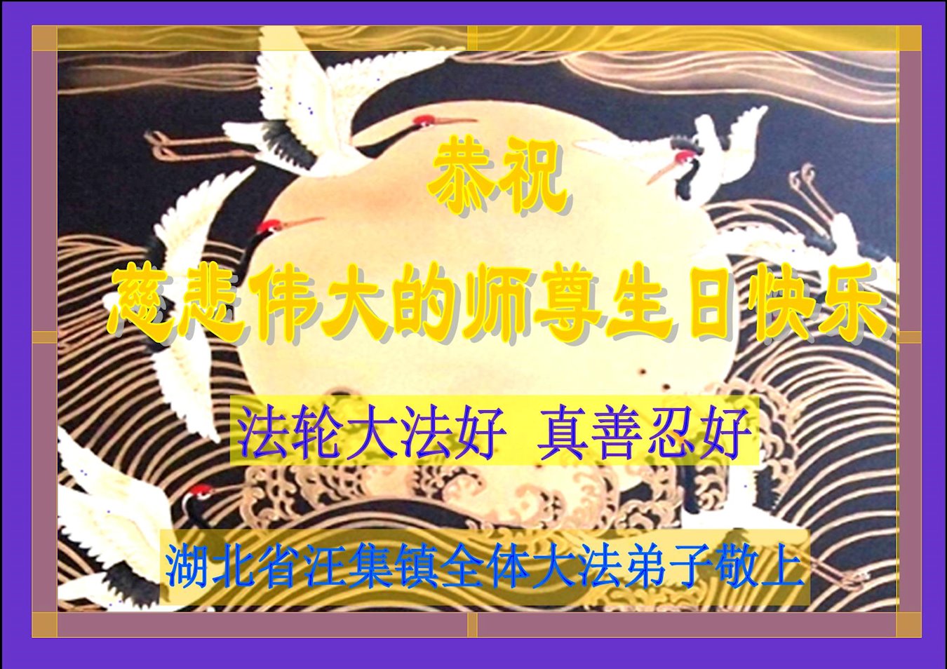 值此世界法轮大法日、法轮大法洪传三十周年、师尊华诞这普天同庆震撼寰宇最伟大而殊胜的日子里,大法弟子全家恭祝慈悲伟大的师尊生日快乐!感恩师尊慈悲救度!师尊辛苦了!弟子叩拜师尊!