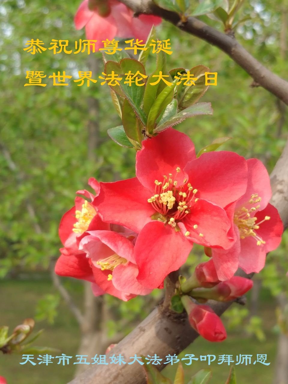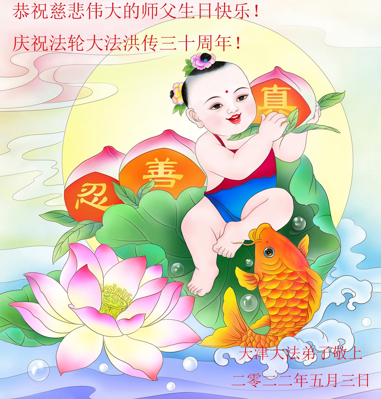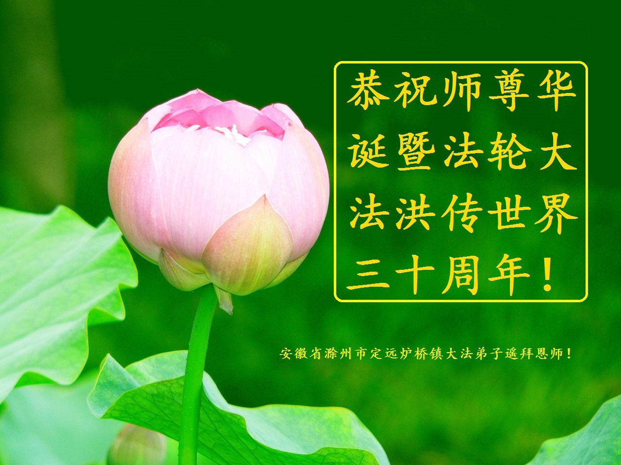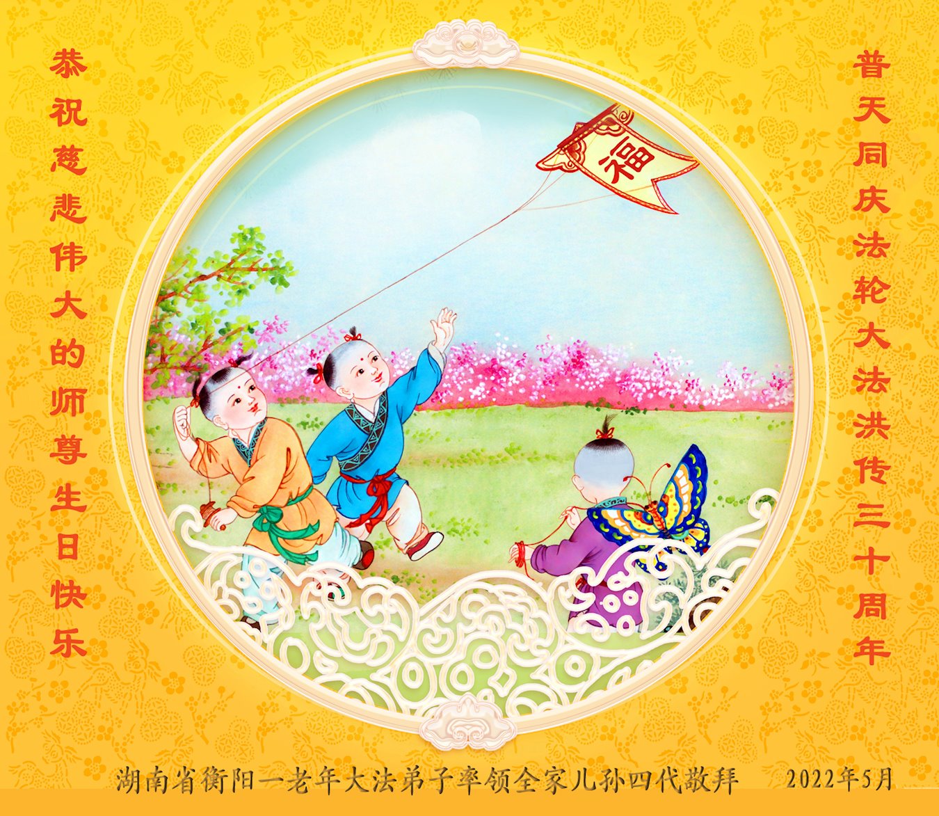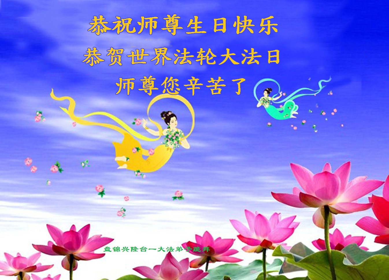 值此世界法轮大法日、法轮大法洪传三十周年、师尊华诞这普天同庆震撼寰宇最伟大而殊胜的日子里,大法弟子全家恭祝慈悲伟大的师尊生日快乐!感恩师尊慈悲救度!师尊辛苦了!弟子叩拜师尊!