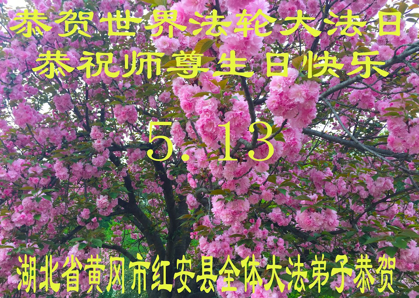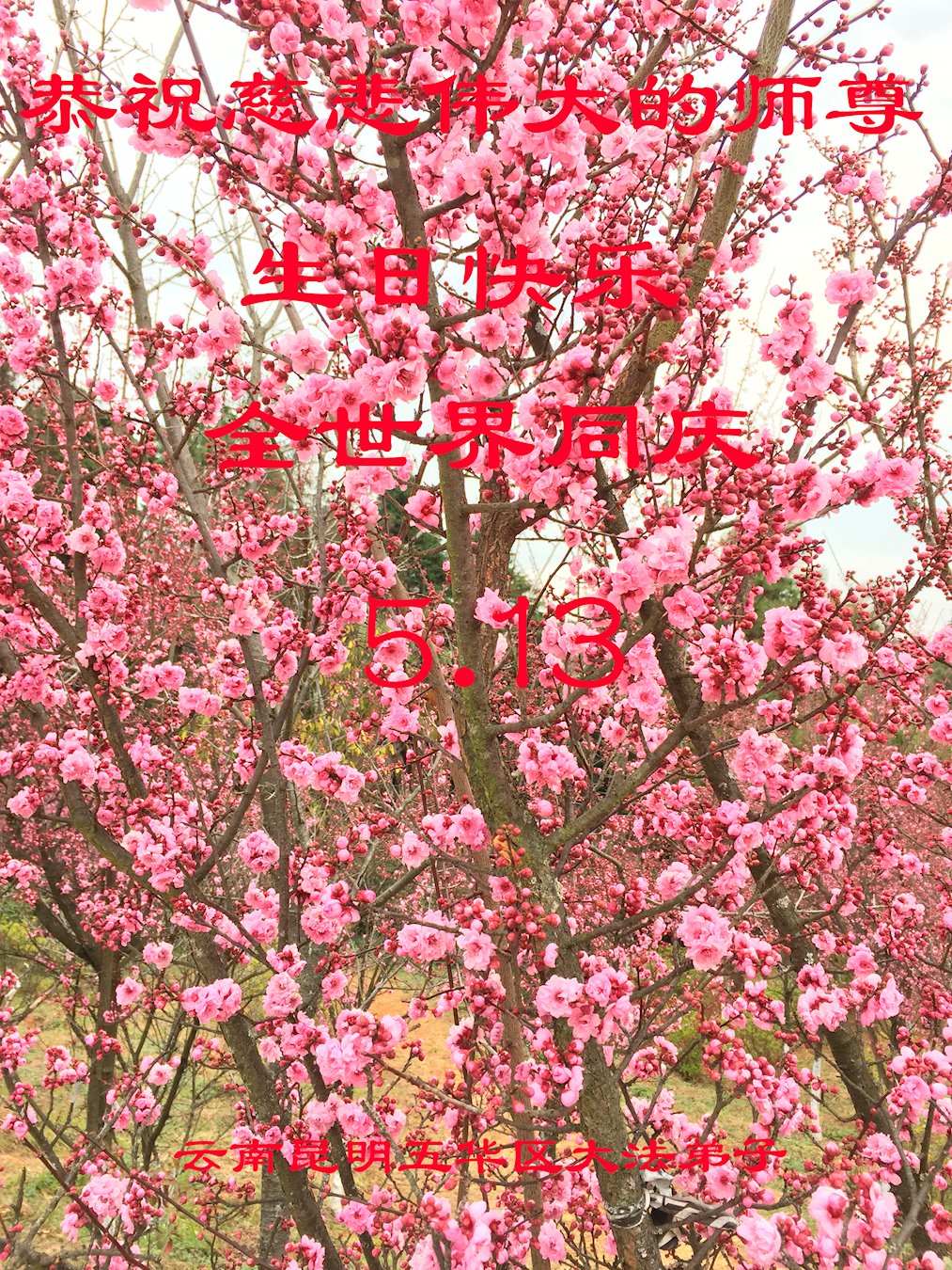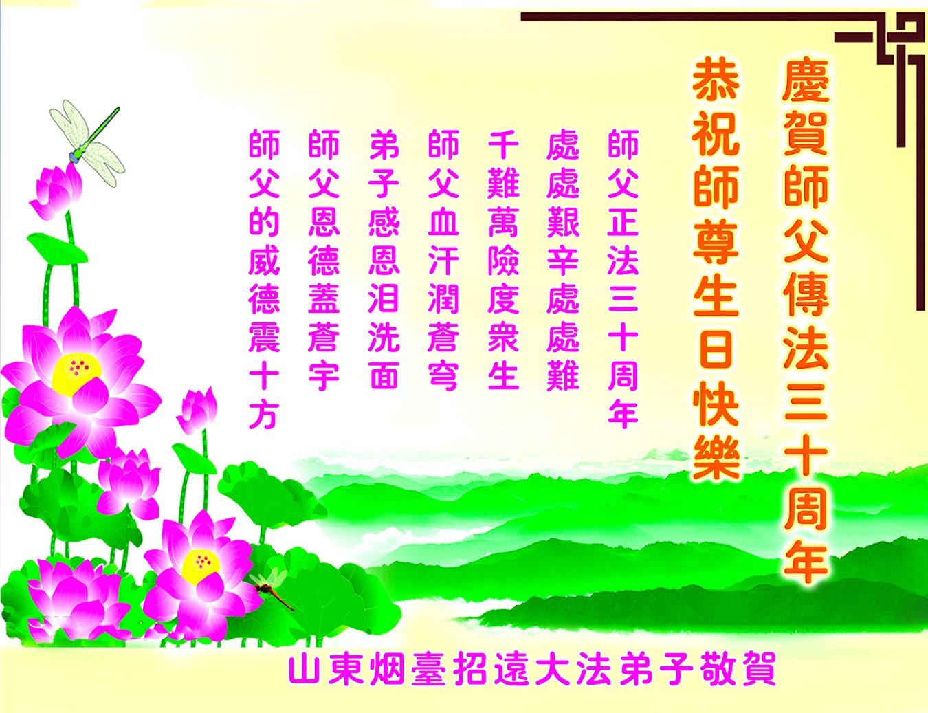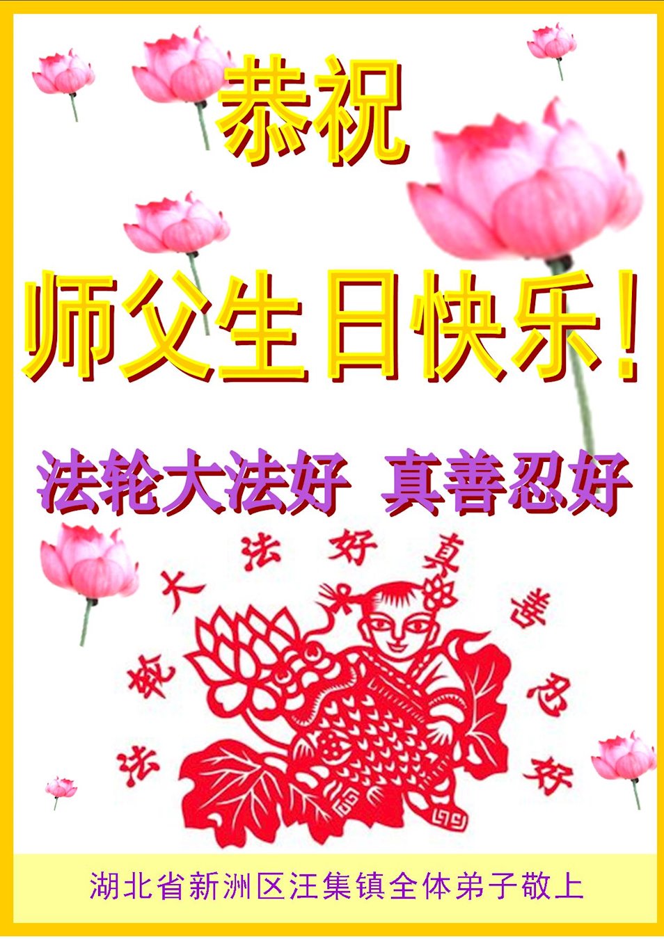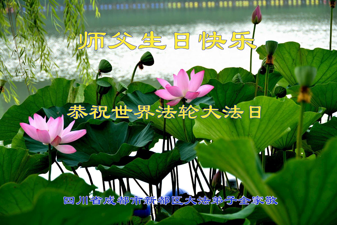 值此世界法轮大法日、法轮大法洪传三十周年、师尊华诞这普天同庆震撼寰宇最伟大而殊胜的日子里,大法弟子全家恭祝慈悲伟大的师尊生日快乐!感恩师尊慈悲救度!师尊辛苦了!弟子叩拜师尊!