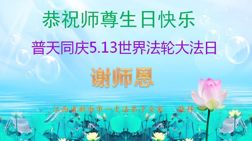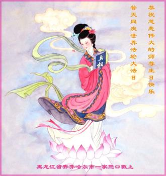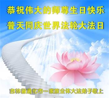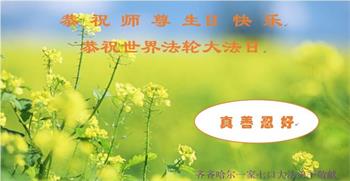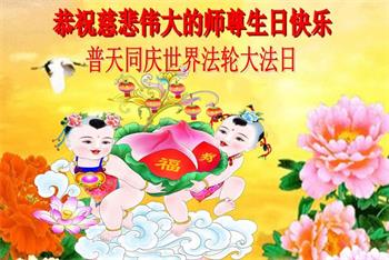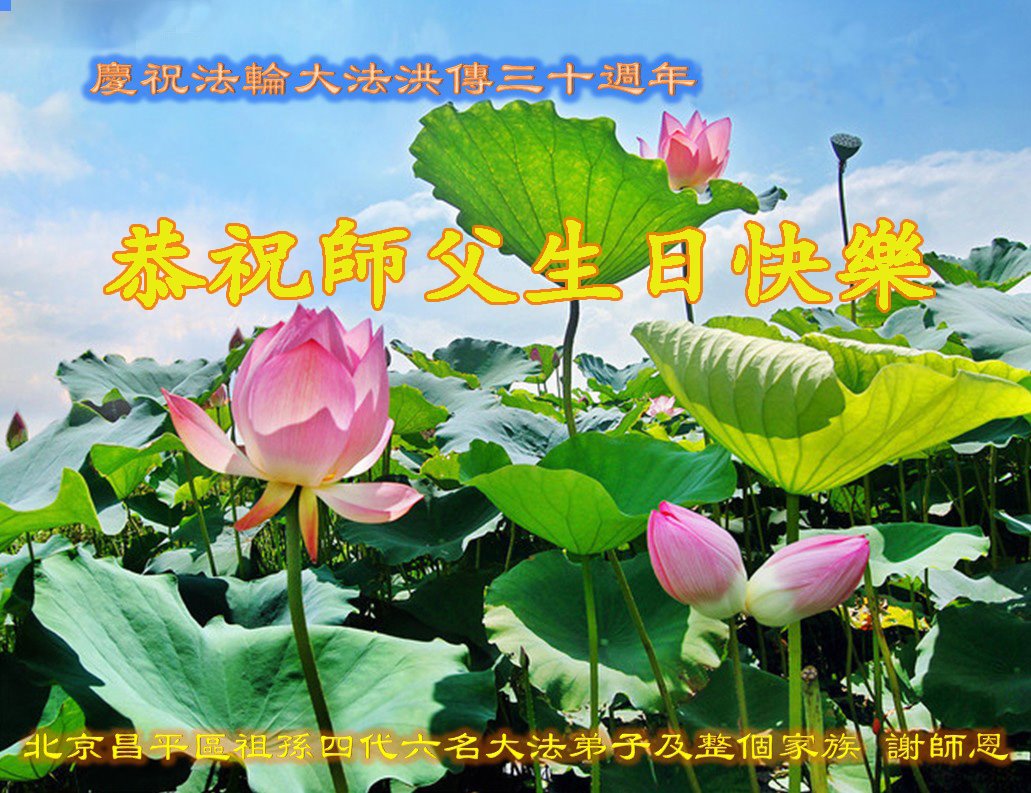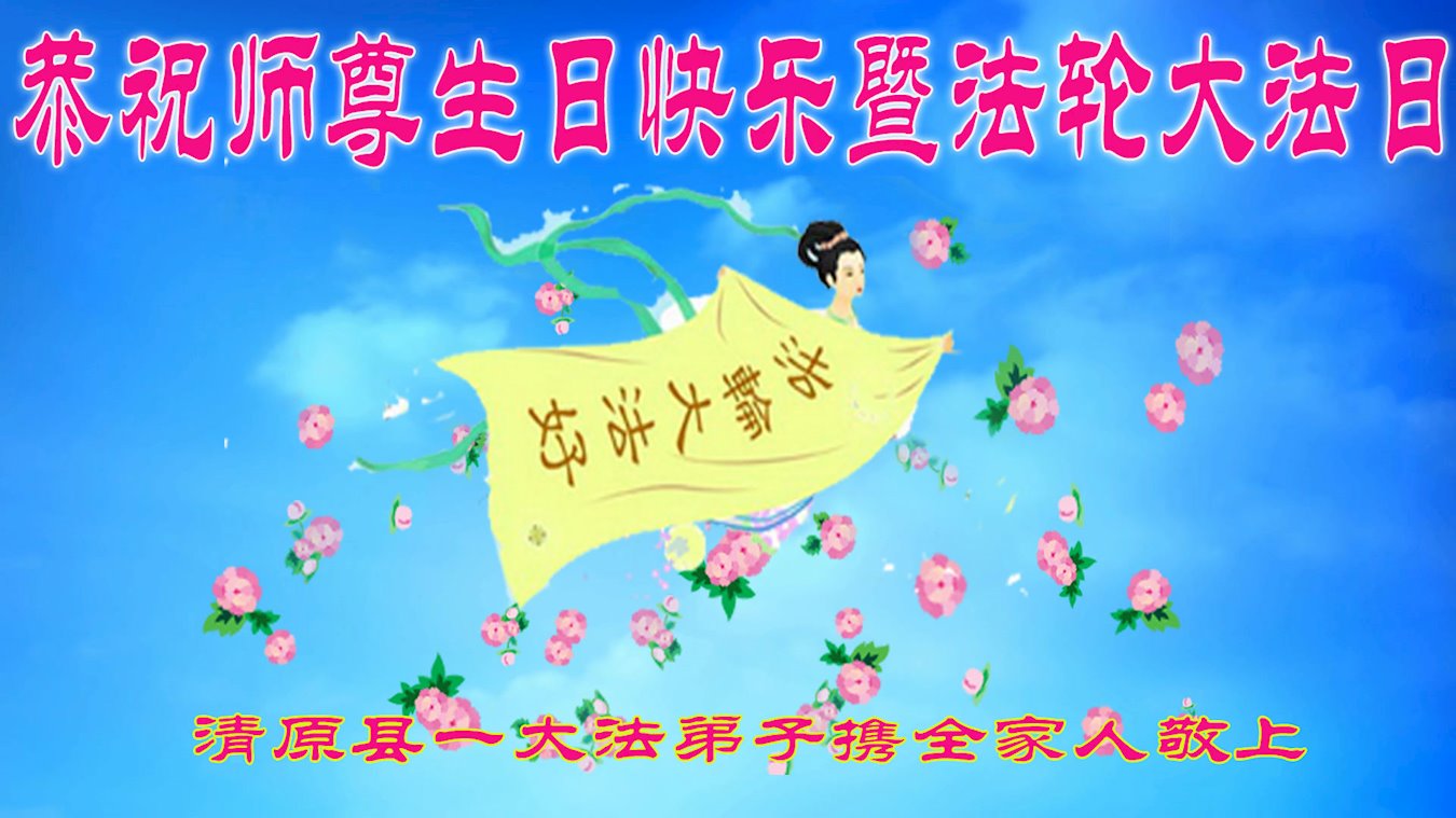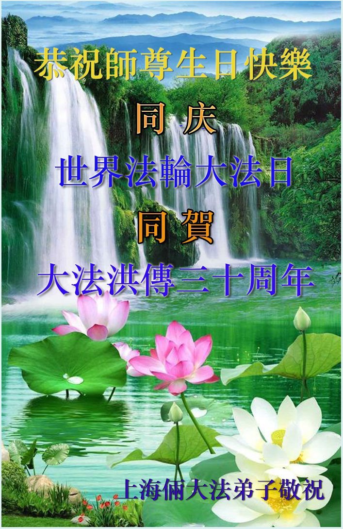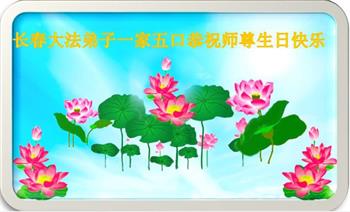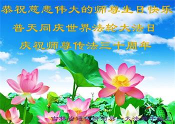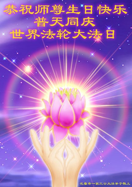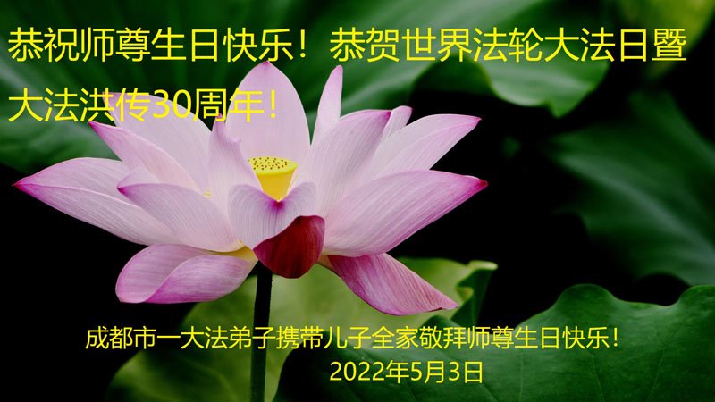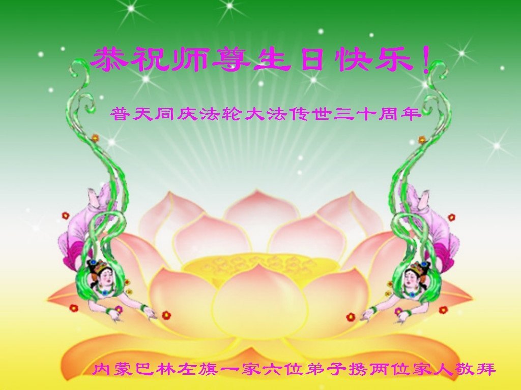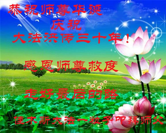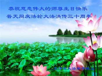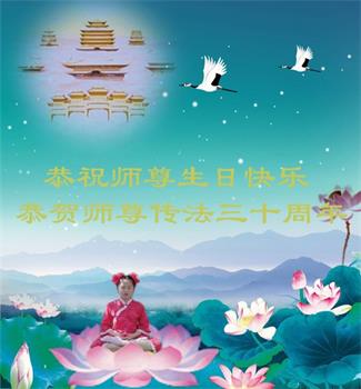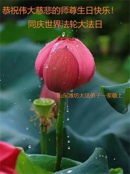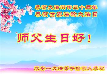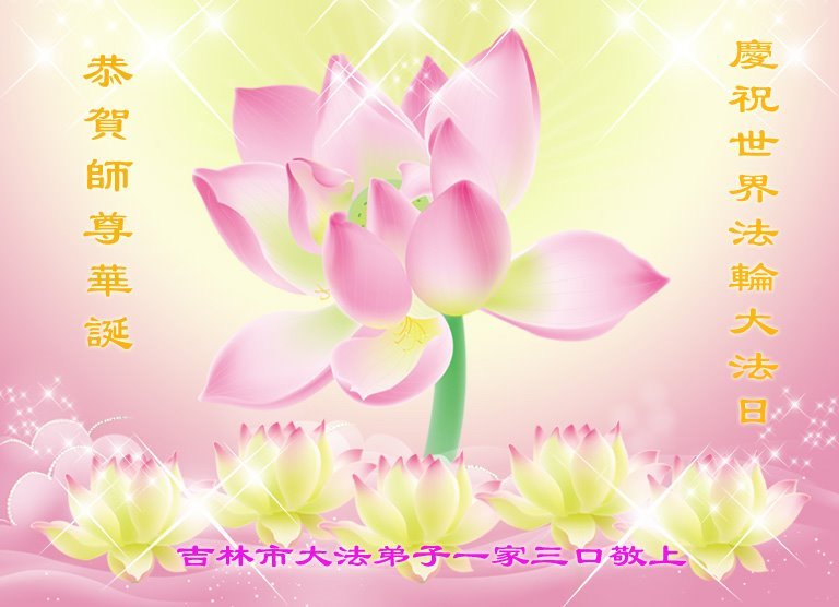 至此世界法轮大法日、法轮大法洪传三十周年、师尊华诞这普天同庆震撼寰宇最伟大而殊胜的日子里,大法弟子全家恭祝慈悲伟大的师尊生日快乐!感恩师尊慈悲救度!师尊辛苦了!弟子全家叩拜师尊!