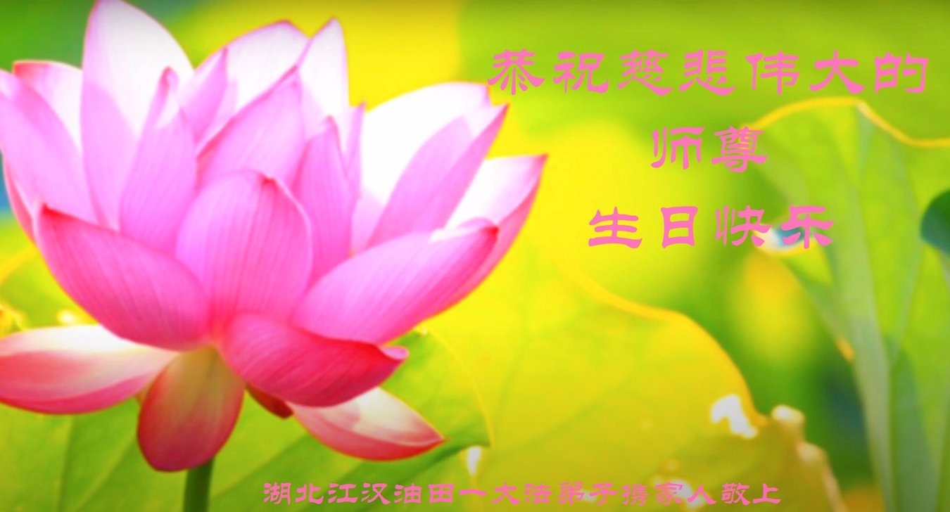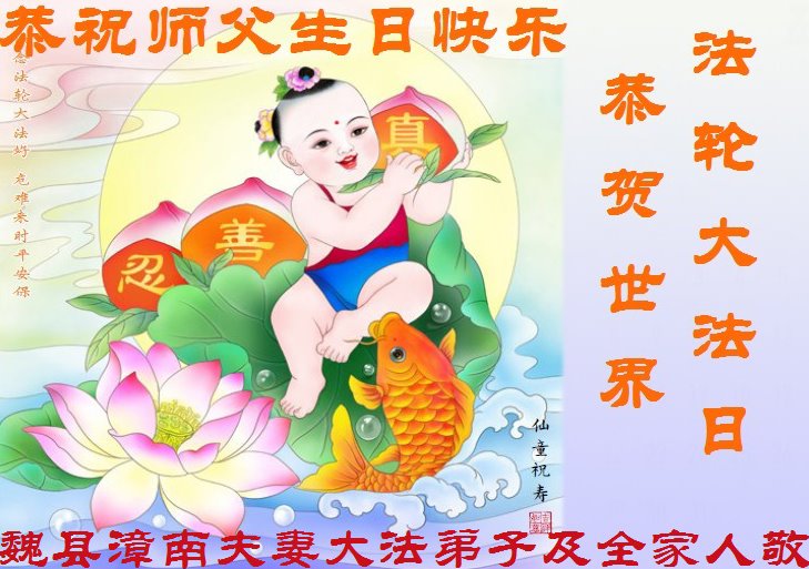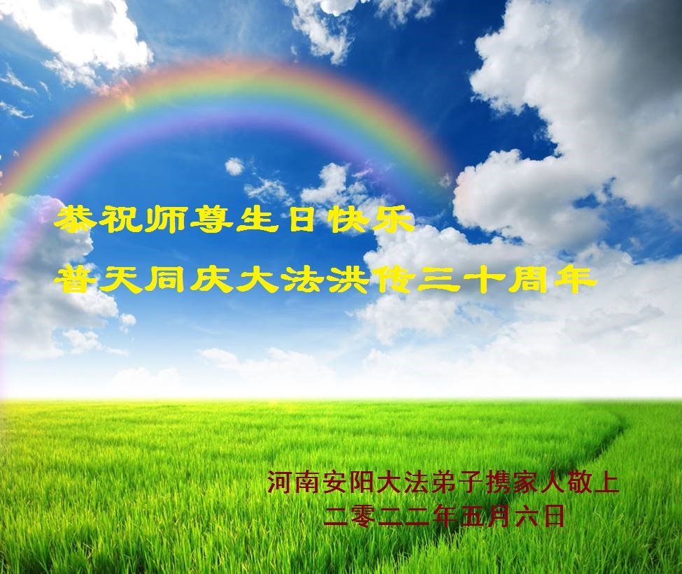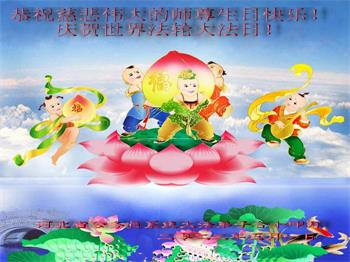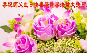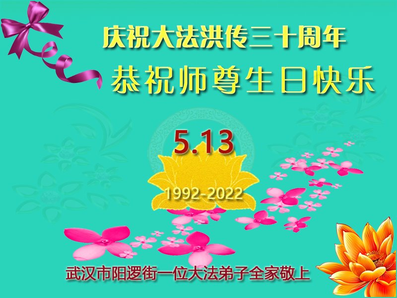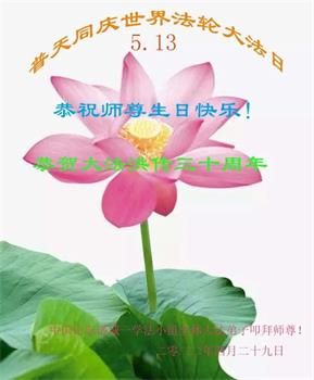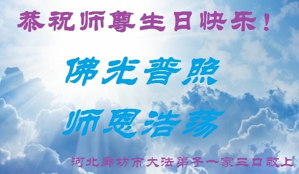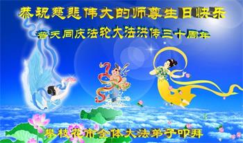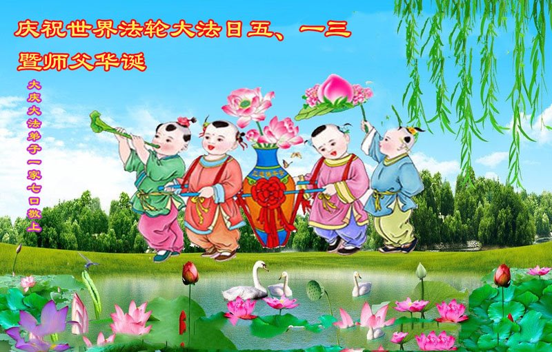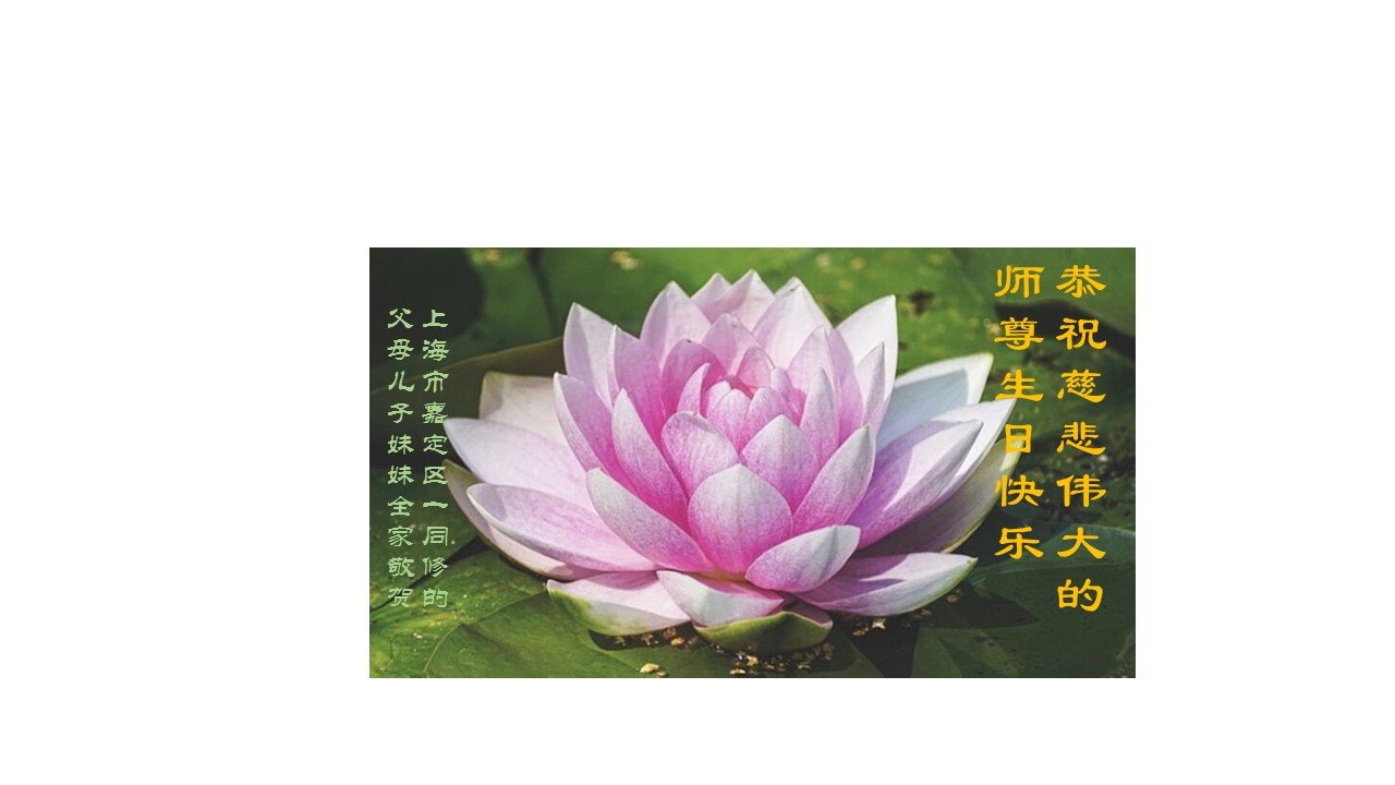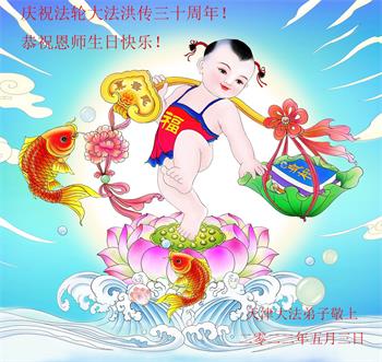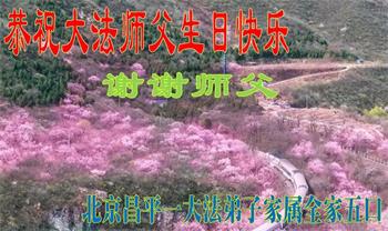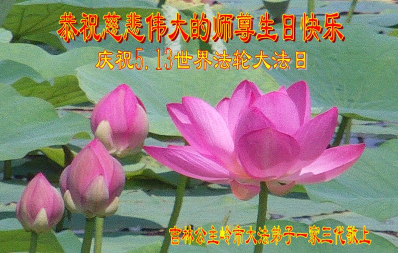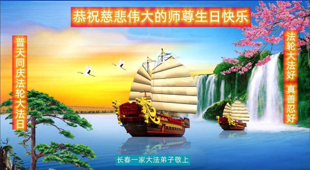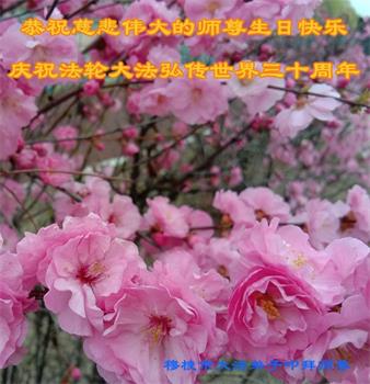 至此世界法轮大法日、法轮大法洪传三十周年、师尊华诞这普天同庆震撼寰宇最伟大而殊胜的日子里,大法弟子全家恭祝慈悲伟大的师尊生日快乐!感恩师尊慈悲救度!师尊辛苦了!弟子全家叩拜师尊!