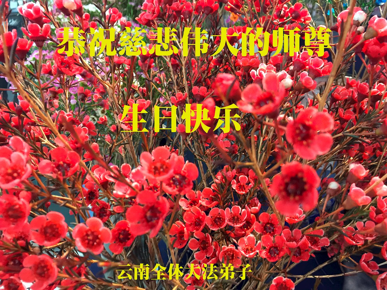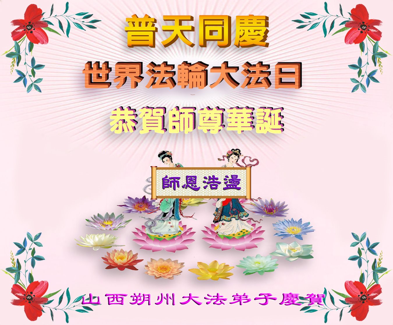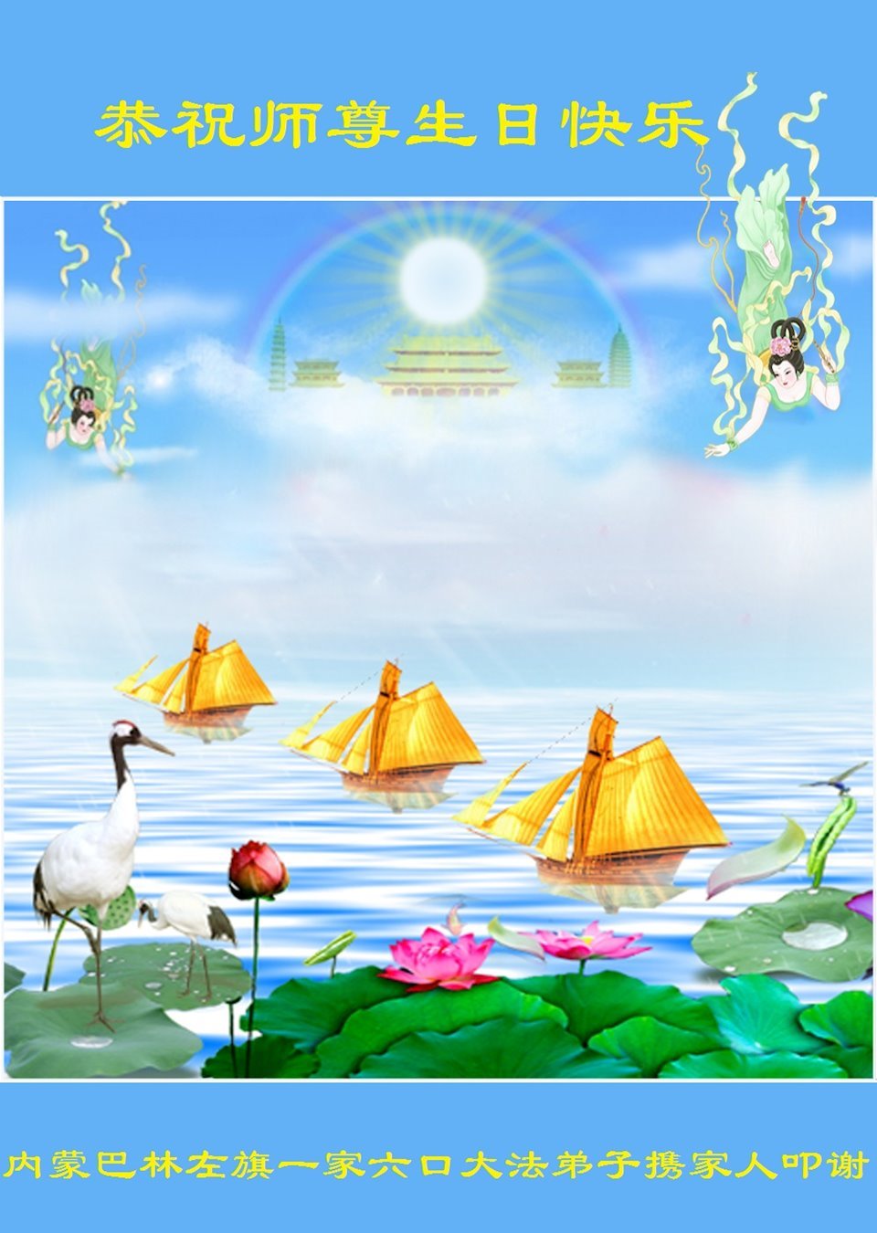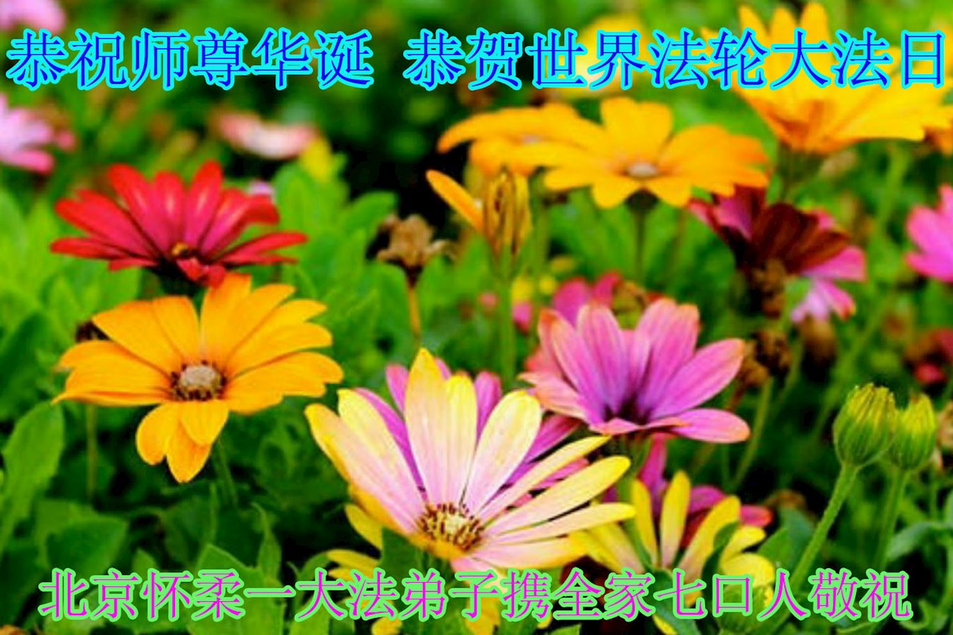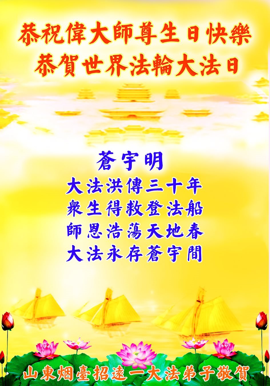 至此世界法轮大法日、法轮大法洪传三十周年、师尊华诞这普天同庆震撼寰宇最伟大而殊胜的日子里,大法弟子全家恭祝慈悲伟大的师尊生日快乐!感恩师尊慈悲救度!师尊辛苦了!弟子全家叩拜师尊!