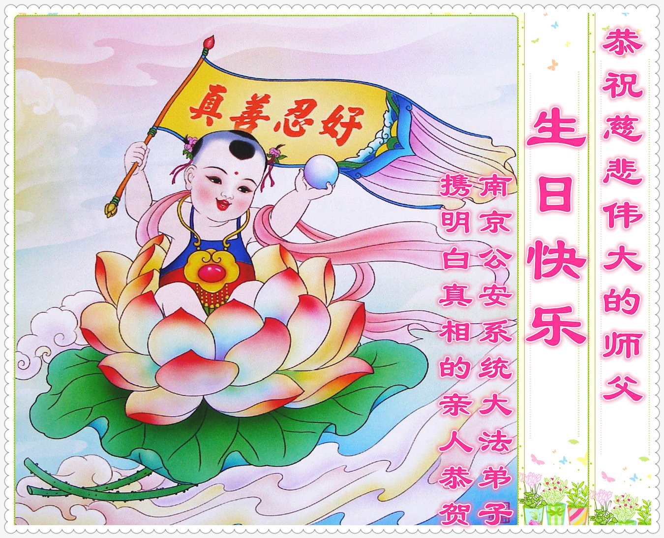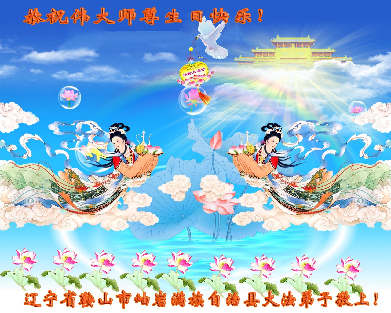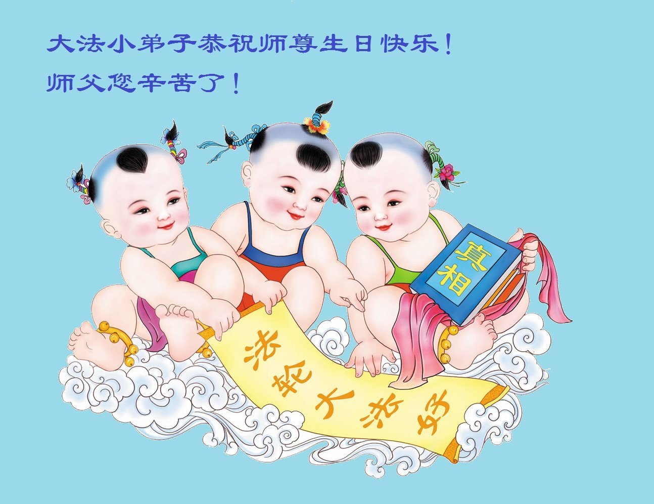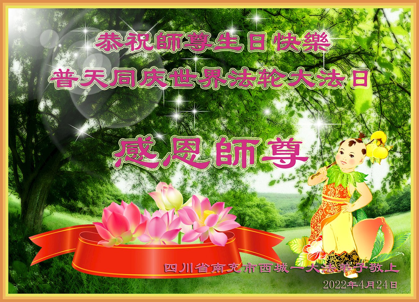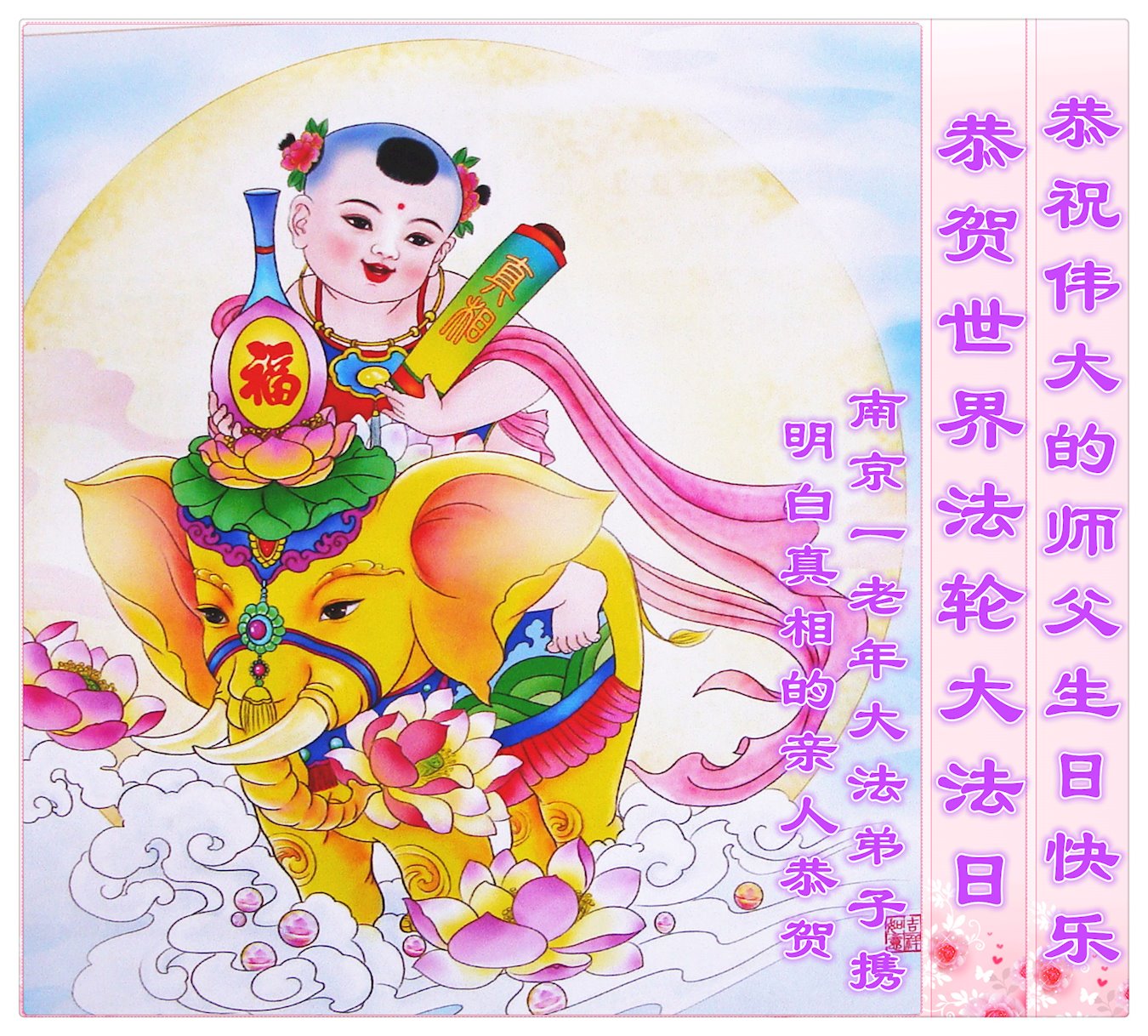 至此世界法轮大法日、法轮大法洪传三十周年、师尊华诞这普天同庆震撼寰宇最伟大而殊胜的日子里,大法弟子全家恭祝慈悲伟大的师尊生日快乐!感恩师尊慈悲救度!师尊辛苦了!弟子全家叩拜师尊!