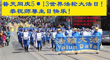 在与当地政要集会共庆世界法轮大法日后,正午时分,法轮功学员的盛大游行由雄壮威武、气势磅礴的天国乐团开道,在欢快悠扬鼓乐声中,人们被振奋人心的色彩缤纷的彩旗、腰鼓和仙女队等组成的游行队伍深深吸引,他们用掌声或大拇指赞美大法的美好。