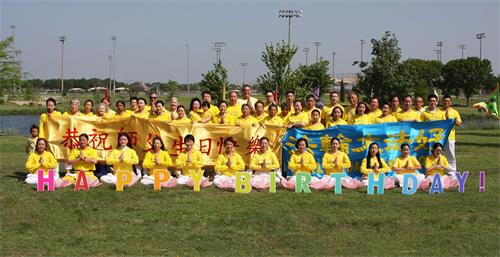 ![]() 图1:参加活动的各族裔法轮功学员一起恭祝师父生日快乐! |