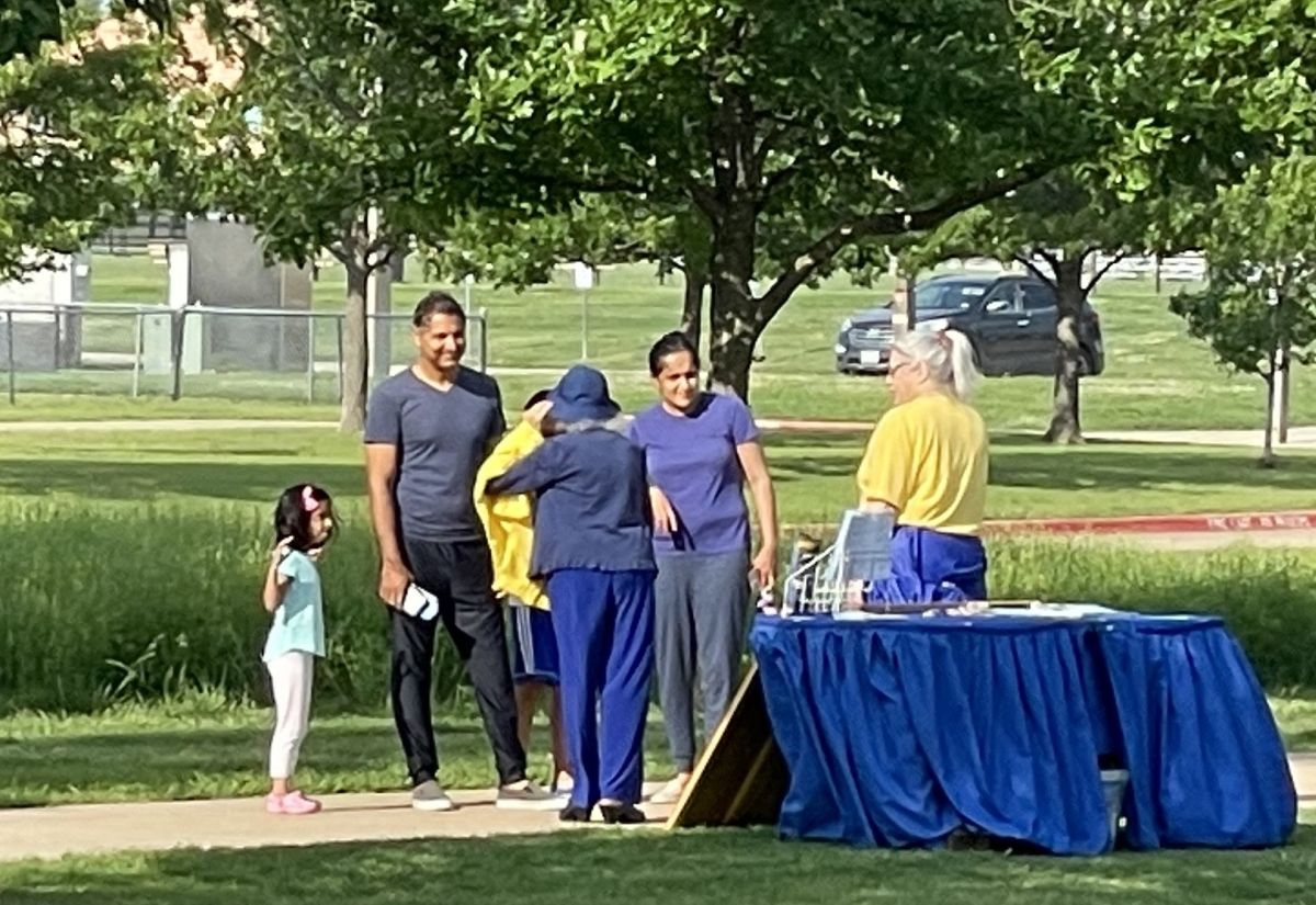 还有一位体育教练,对法轮功学员说:他一经过这里,就被吸引住了。他曾尝试过许多不同的运动,一直在寻求能使人提升的方法,现在听学员介绍的法轮功的理念,觉得这就是自己一直在寻找的。