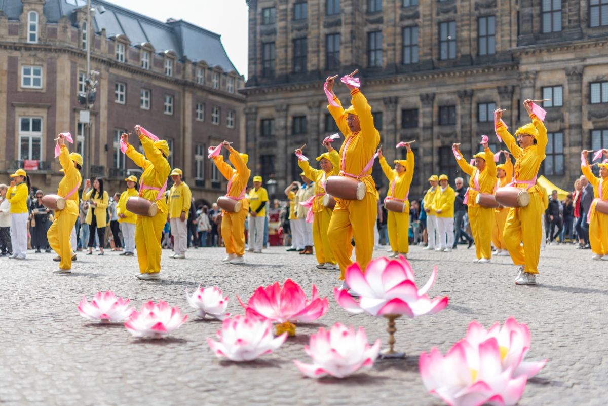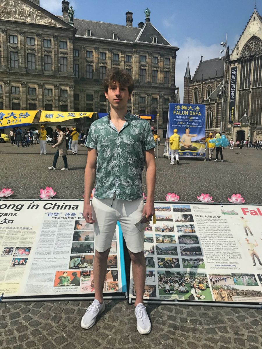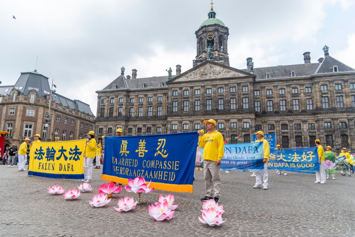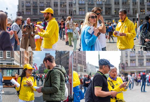 当天,天气晴好,周末的水坝广场,游人如织。法轮功学员得到阿姆斯特丹市政府的支持,在广场最好的位置竖起巨大的横幅和大型真相展板。