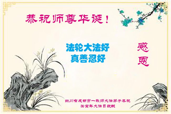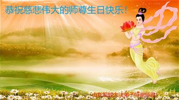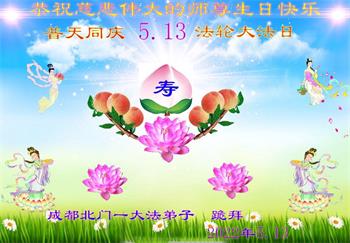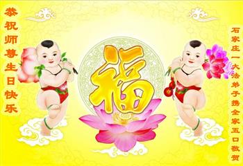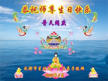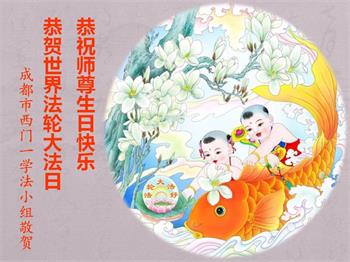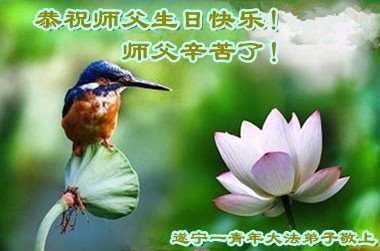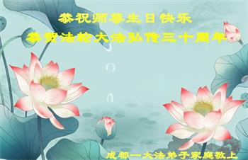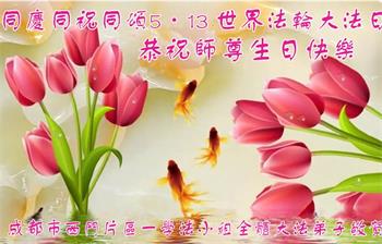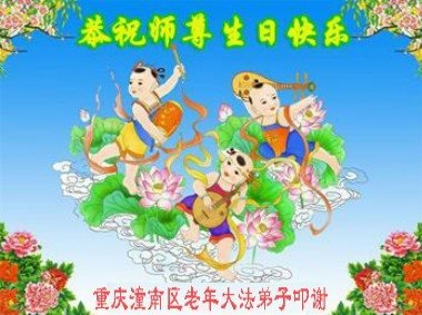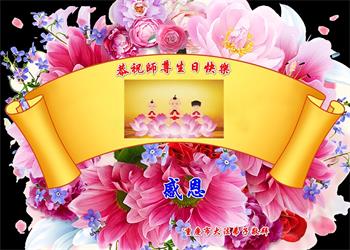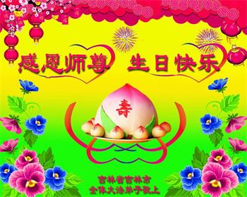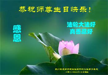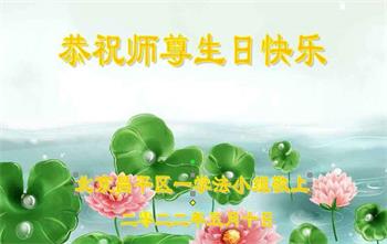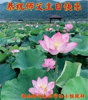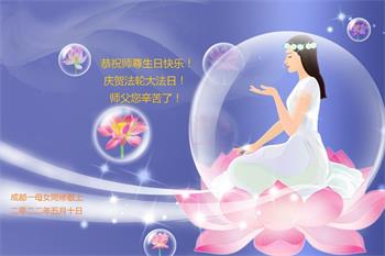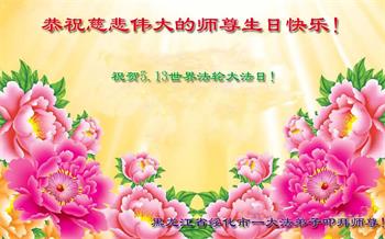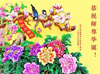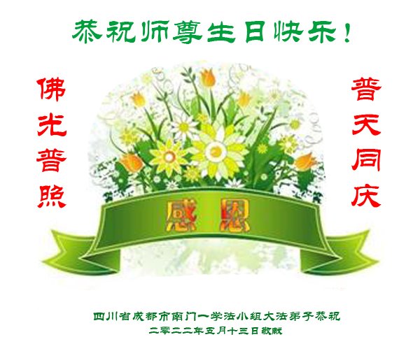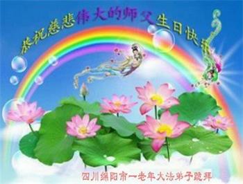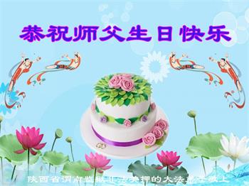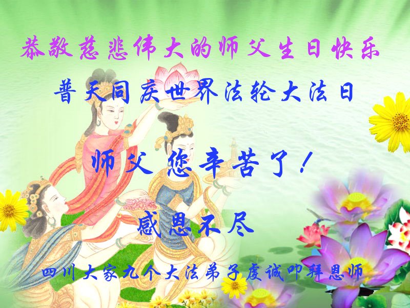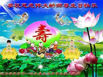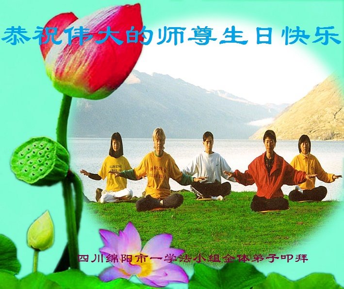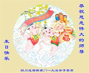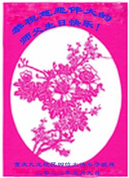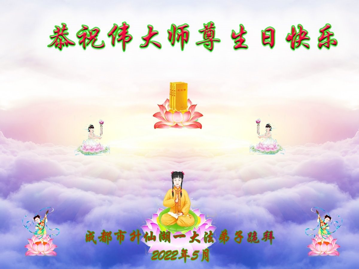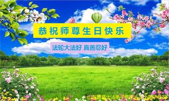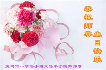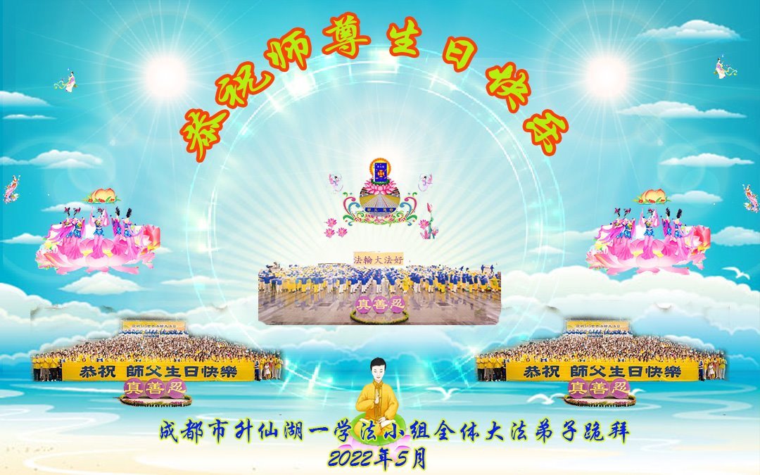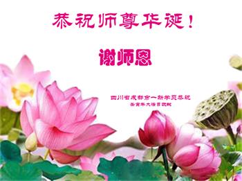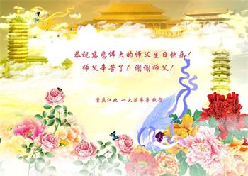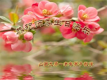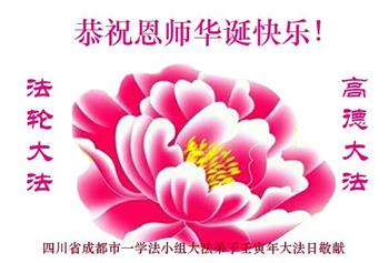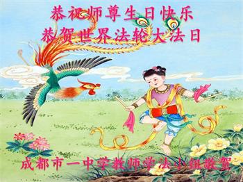 成都市一中学教师学法小组大法弟子带着满满的祝福:师父,请接受我们发自心灵深处的无限感恩与叩拜!请让我们对您说一声“师父,您辛苦了!弟子想念您!祝您生日快乐!”