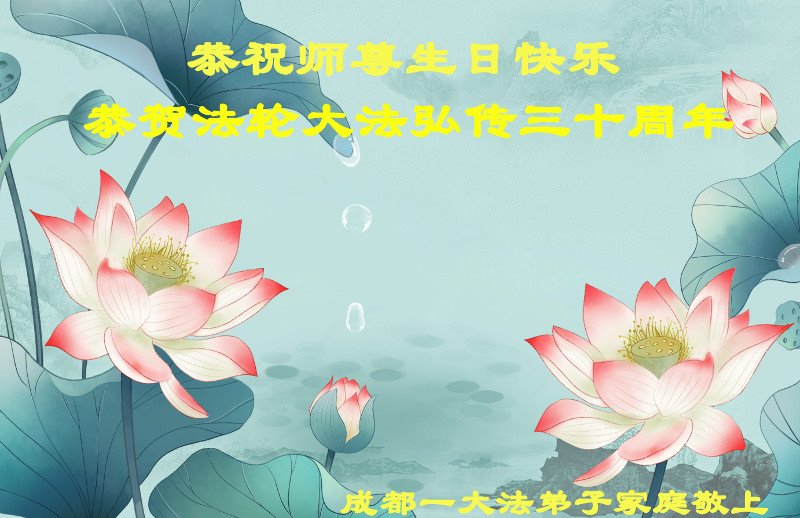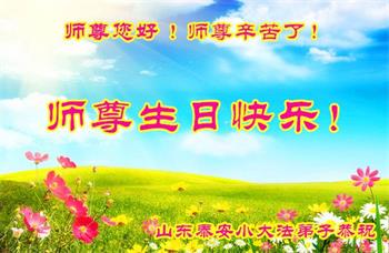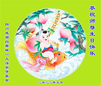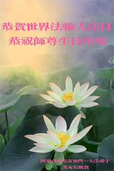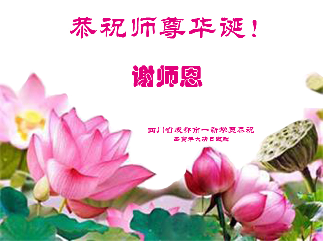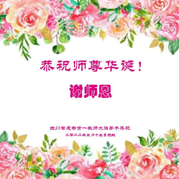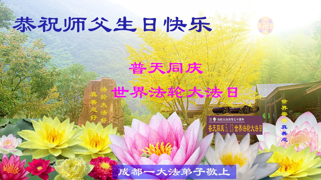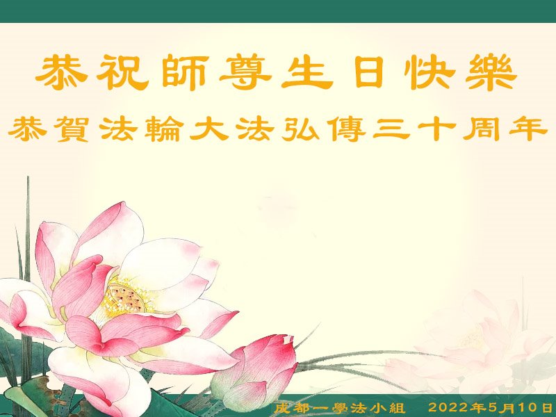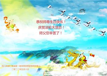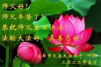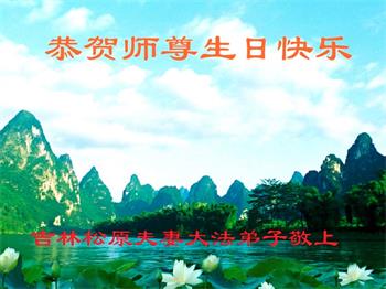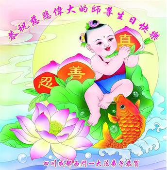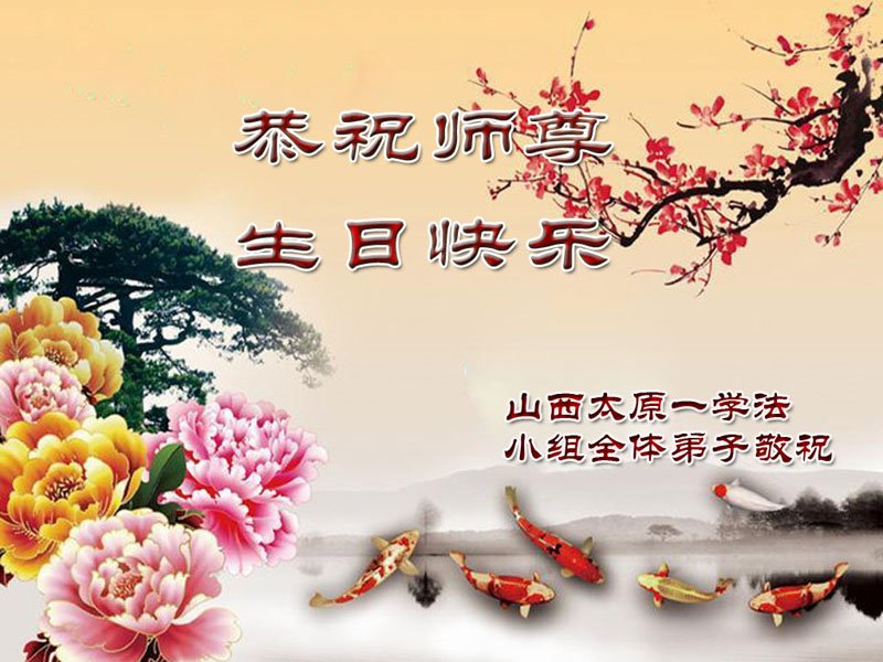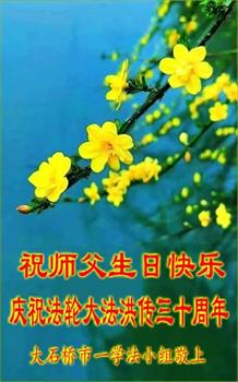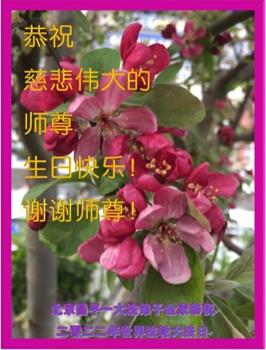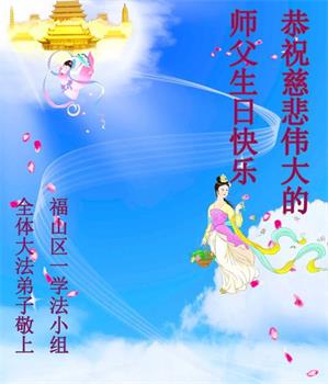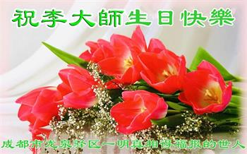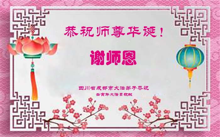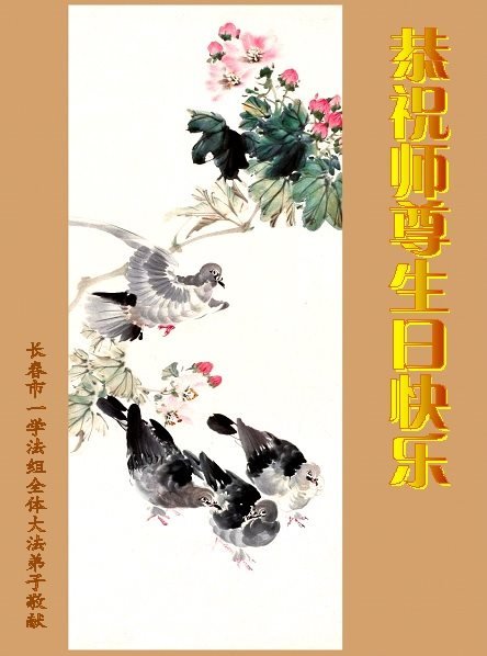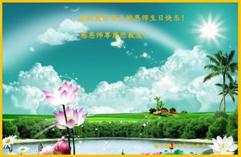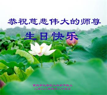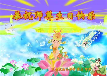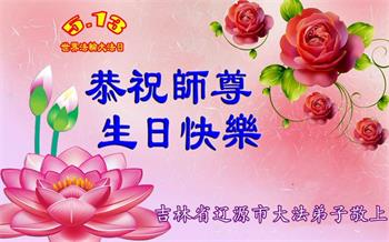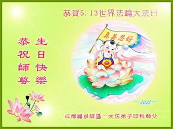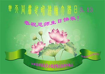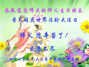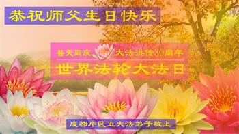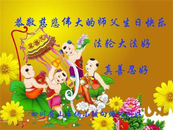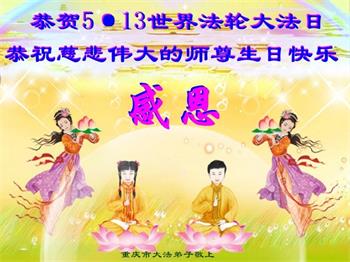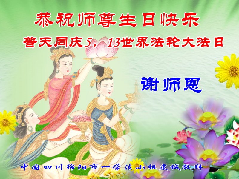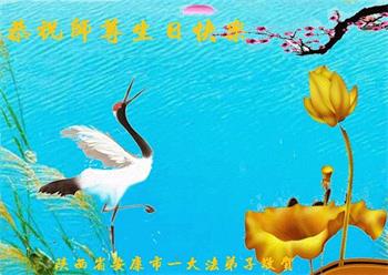 成都市一中学教师学法小组大法弟子带着满满的祝福:师父,请接受我们发自心灵深处的无限感恩与叩拜!请让我们对您说一声“师父,您辛苦了!弟子想念您!祝您生日快乐!”