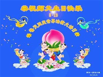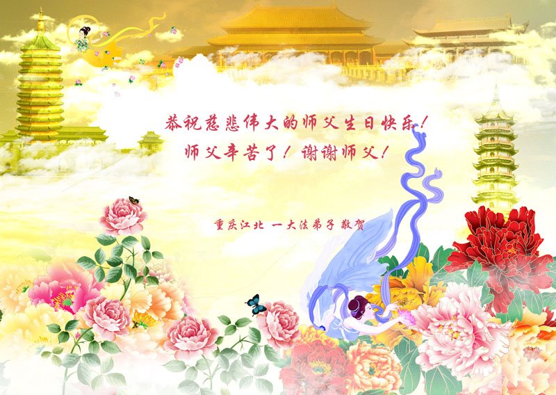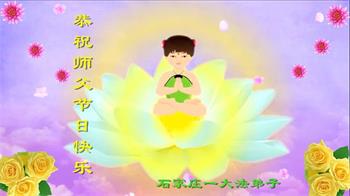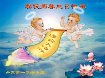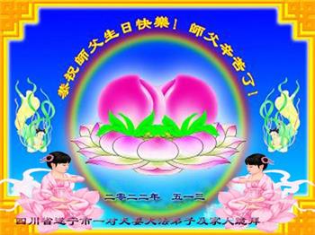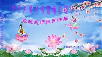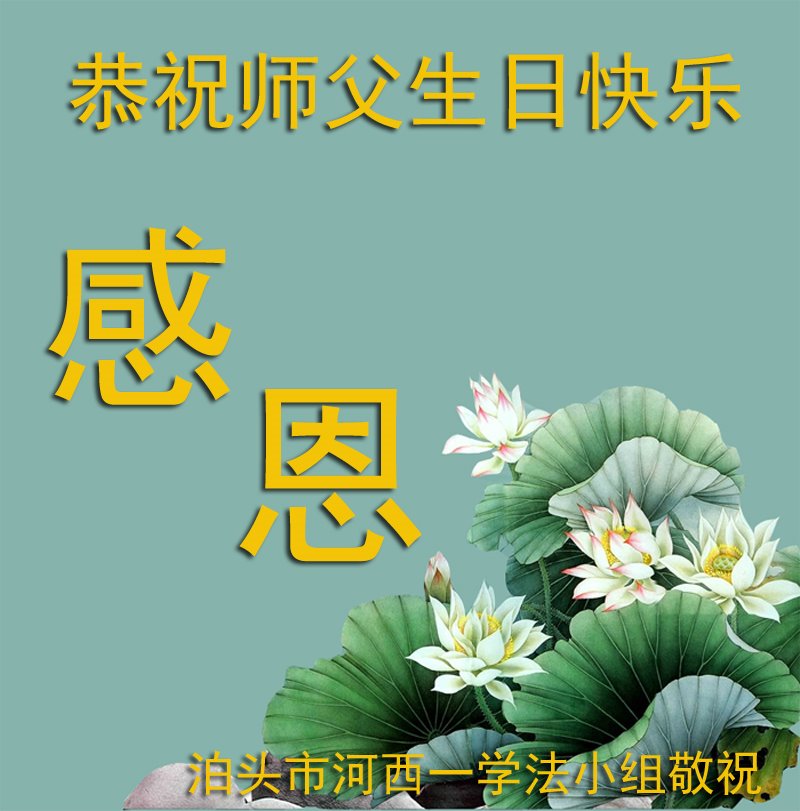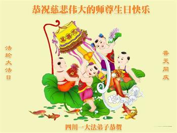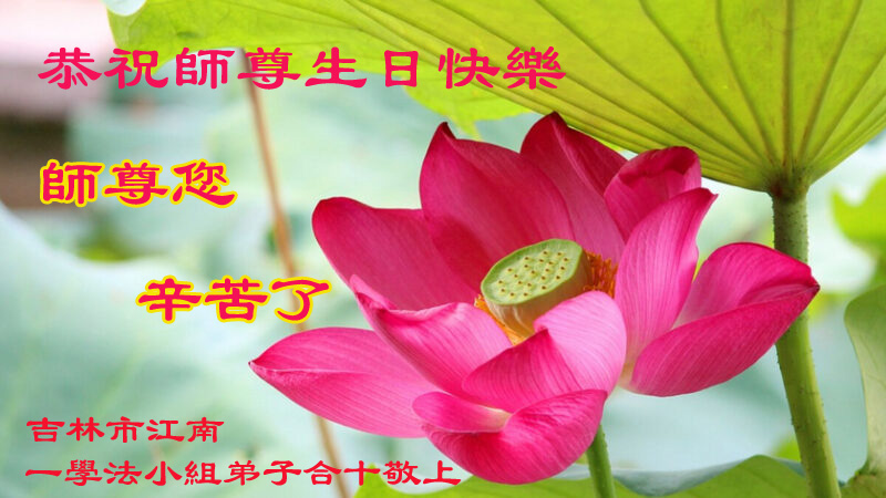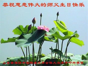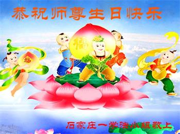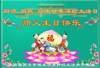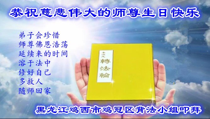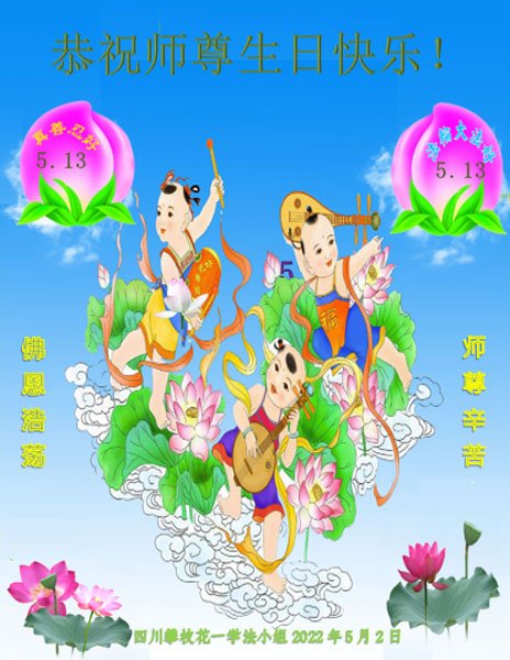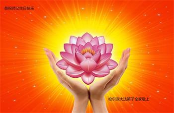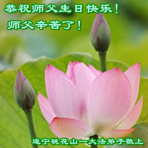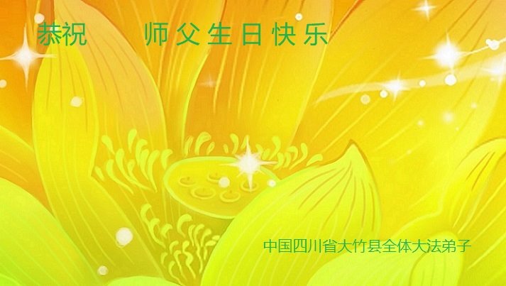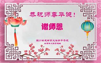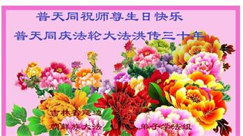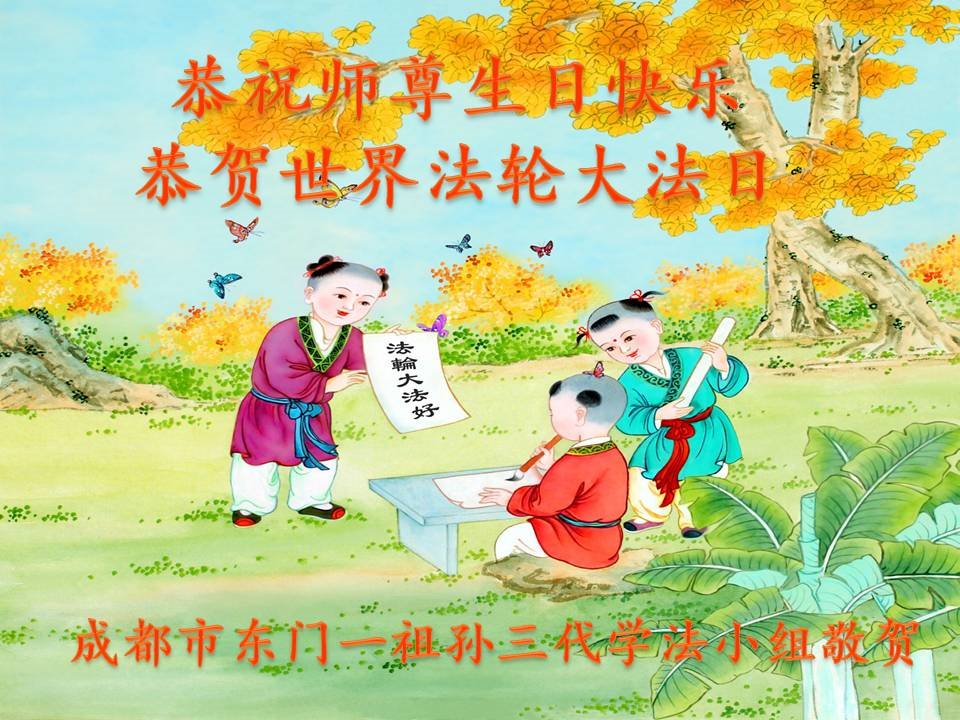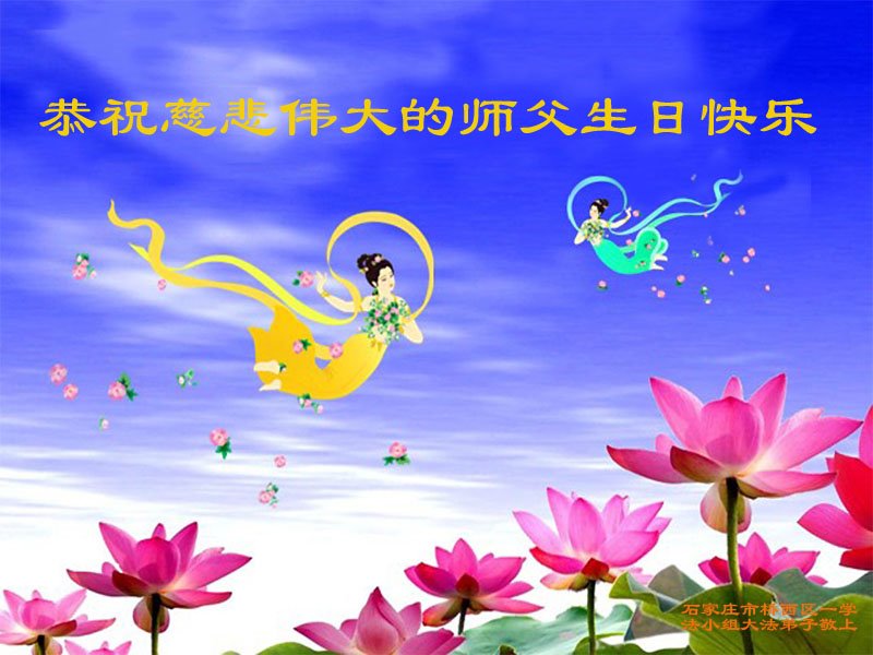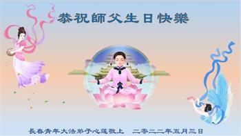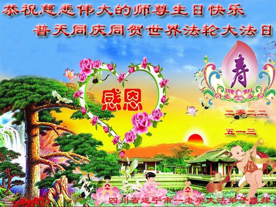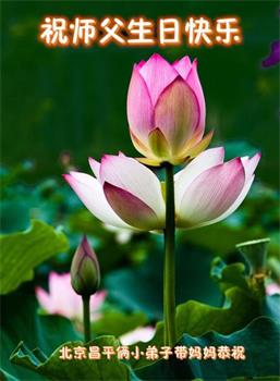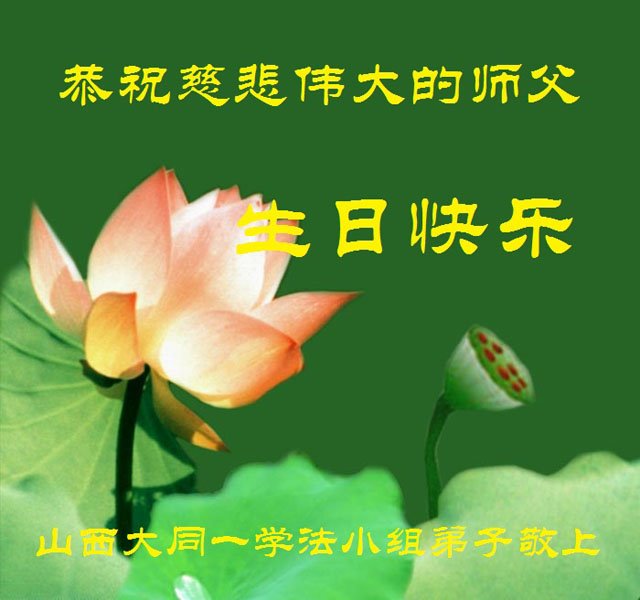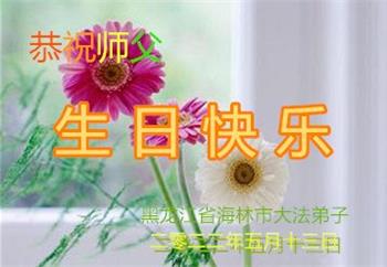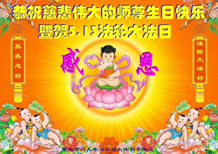 成都市一中学教师学法小组大法弟子带着满满的祝福:师父,请接受我们发自心灵深处的无限感恩与叩拜!请让我们对您说一声“师父,您辛苦了!弟子想念您!祝您生日快乐!”