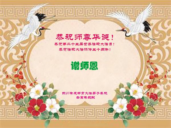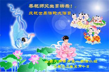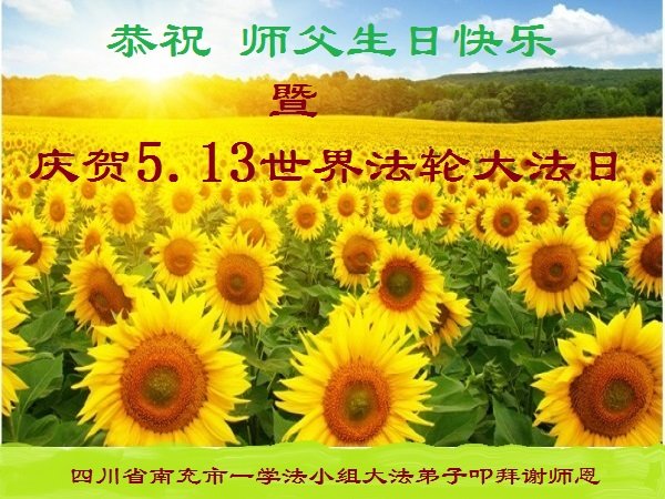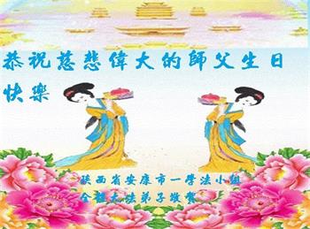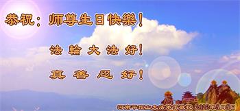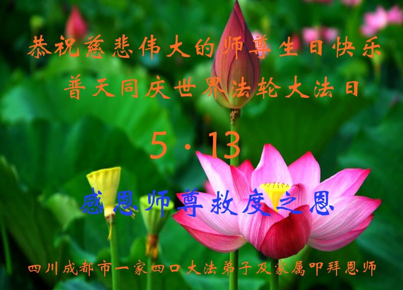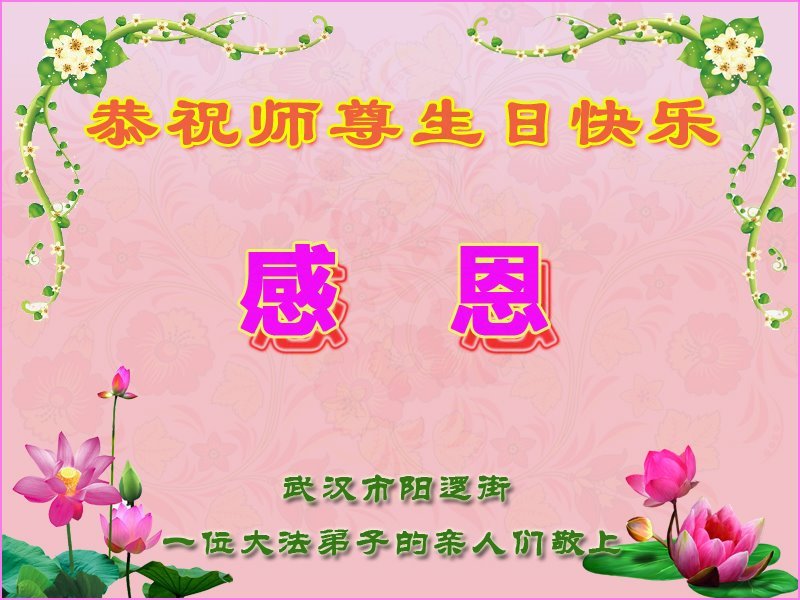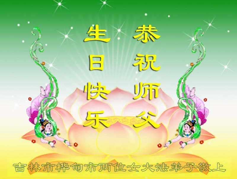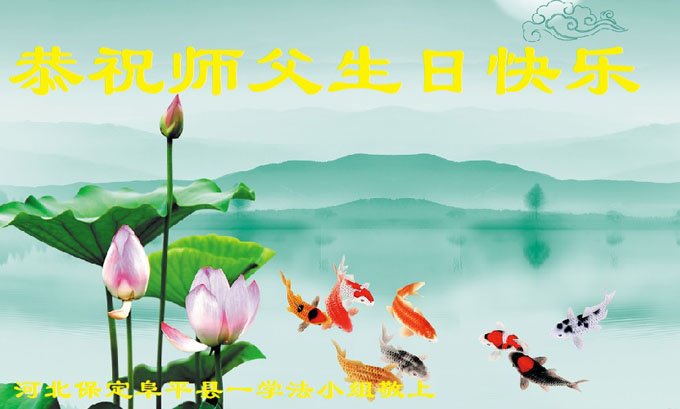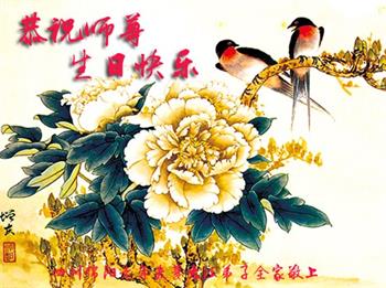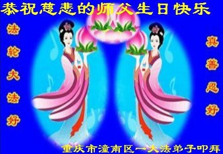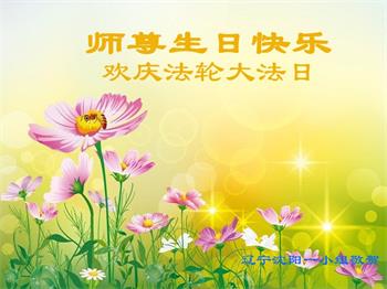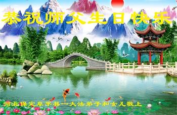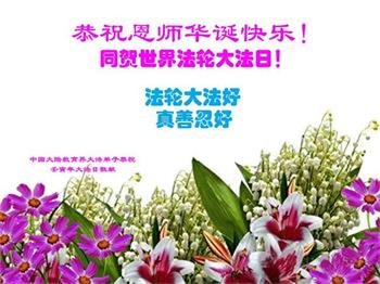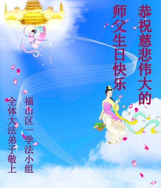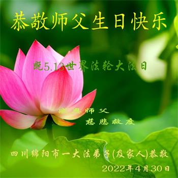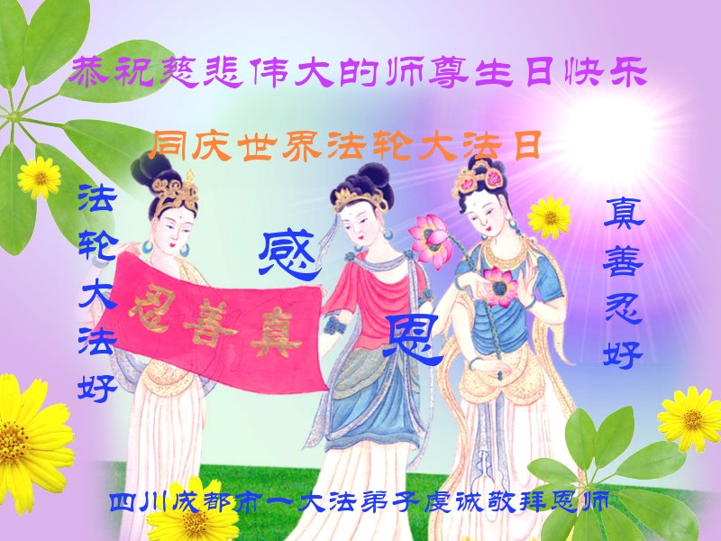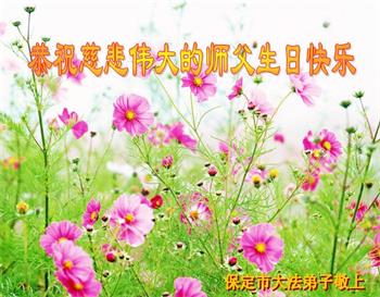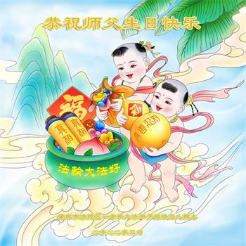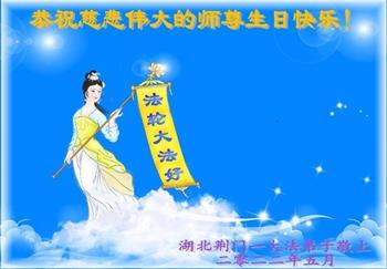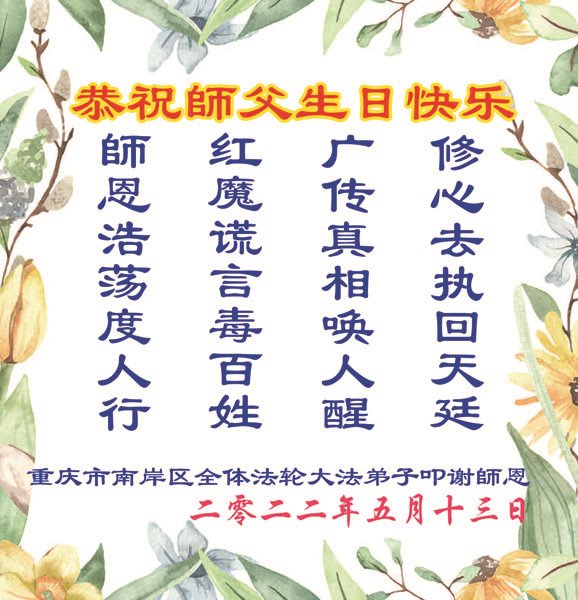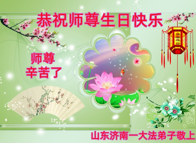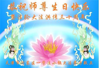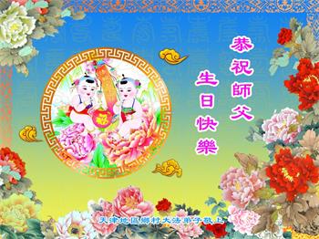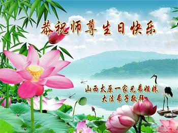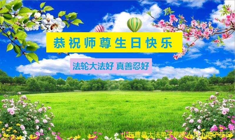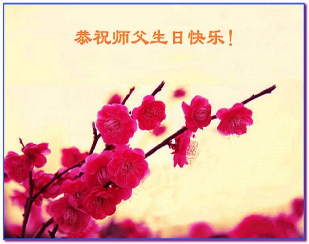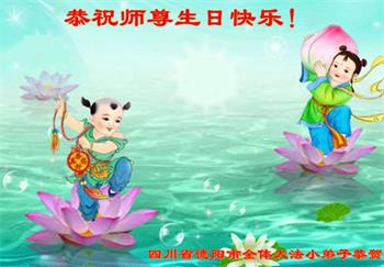 成都市一中学教师学法小组大法弟子带着满满的祝福:师父,请接受我们发自心灵深处的无限感恩与叩拜!请让我们对您说一声“师父,您辛苦了!弟子想念您!祝您生日快乐!”