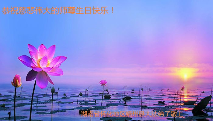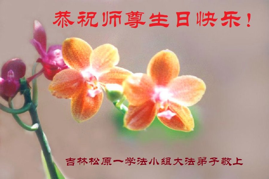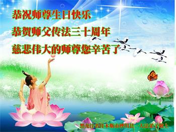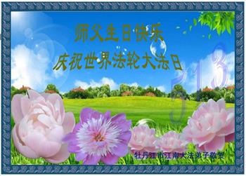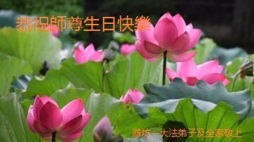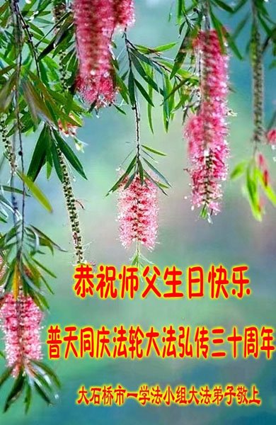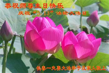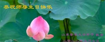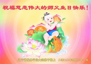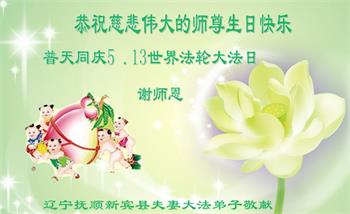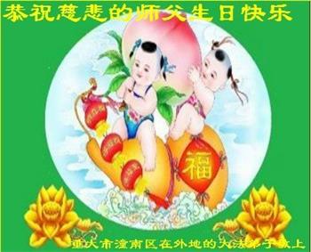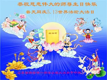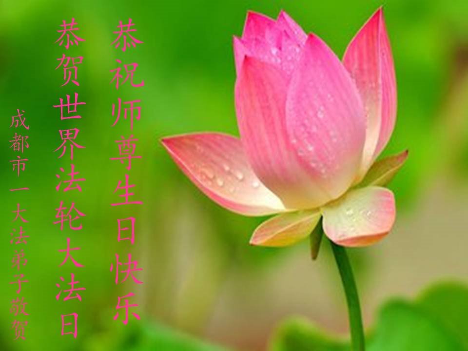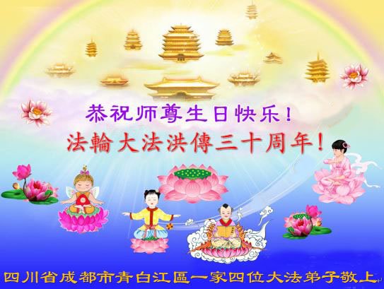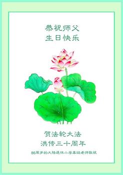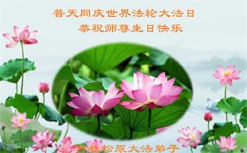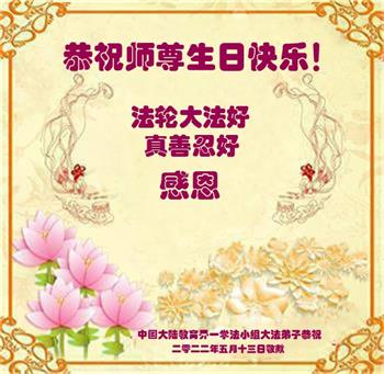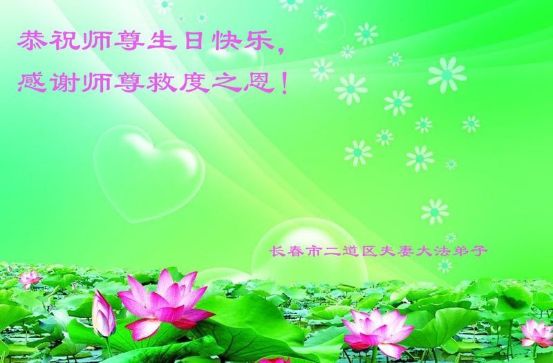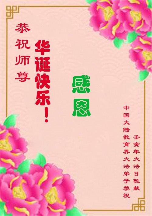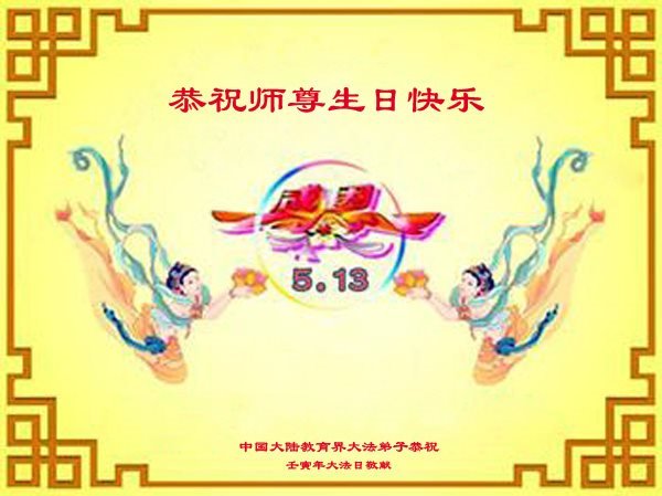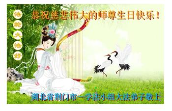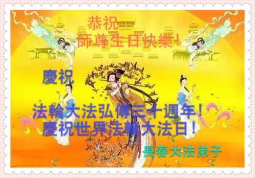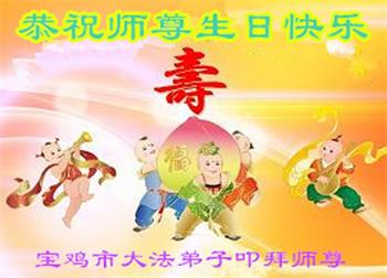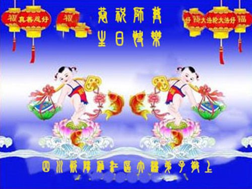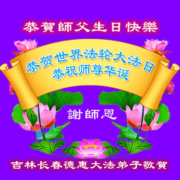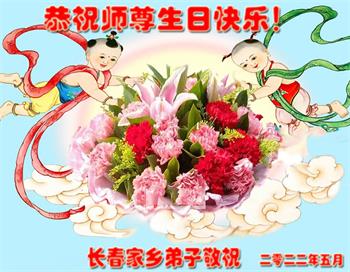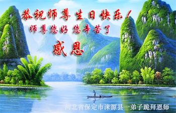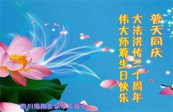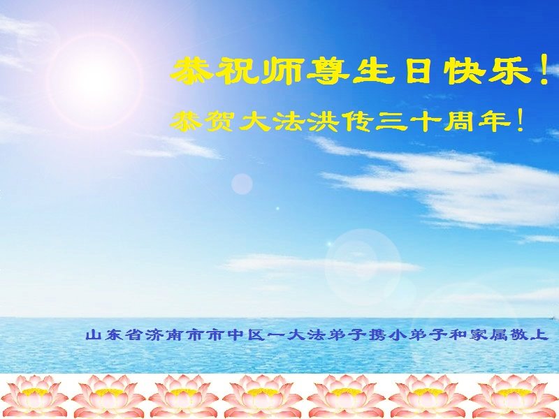成都市一中学教师学法小组大法弟子带着满满的祝福:师父,请接受我们发自心灵深处的无限感恩与叩拜!请让我们对您说一声“师父,您辛苦了!弟子想念您!祝您生日快乐!”