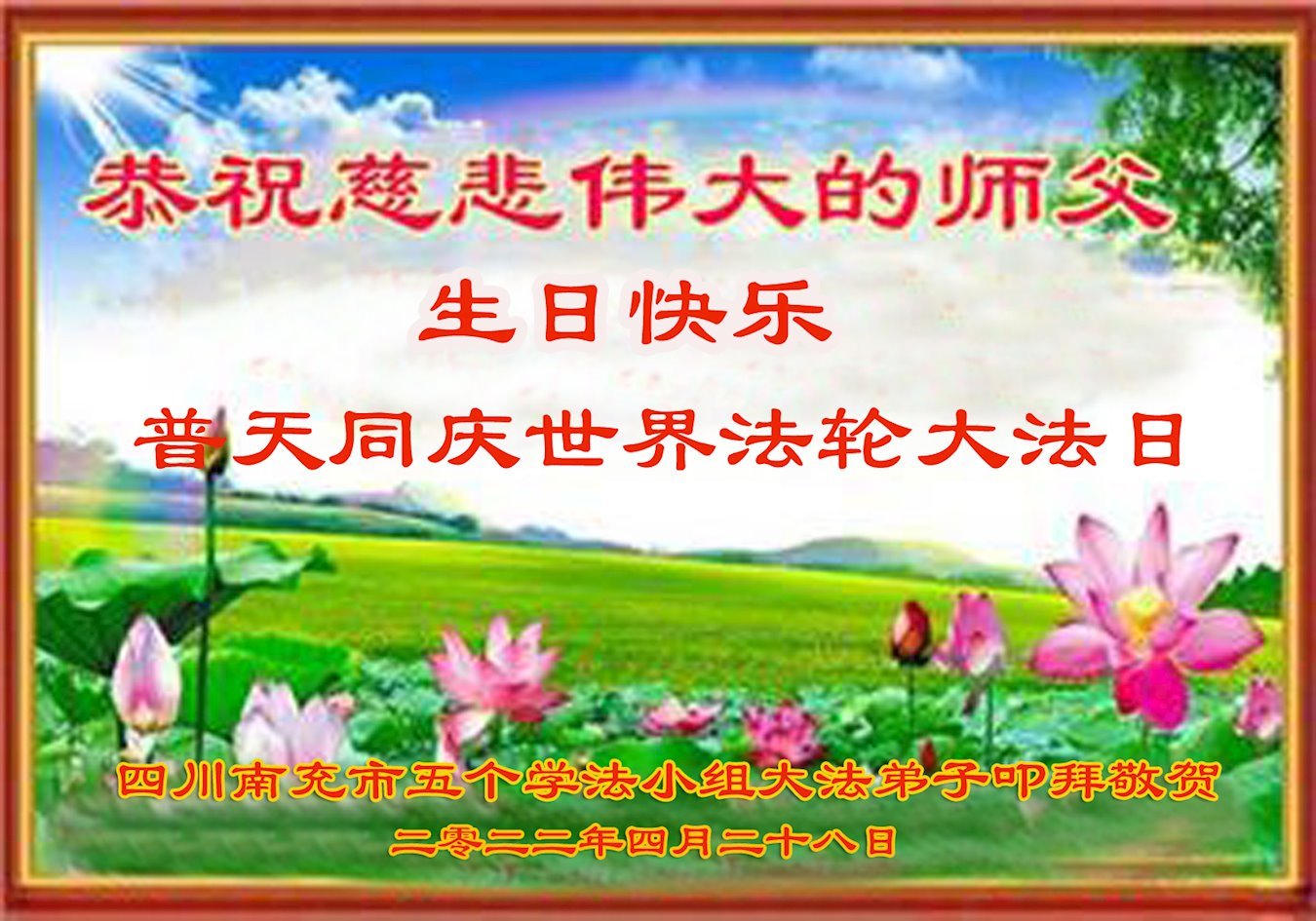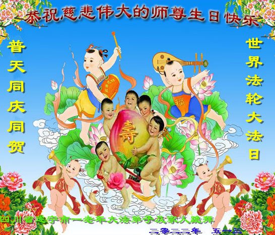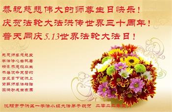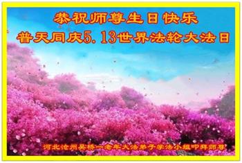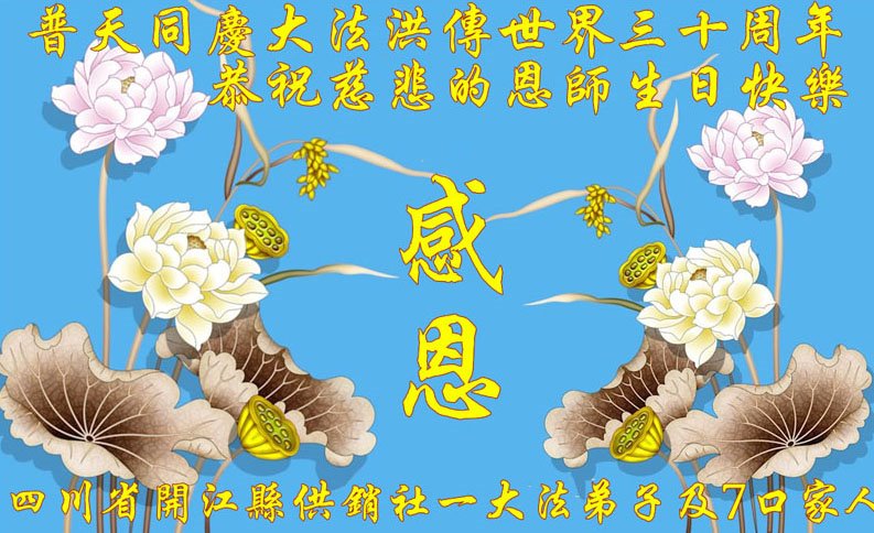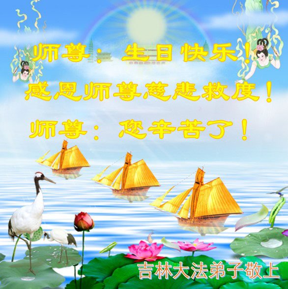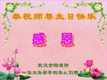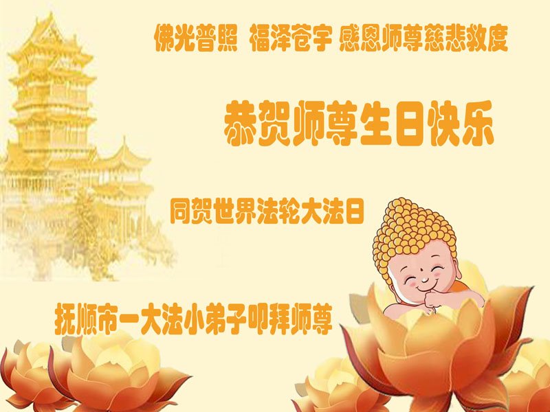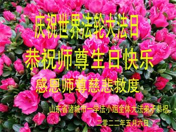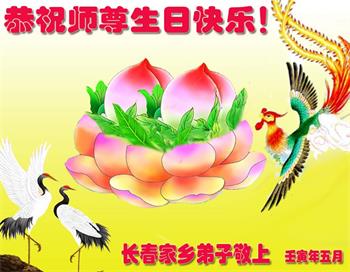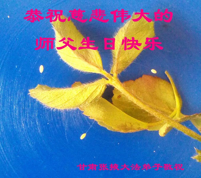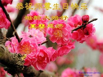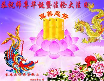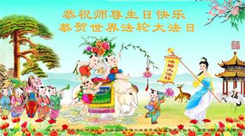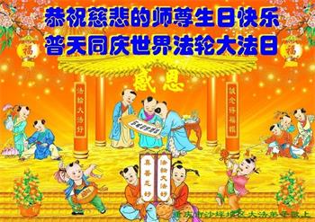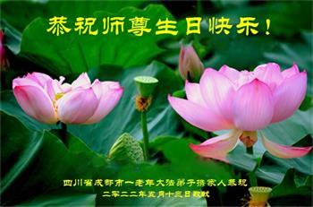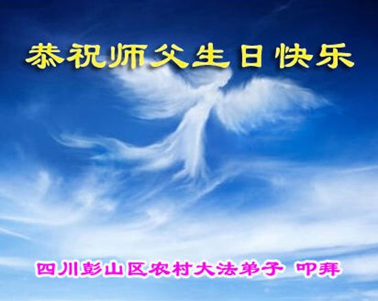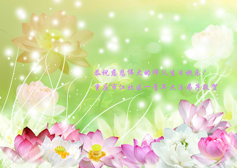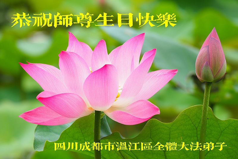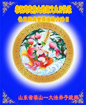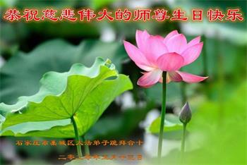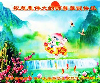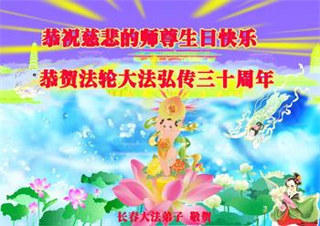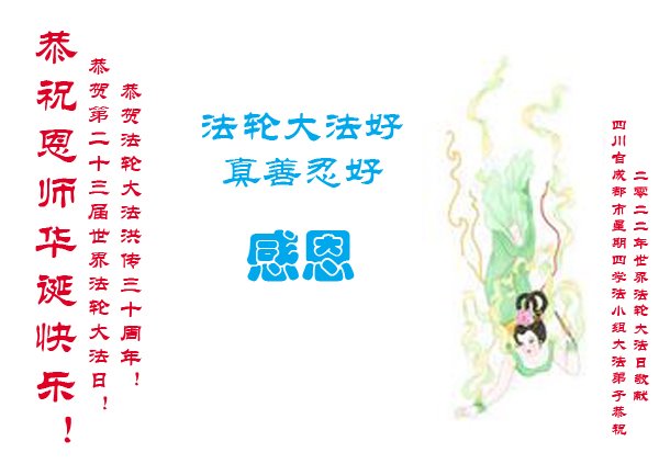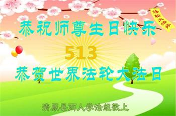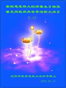成都市一中学教师学法小组大法弟子带着满满的祝福:师父,请接受我们发自心灵深处的无限感恩与叩拜!请让我们对您说一声“师父,您辛苦了!弟子想念您!祝您生日快乐!”