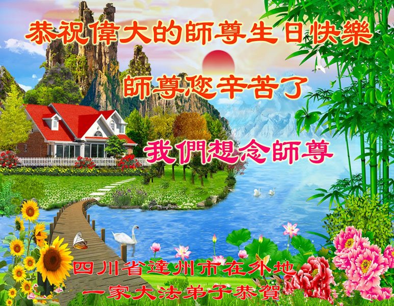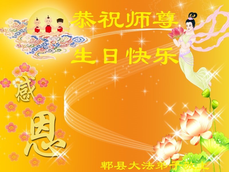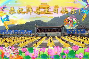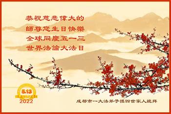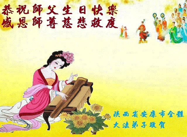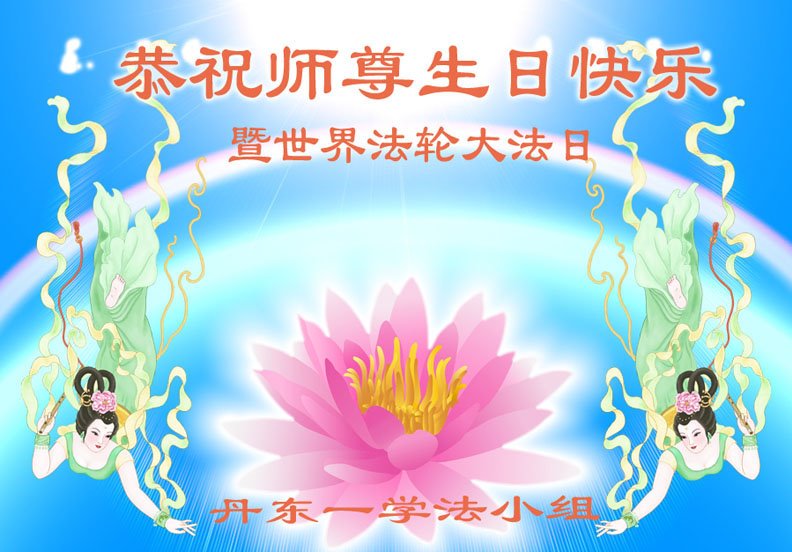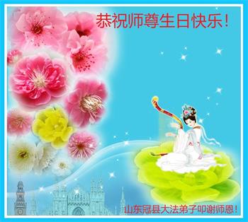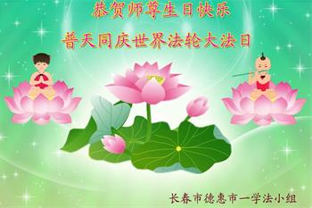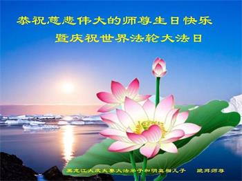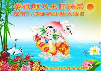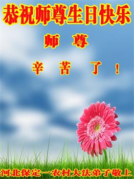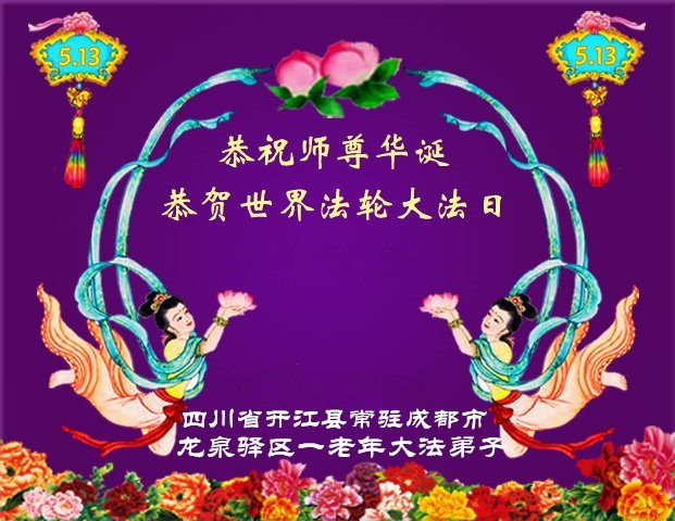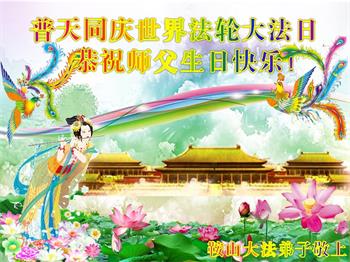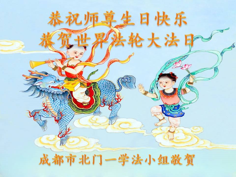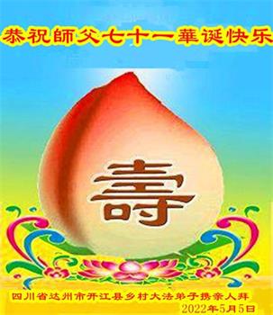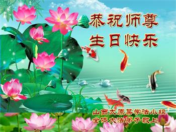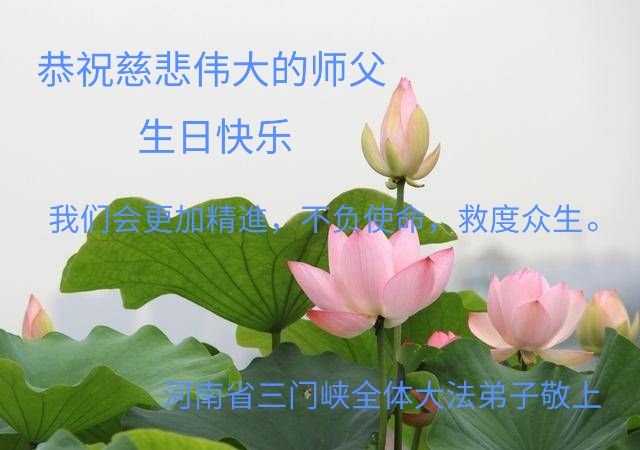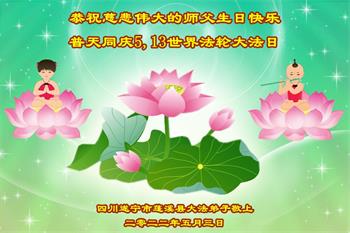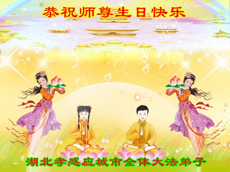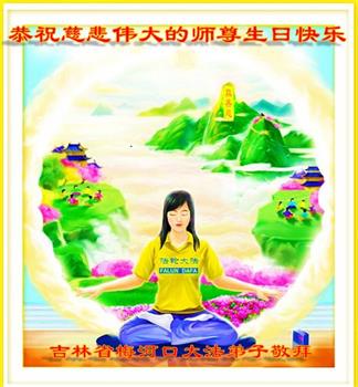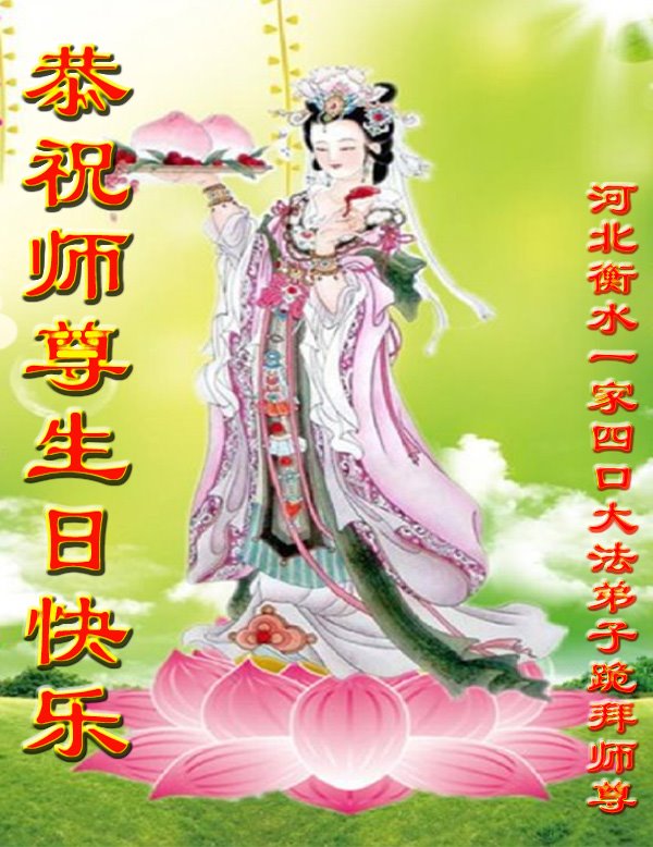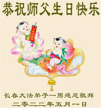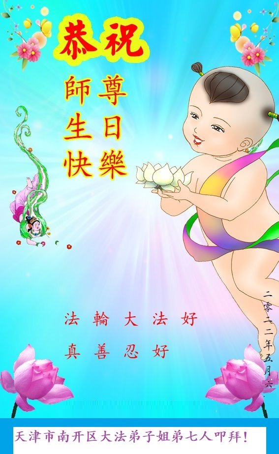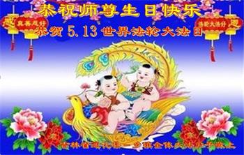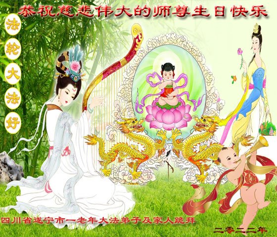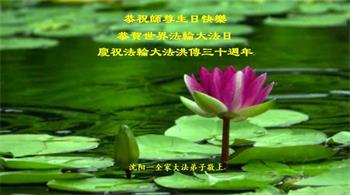 成都市一中学教师学法小组大法弟子带着满满的祝福:师父,请接受我们发自心灵深处的无限感恩与叩拜!请让我们对您说一声“师父,您辛苦了!弟子想念您!祝您生日快乐!”