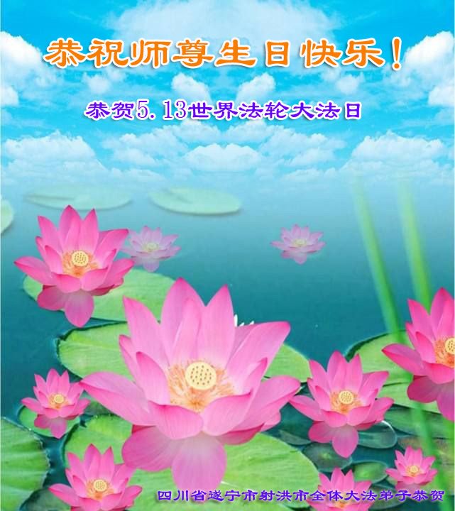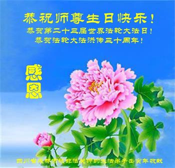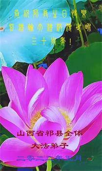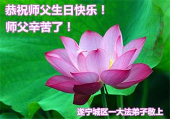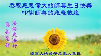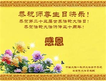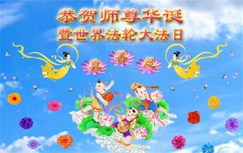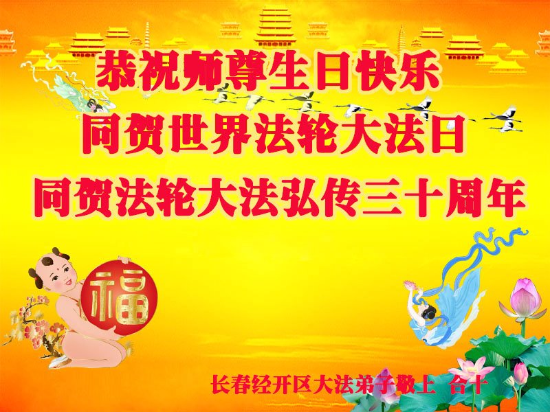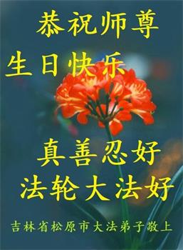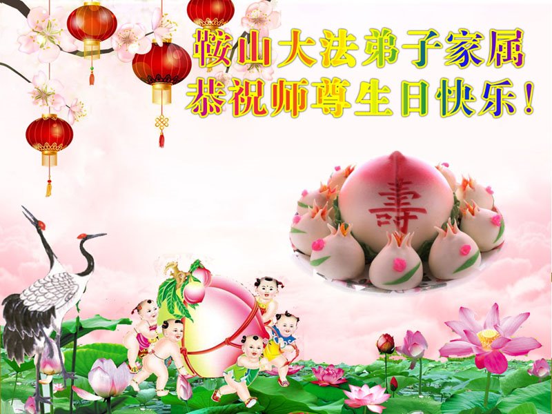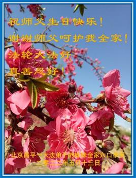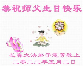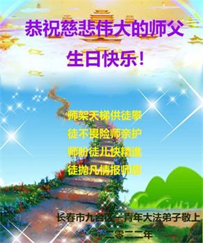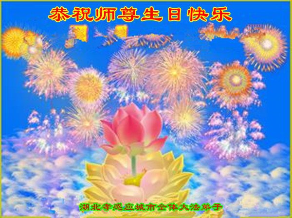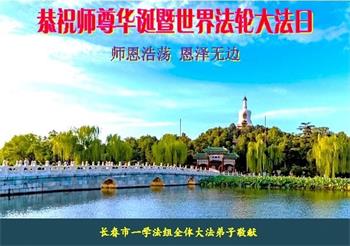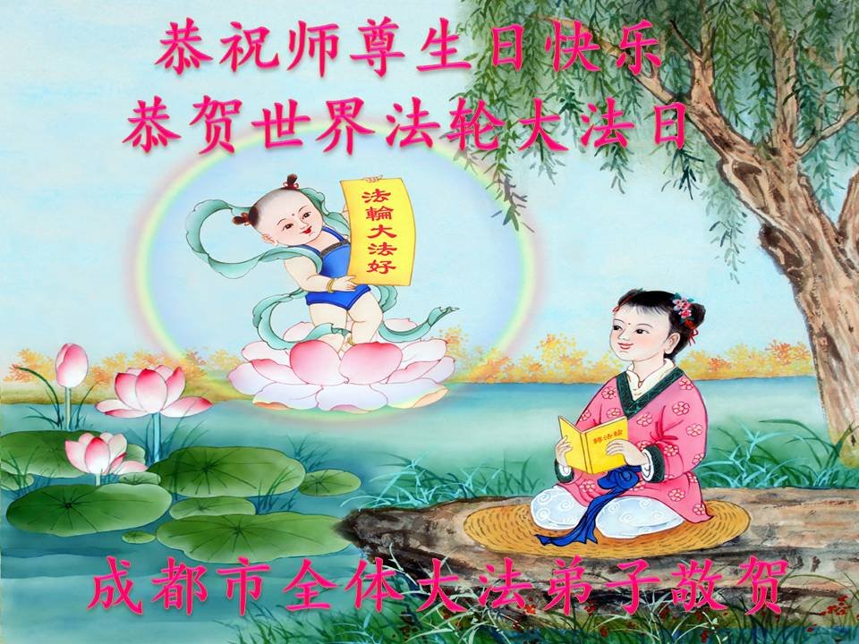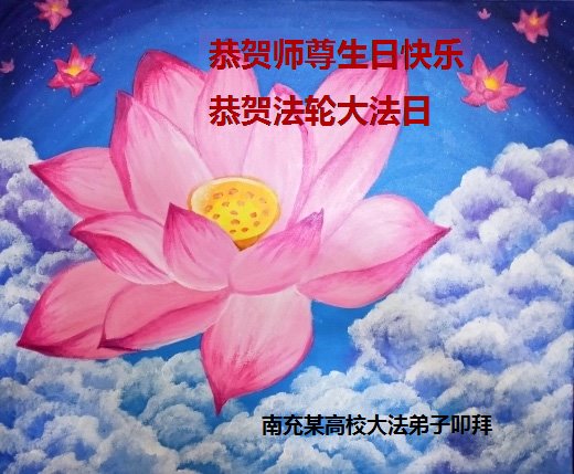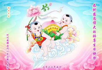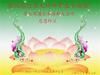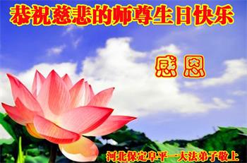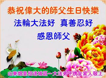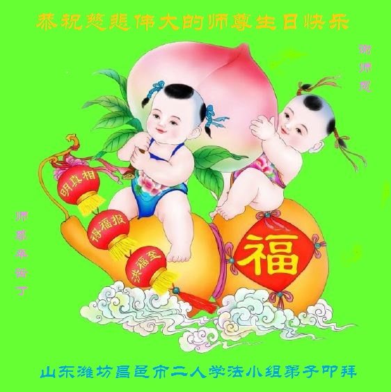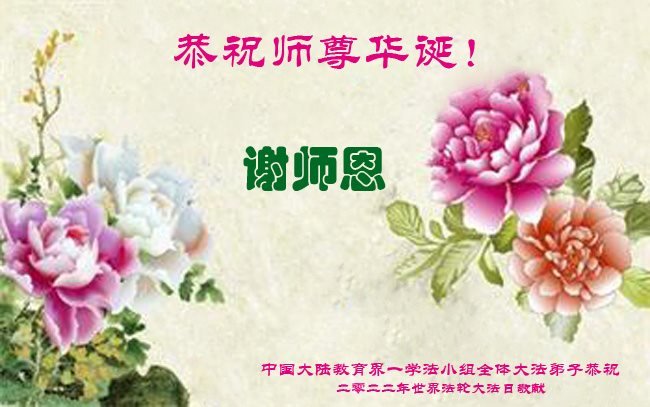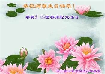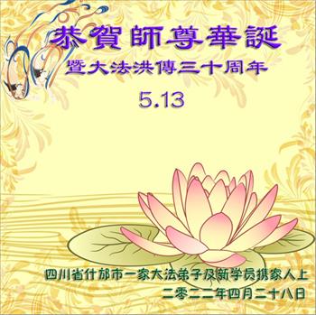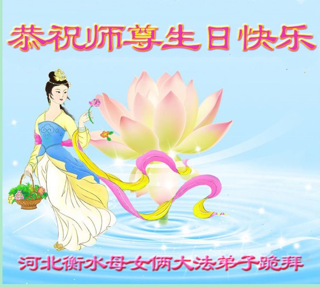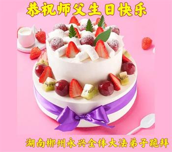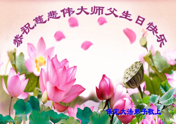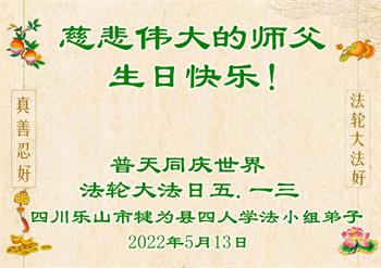成都市一中学教师学法小组大法弟子带着满满的祝福:师父,请接受我们发自心灵深处的无限感恩与叩拜!请让我们对您说一声“师父,您辛苦了!弟子想念您!祝您生日快乐!”