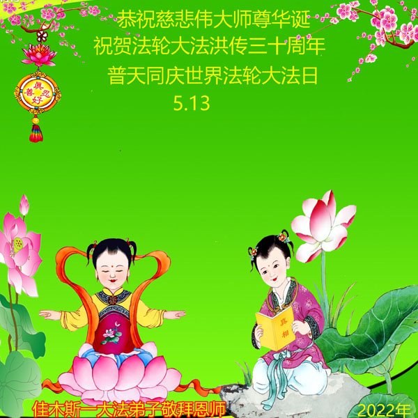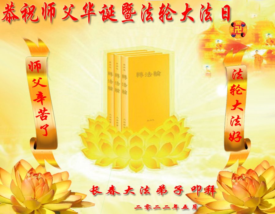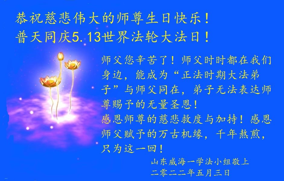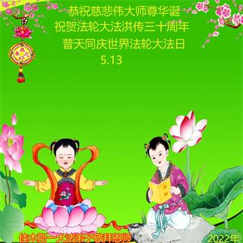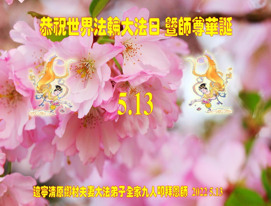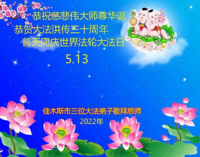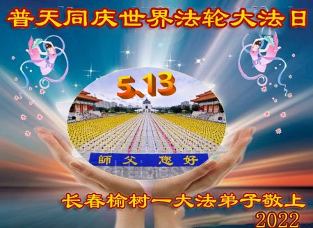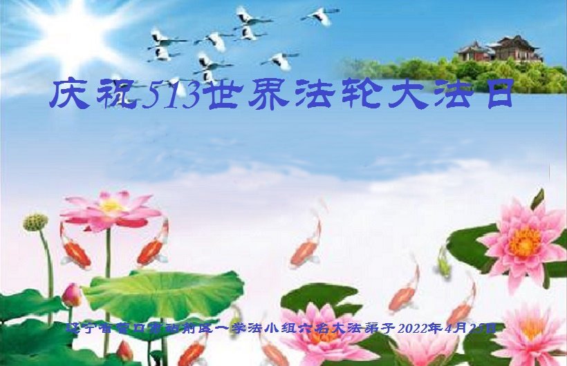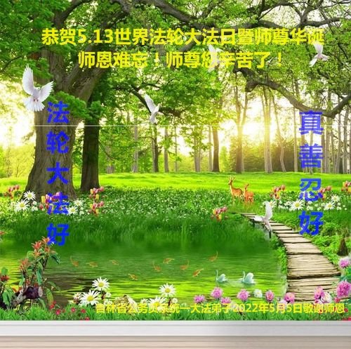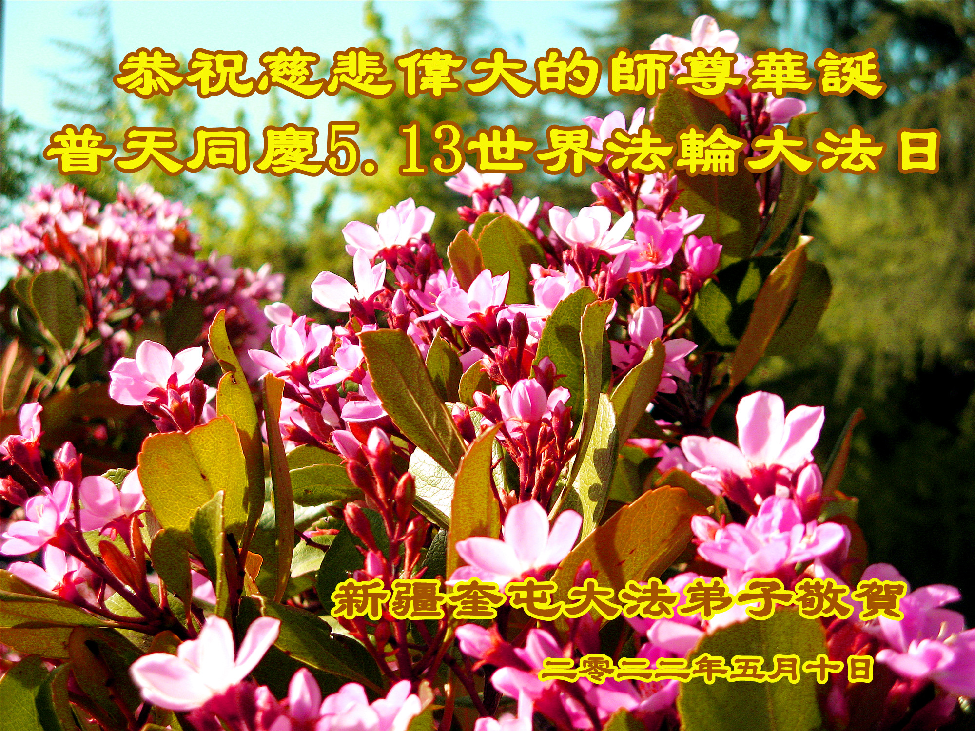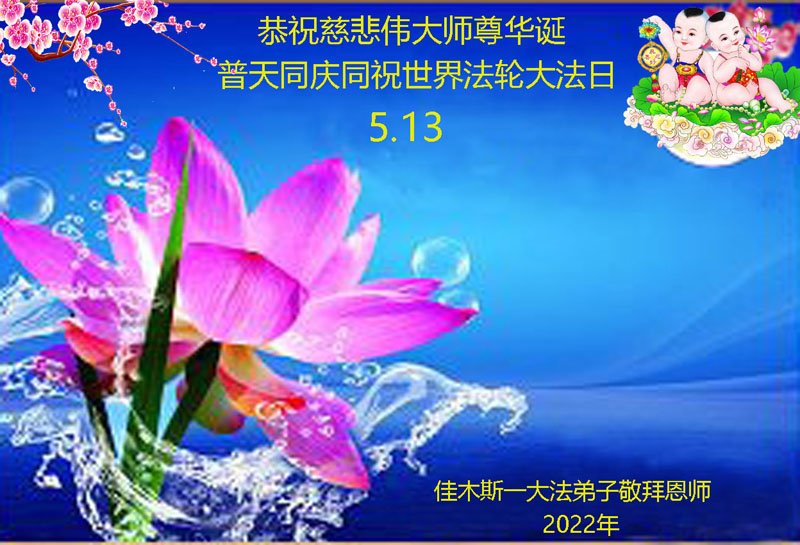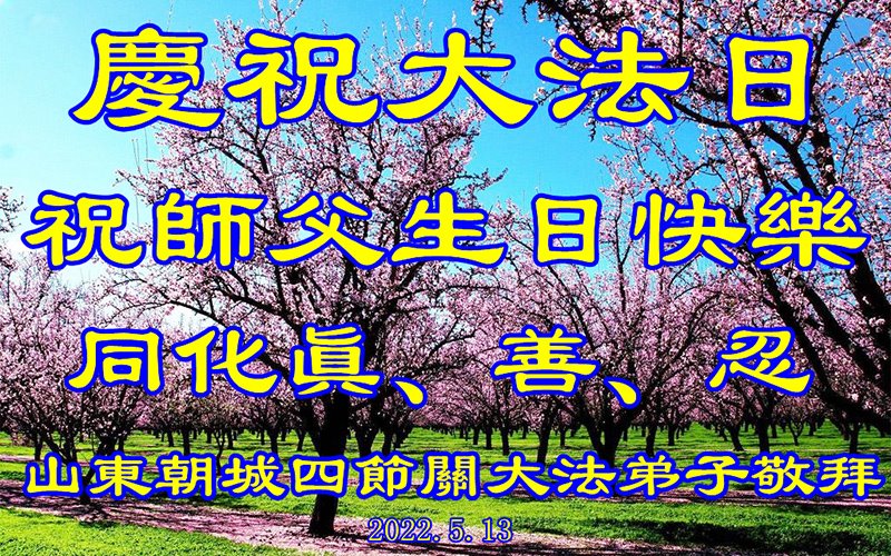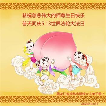 二零二二年五月十三日世界法轮大法日即将到来,我们有缘走上了修炼大法的路,师尊给每个大法弟子净化身体,教诲我们用真善忍标准要求自己。我们感恩师尊!弟子多学法,做事多为别人着想,遇事向内找。做好三件事,多救度有缘的众生。精進、再精進,完成史前大愿。