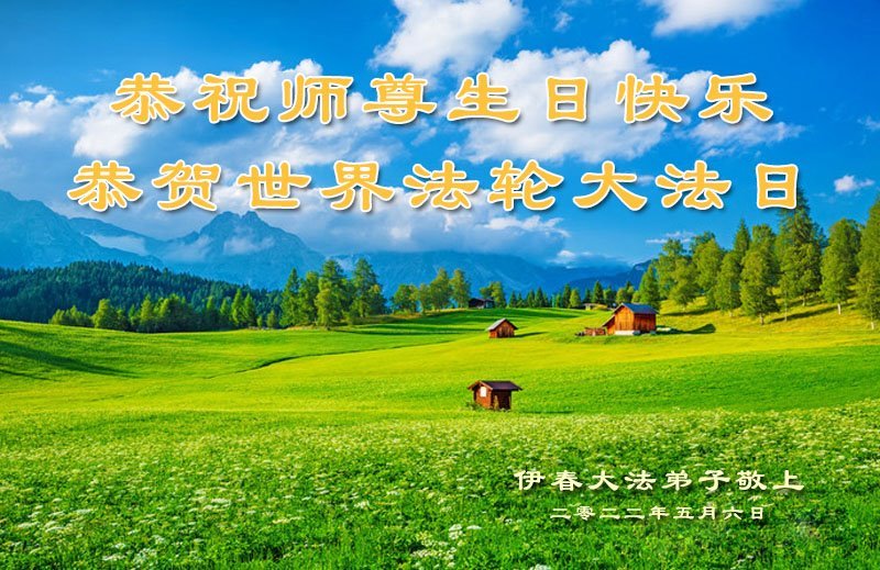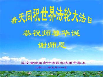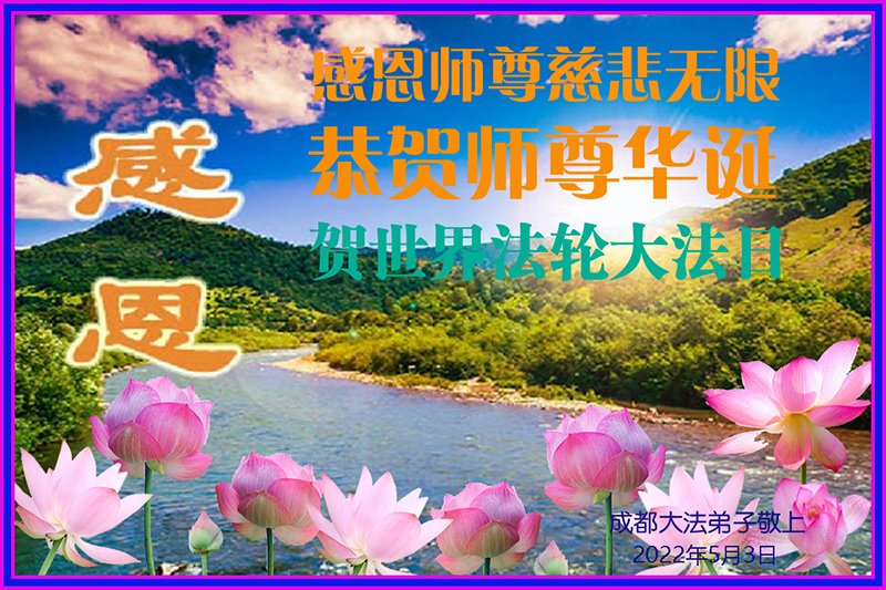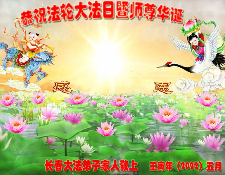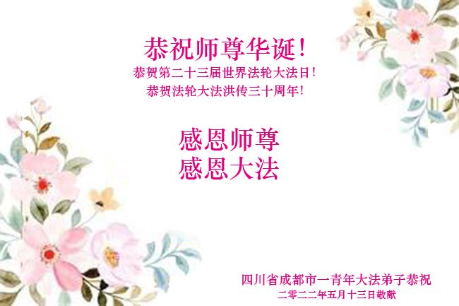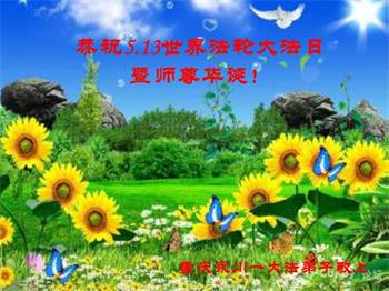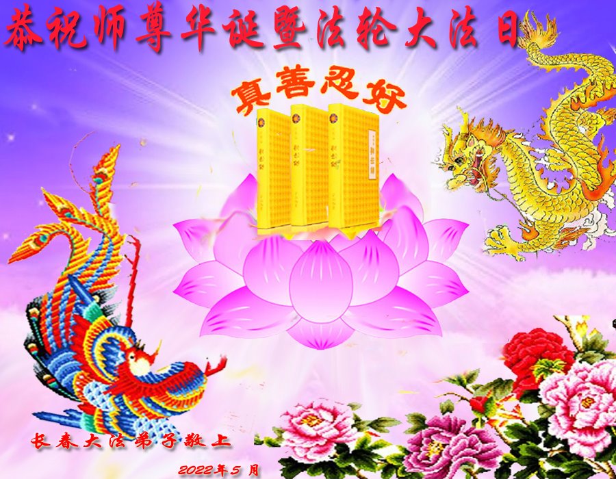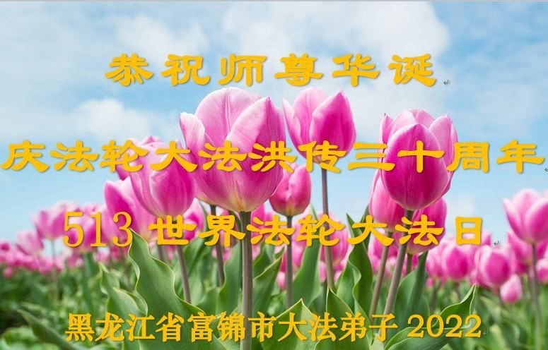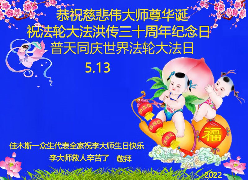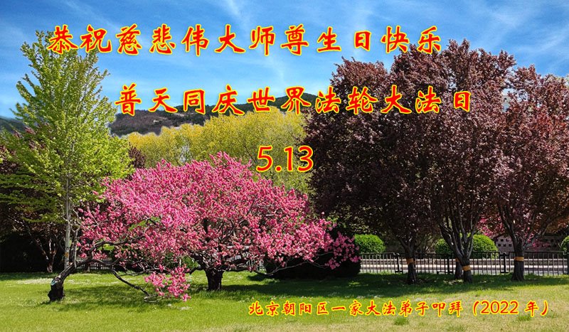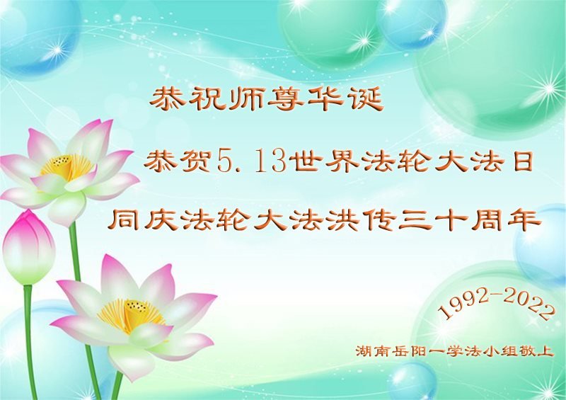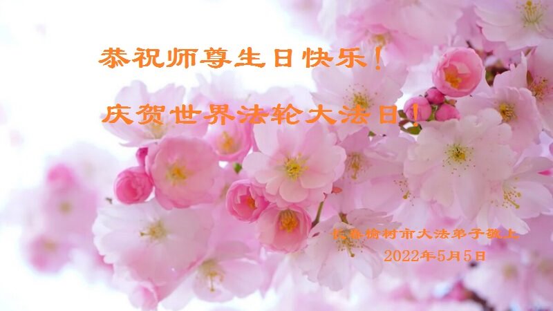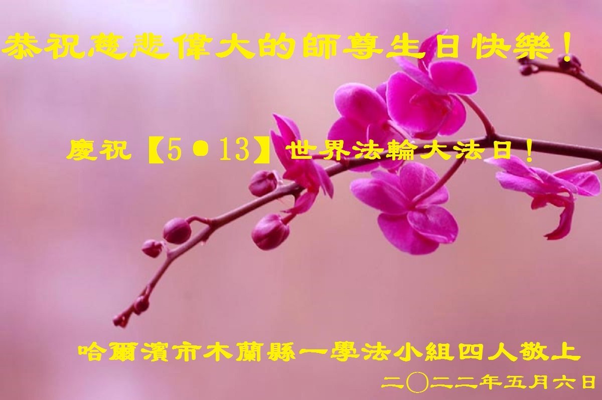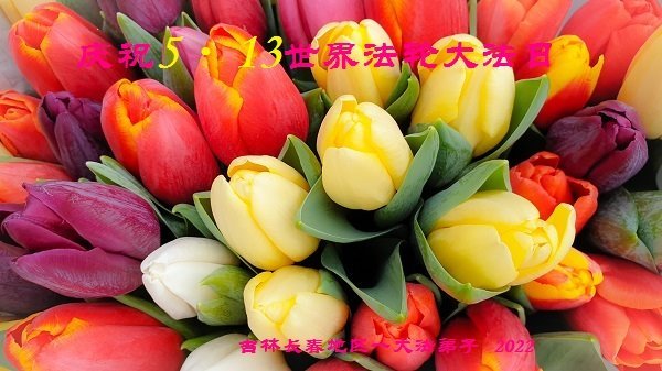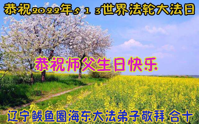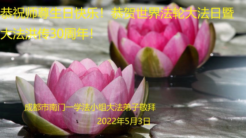 二零二二年五月十三日世界法轮大法日即将到来,我们有缘走上了修炼大法的路,师尊给每个大法弟子净化身体,教诲我们用真善忍标准要求自己。我们感恩师尊!弟子多学法,做事多为别人着想,遇事向内找。做好三件事,多救度有缘的众生。精進、再精進,完成史前大愿。