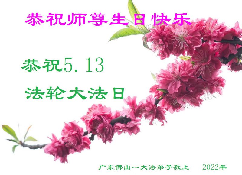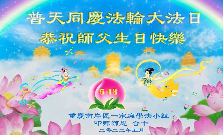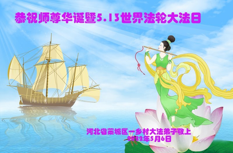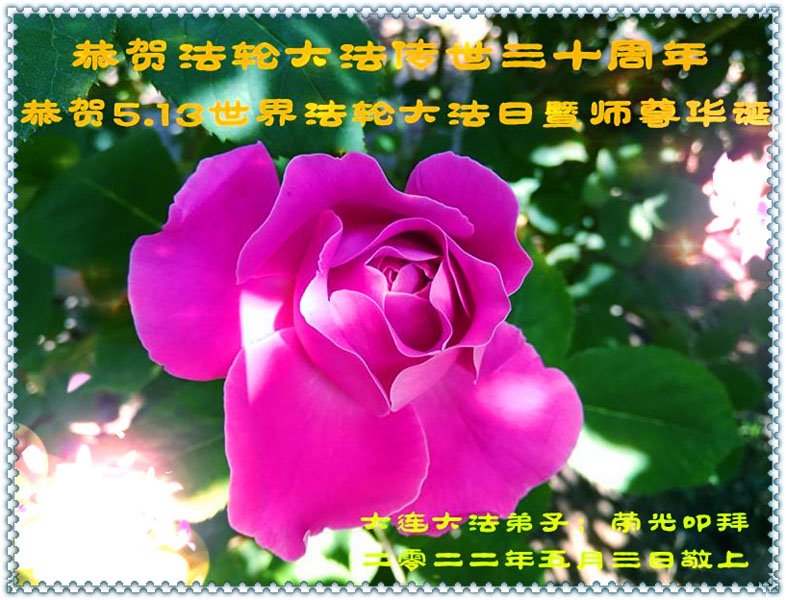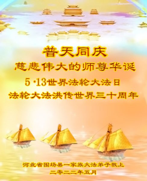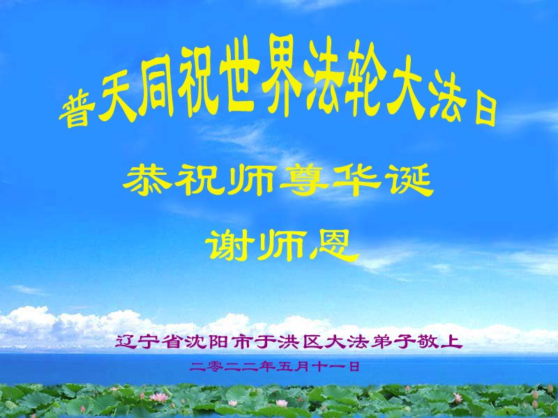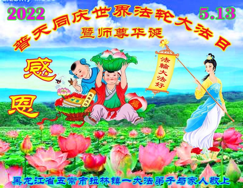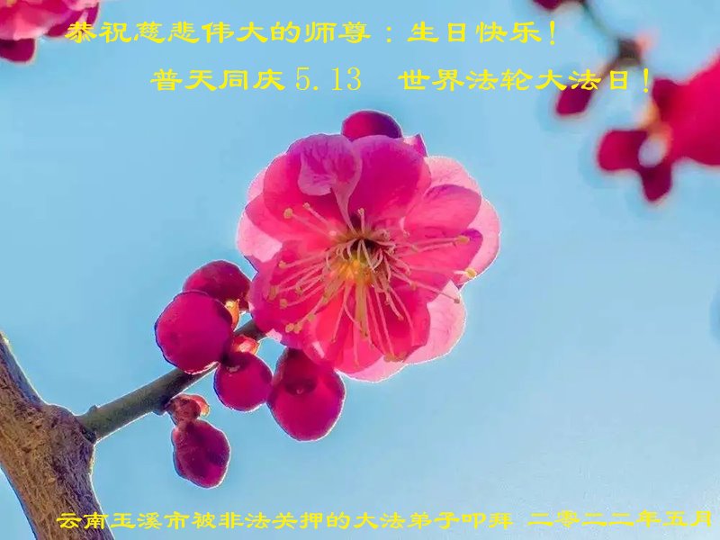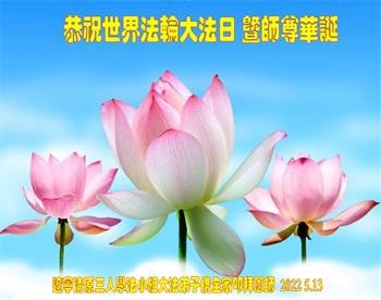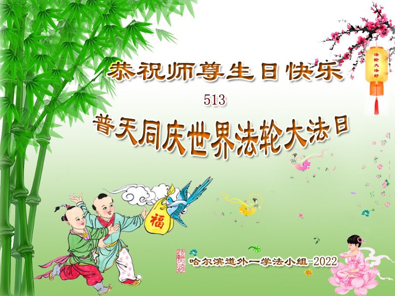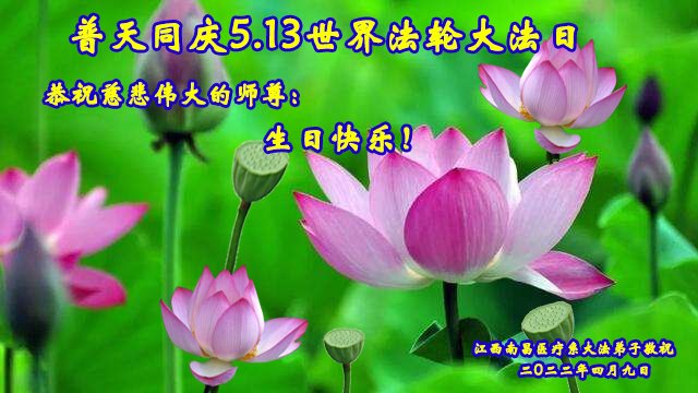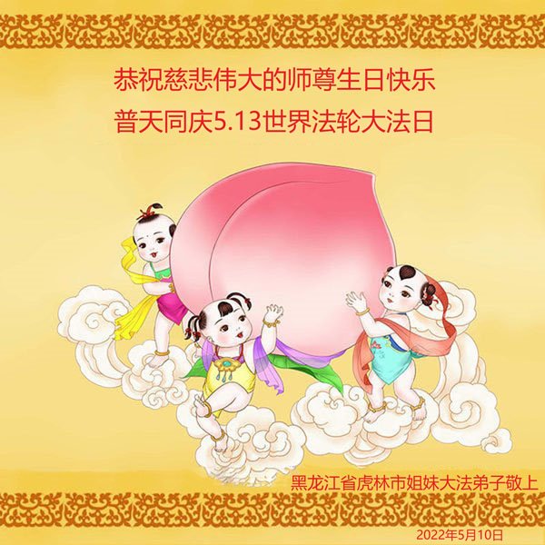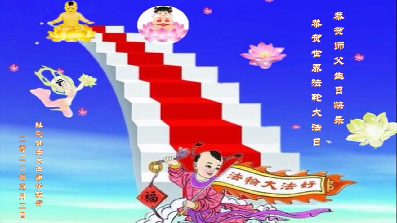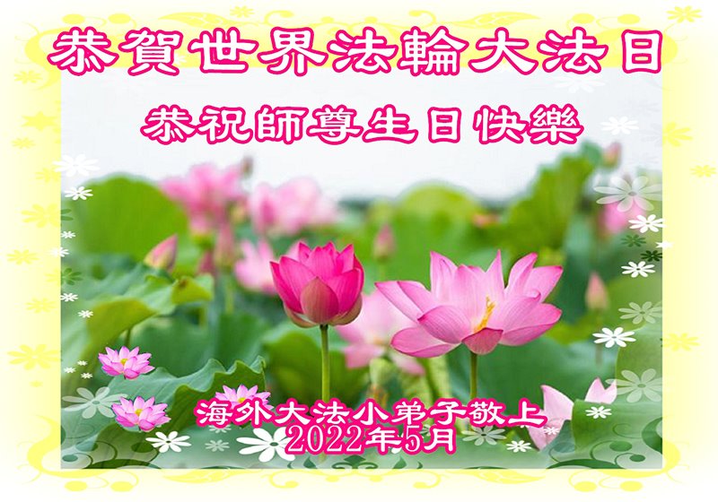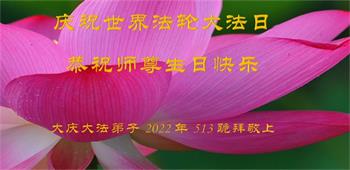 二零二二年五月十三日世界法轮大法日即将到来,我们有缘走上了修炼大法的路,师尊给每个大法弟子净化身体,教诲我们用真善忍标准要求自己。我们感恩师尊!弟子多学法,做事多为别人着想,遇事向内找。做好三件事,多救度有缘的众生。精進、再精進,完成史前大愿。