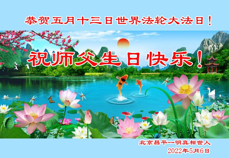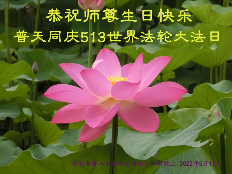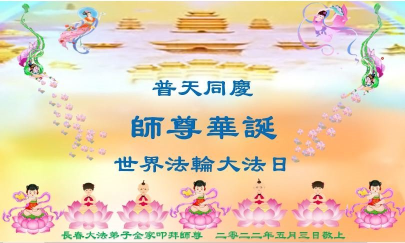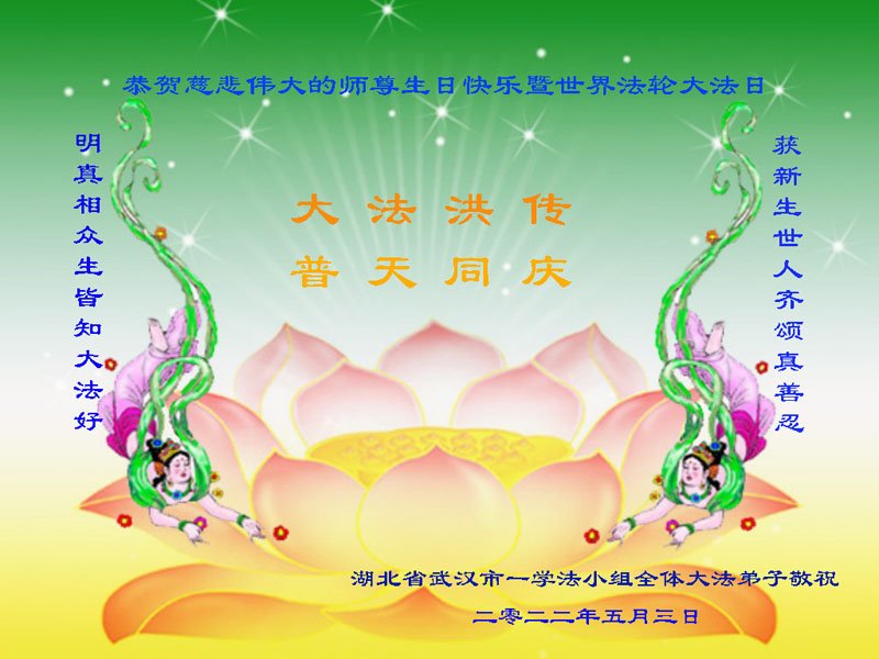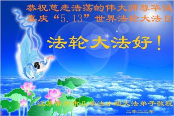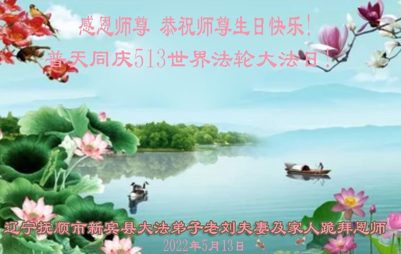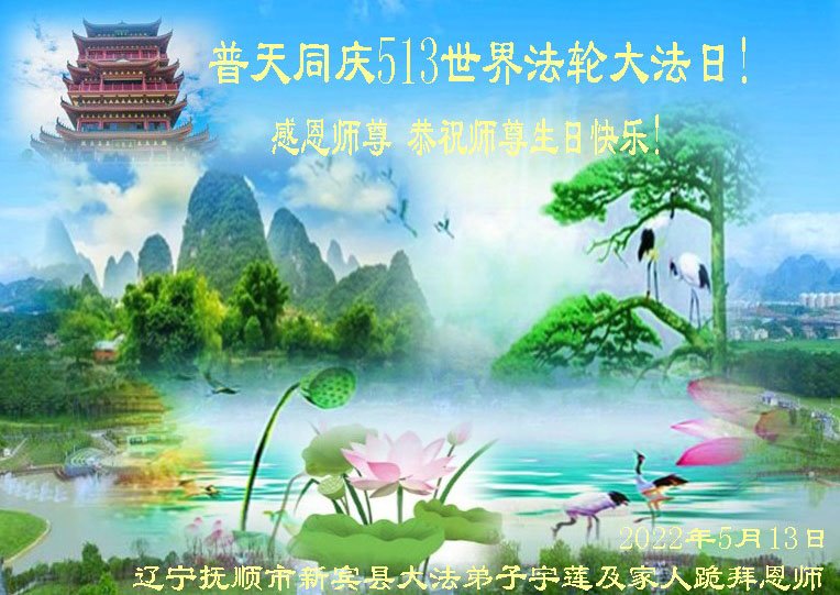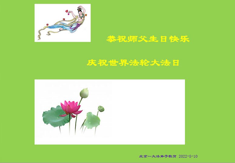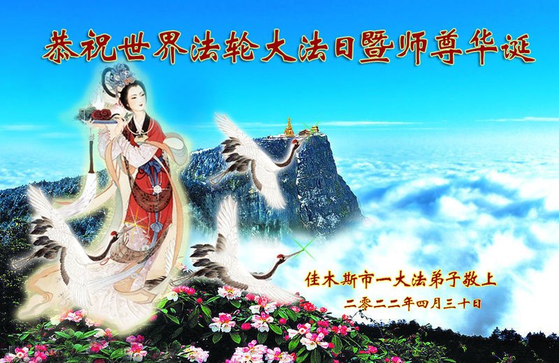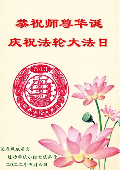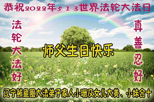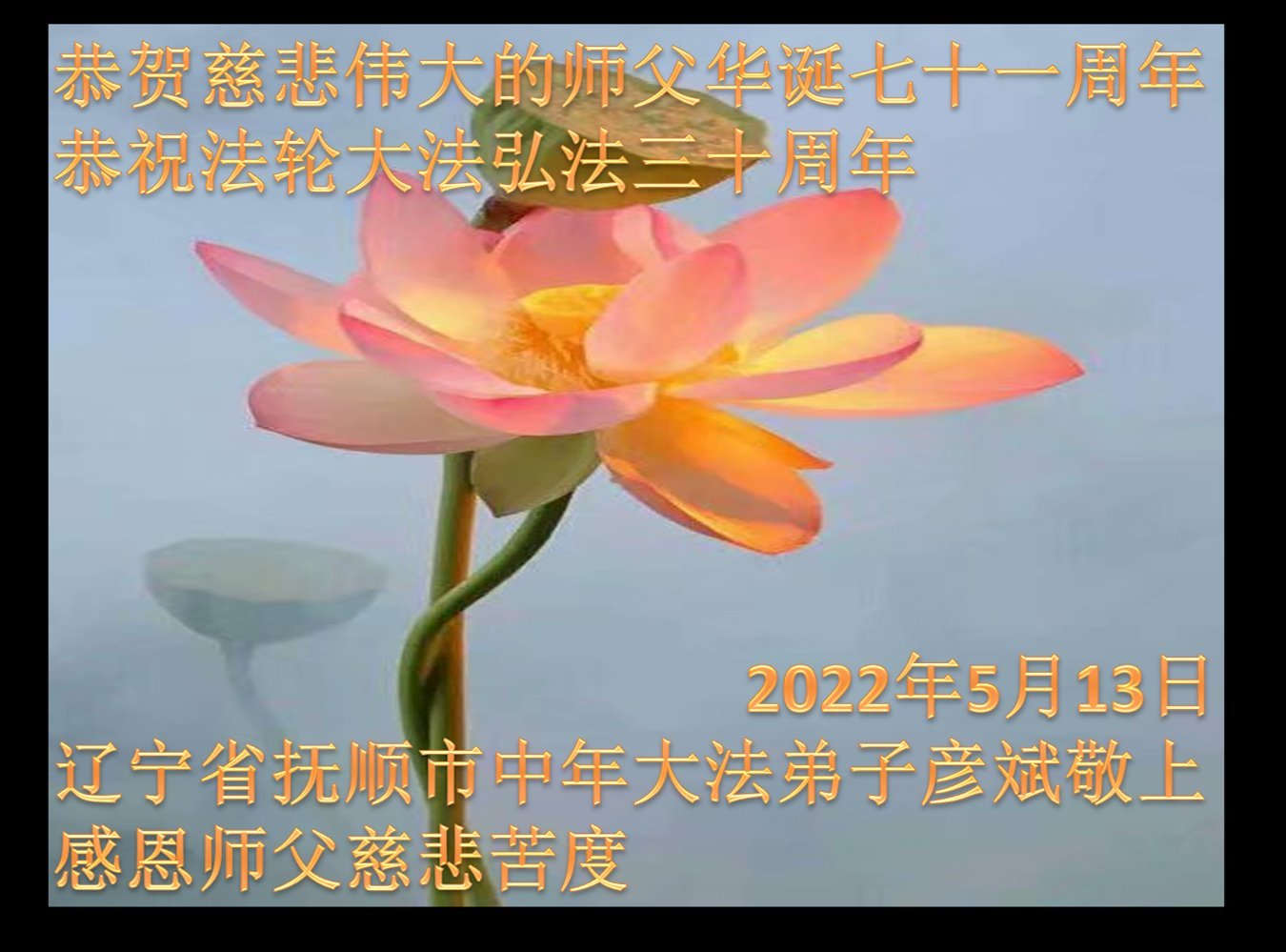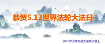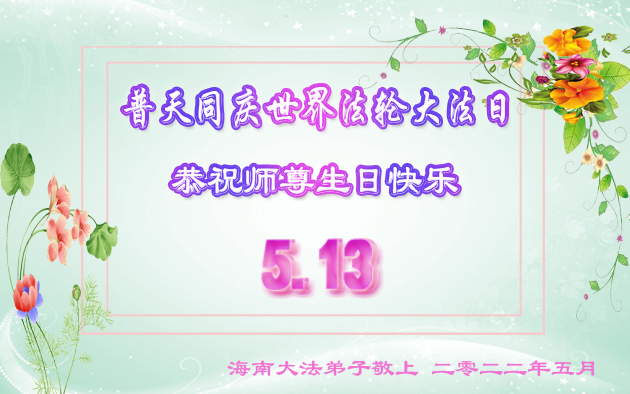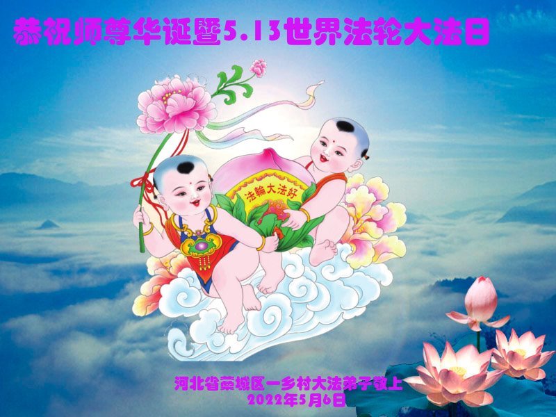 二零二二年五月十三日世界法轮大法日即将到来,我们有缘走上了修炼大法的路,师尊给每个大法弟子净化身体,教诲我们用真善忍标准要求自己。我们感恩师尊!弟子多学法,做事多为别人着想,遇事向内找。做好三件事,多救度有缘的众生。精進、再精進,完成史前大愿。