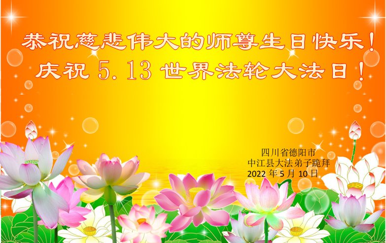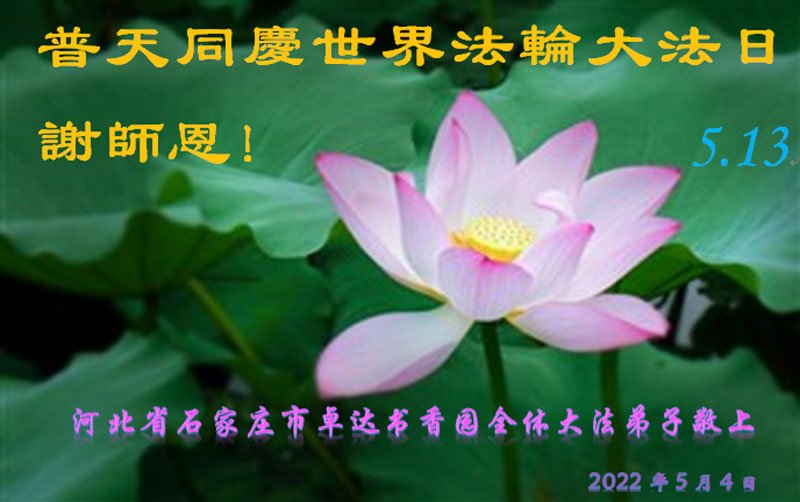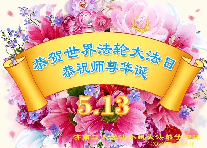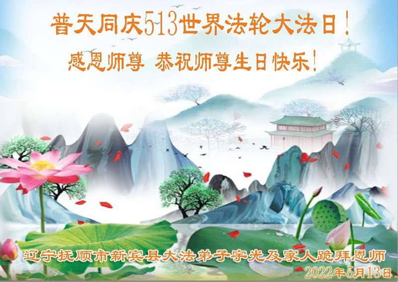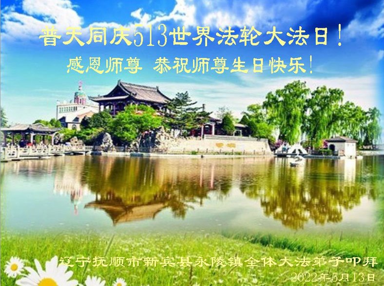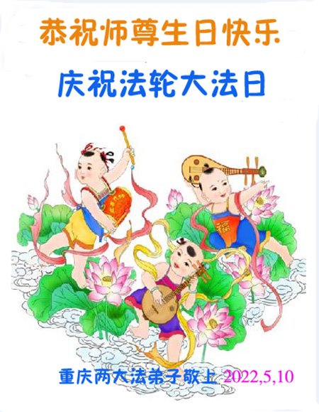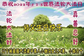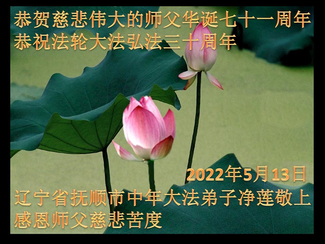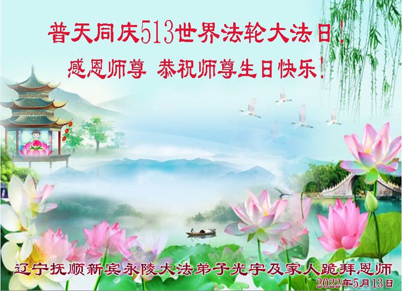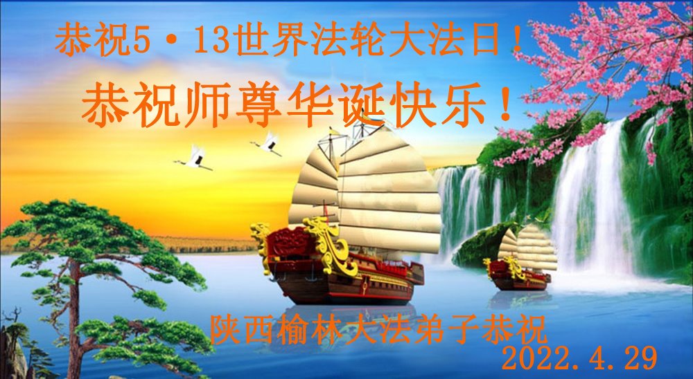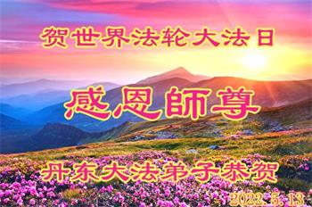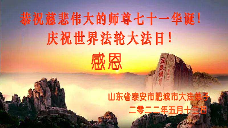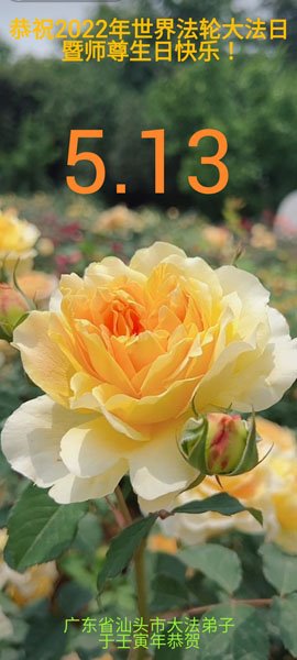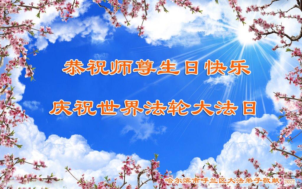 二零二二年五月十三日世界法轮大法日即将到来,我们有缘走上了修炼大法的路,师尊给每个大法弟子净化身体,教诲我们用真善忍标准要求自己。我们感恩师尊!弟子多学法,做事多为别人着想,遇事向内找。做好三件事,多救度有缘的众生。精進、再精進,完成史前大愿。