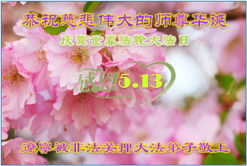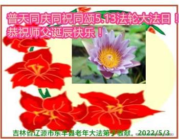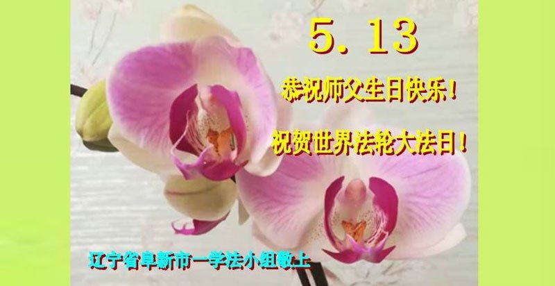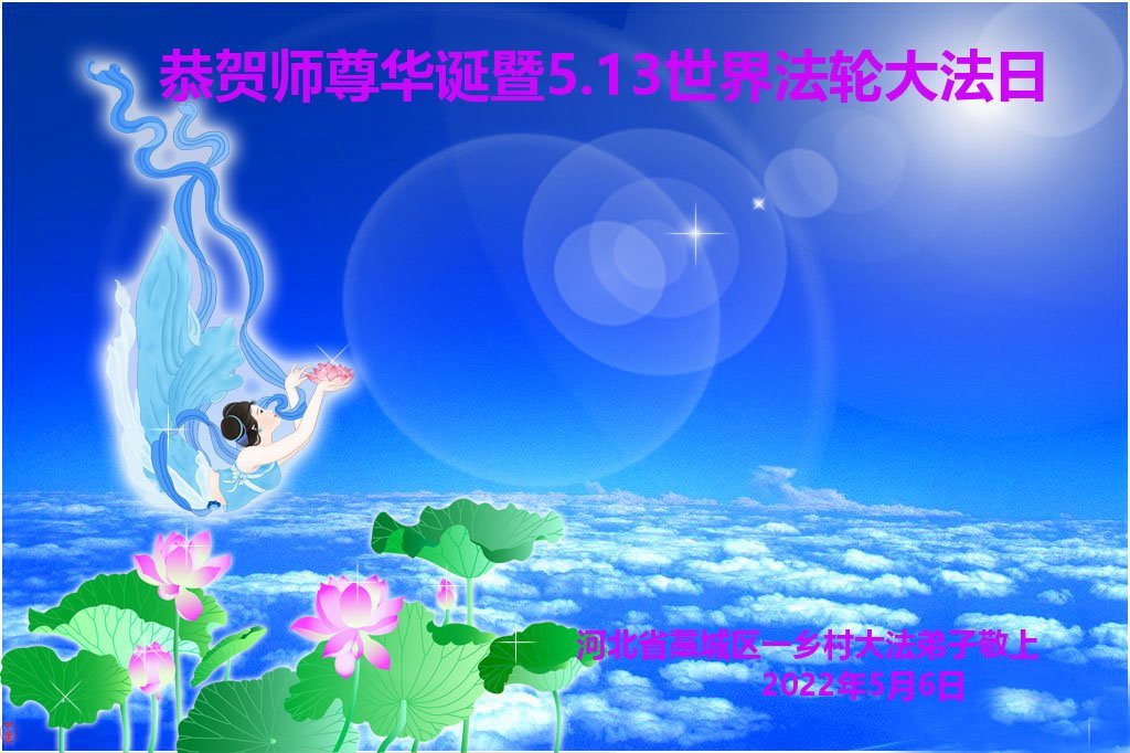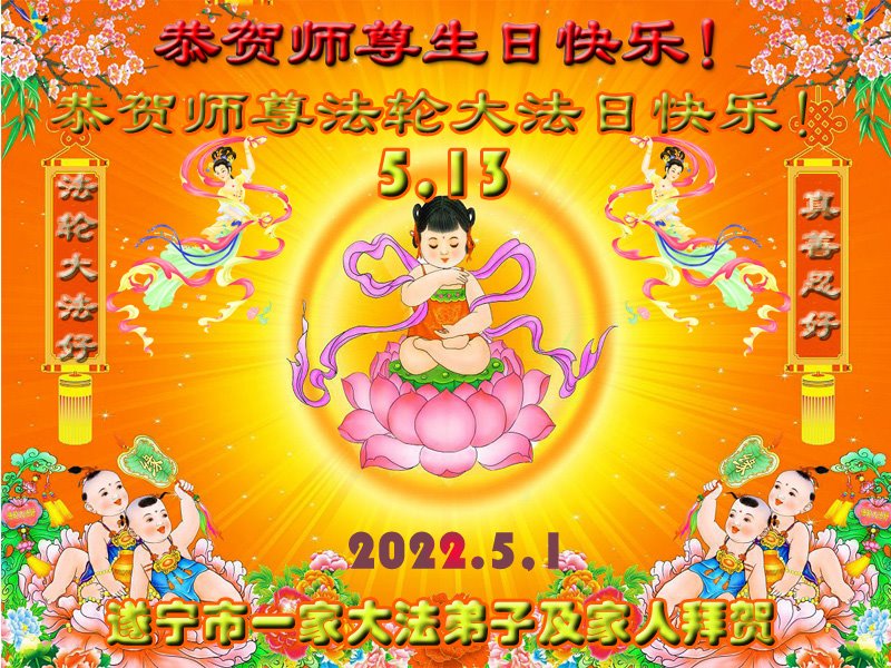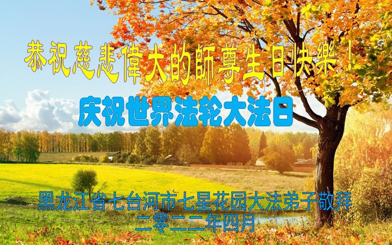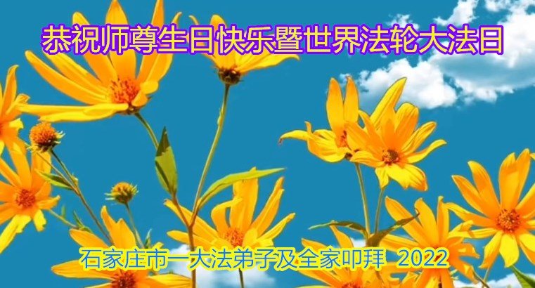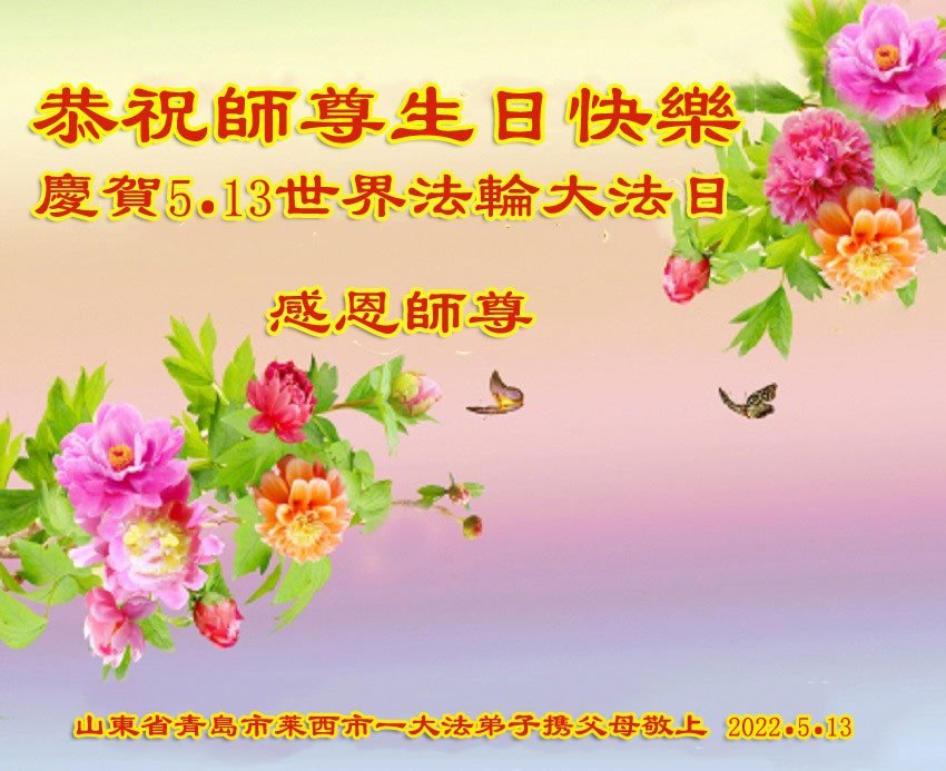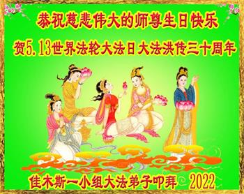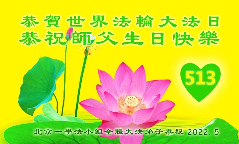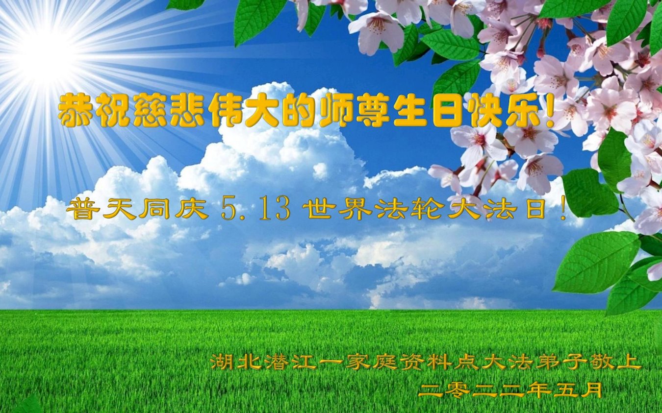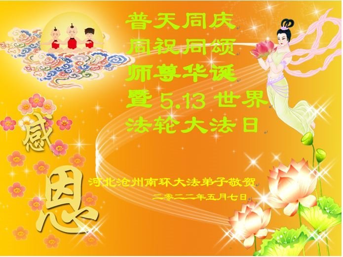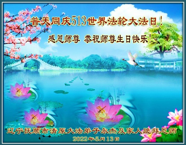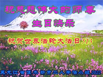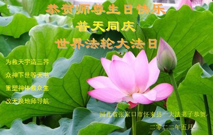 二零二二年五月十三日世界法轮大法日即将到来,我们有缘走上了修炼大法的路,师尊给每个大法弟子净化身体,教诲我们用真善忍标准要求自己。我们感恩师尊!弟子多学法,做事多为别人着想,遇事向内找。做好三件事,多救度有缘的众生。精進、再精進,完成史前大愿。