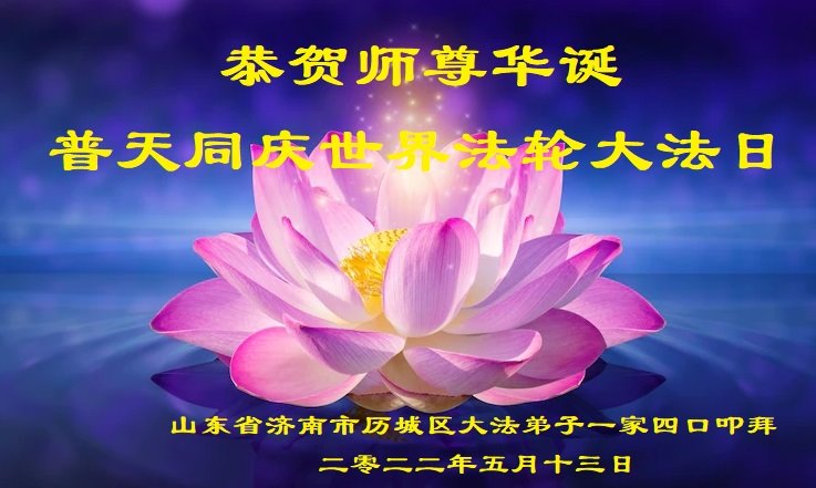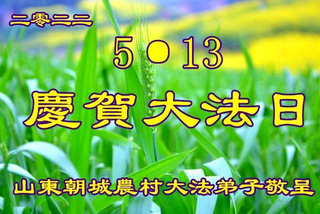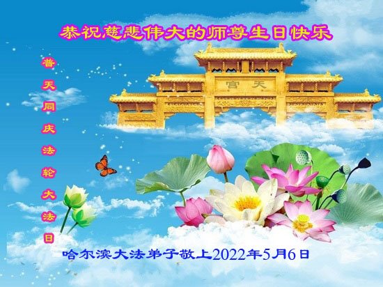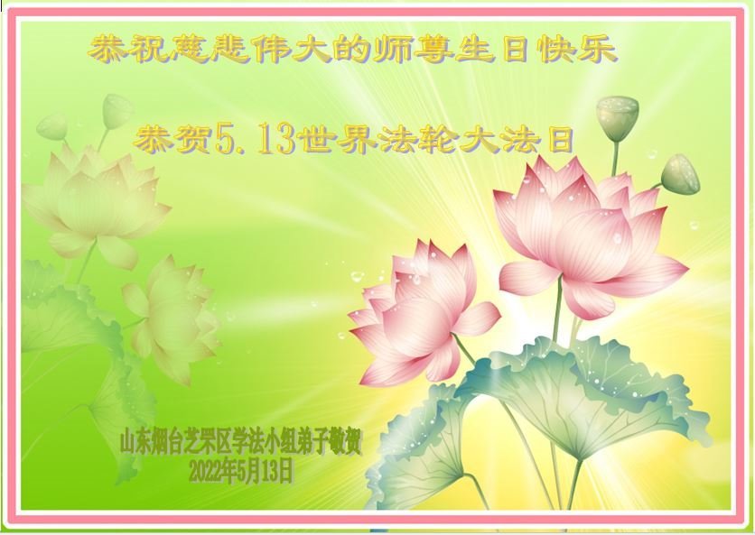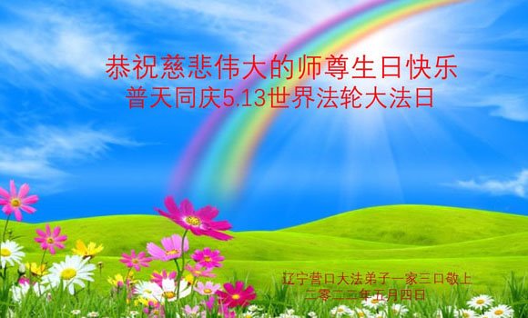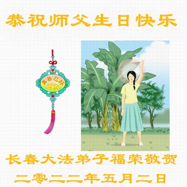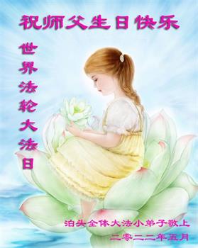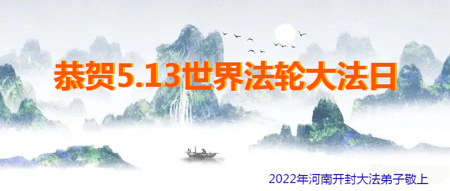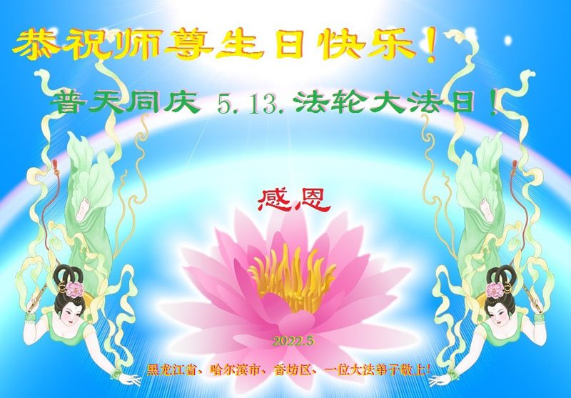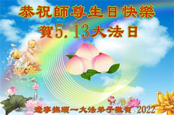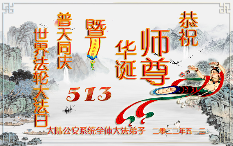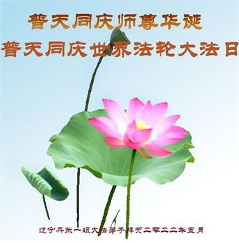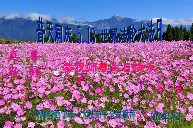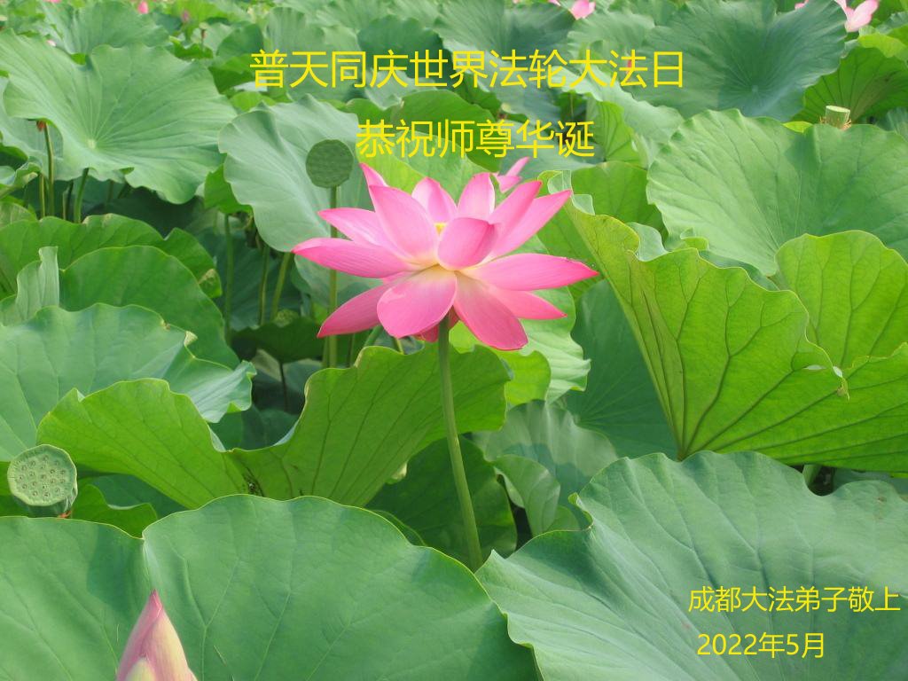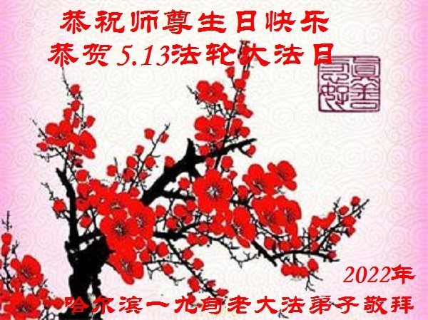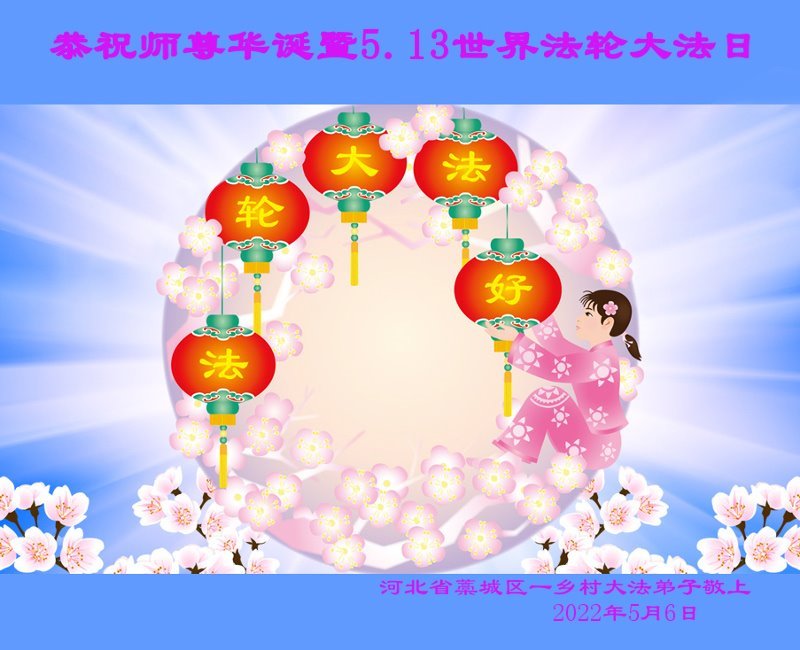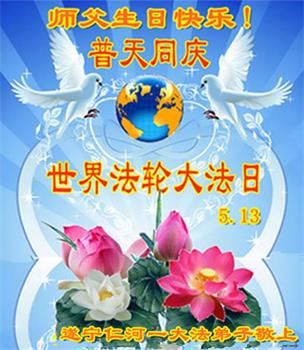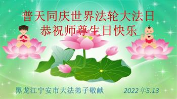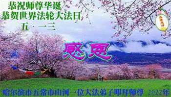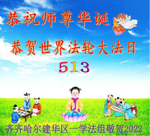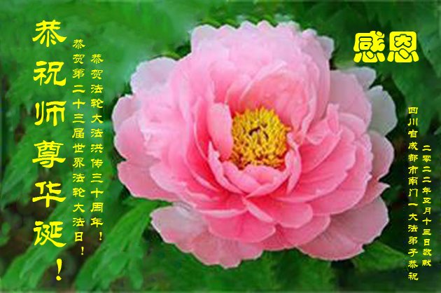 二零二二年五月十三日世界法轮大法日即将到来,我们有缘走上了修炼大法的路,师尊给每个大法弟子净化身体,教诲我们用真善忍标准要求自己。我们感恩师尊!弟子多学法,做事多为别人着想,遇事向内找。做好三件事,多救度有缘的众生。精進、再精進,完成史前大愿。